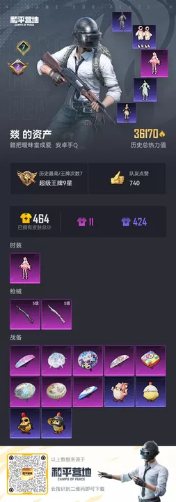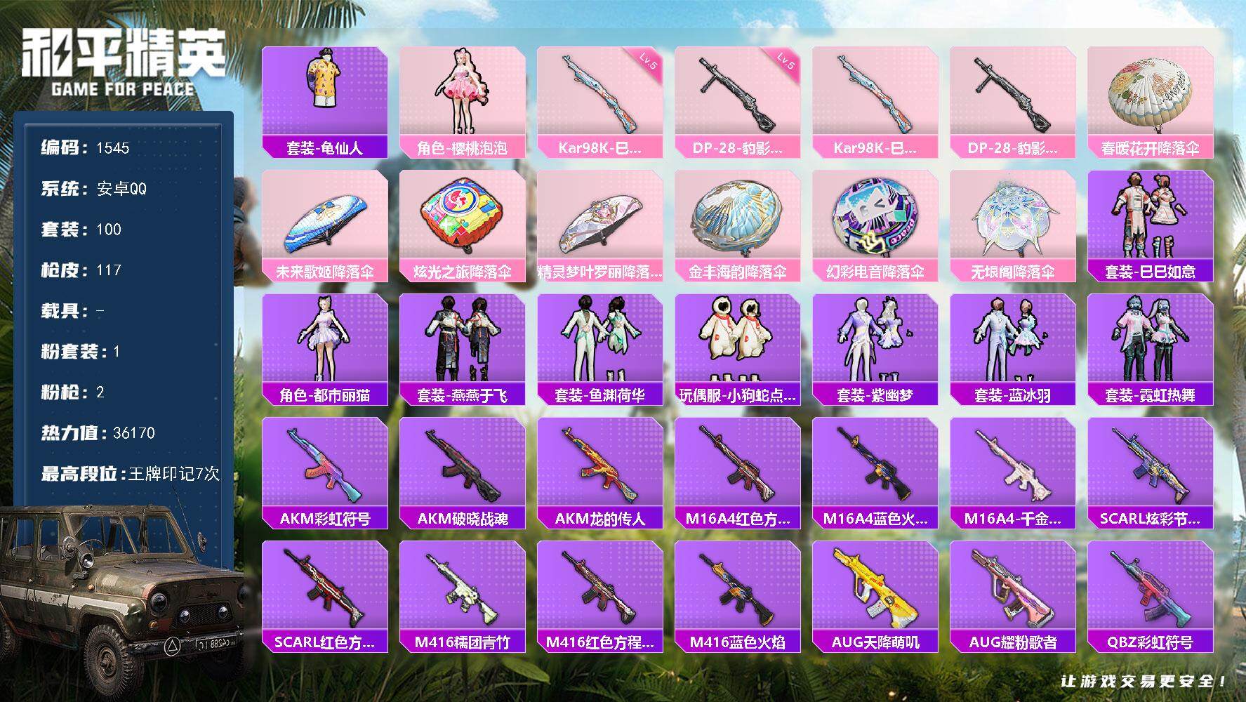[13630809]安卓 手Q-1粉装-2特效枪-0载具-0粉色飞行器-36170热力值-7王牌印记-100套装-117枪皮