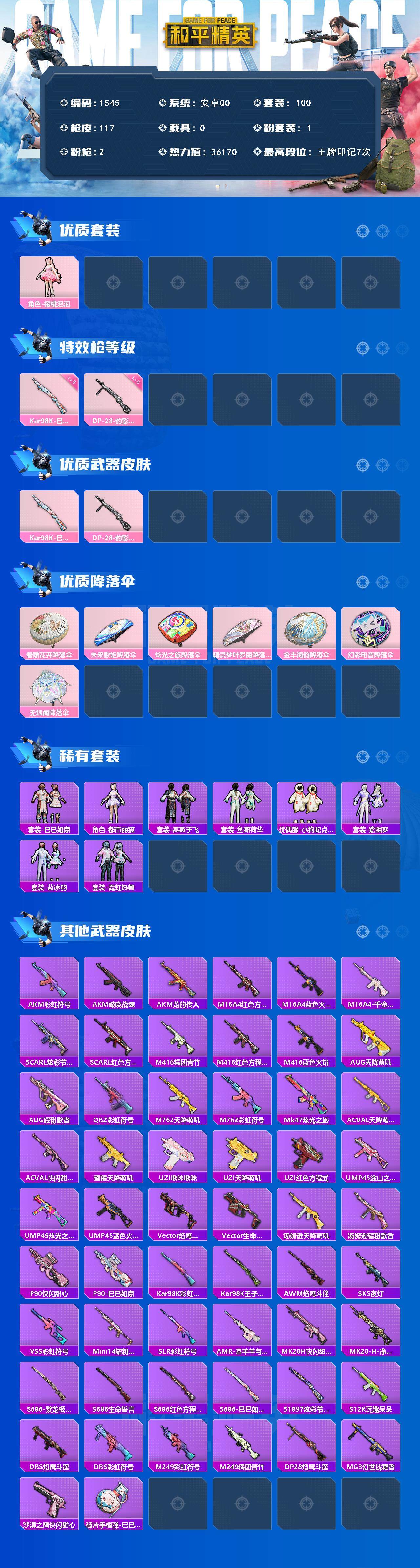 [13630809]安卓 手Q-1粉装-2特效枪-0载具-0粉色飞行器-36170热力值-7王牌印记-100套装-117枪皮 【热门品类】:套装-龟仙人 【粉色套装】:角色-樱桃泡泡 【粉色枪皮等级】:Kar98K-巳巳如意(五级),DP-28-豹影疾电(五级) 【粉色枪皮】:Kar98K-巳巳如意,DP-28-豹影疾电 【粉色降落伞】:春暖花开降落伞,未来歌姬降落伞,炫光之旅降落伞,精灵梦叶罗丽降落伞,金丰海韵降落伞,幻彩电音降落伞,无垠阁降落伞 【稀有套装】:套装-龟仙人,套装-巳巳如意,角色-都市丽猫,套装-燕燕于飞,套装-鱼渊荷华,玩偶服-小狗蛇点点,套装-紫幽梦,套装-蓝冰羽,套装-霓虹热舞 【稀有枪皮】:AKM-彩虹符号,AKM-破晓战魂,AKM-龙的传人,M16A4-红色方程式,M16A4-蓝色火焰,M16A4-千金淑猫,SCAR-L-炫彩节奏,SCAR-L-红色方程式,M416-糯团青竹,M416-红色方程式,M416-蓝色火焰,AUG-天降萌叽,AUG-耀粉歌者,QBZ-彩虹符号,M762-天降萌叽,M762-彩虹符号,Mk47-炫光之旅,AC-VAL-天降萌叽,AC-VAL-快闪甜心,蜜獾-天降萌叽,UZI-啾咪啾咪,UZI-天降萌叽,UZI-红色方程式,UMP45-涂山之恋,UMP45-炫光之旅,UMP45-蓝色火焰,Vector-焰鹰斗篷,Vector-生命誓言,汤姆逊-天降萌叽,汤姆逊-耀粉歌者,P90-快闪甜心,P90-巳巳如意,Kar98K-彩虹符号,Kar98K-王子的夏天,AWM-焰鹰斗篷,SKS-夜灯,VSS-彩虹符号,Mini14-耀粉歌者,SLR-彩虹符号,AMR-喜羊羊与灰太狼,MK20-H-快闪甜心,MK20-H-净心行者,S686-繁龙极客,S686-生命誓言,S686-红色方程式,S686-巳巳如意,S1897-炫彩节奏,S12K-玩趣呆呆,DBS-焰鹰斗篷,DBS-彩虹符号,M249-彩虹符号,M249-糯团青竹,DP-28-焰鹰斗篷,MG3-幻世战舞者,沙漠之鹰-快闪甜心,破片手榴弹-巳巳如意 【其他套装】:套装-SS21特训,套装-SS22特训,套装-SS23特训,套装-SS24特训,套装-SS25特训,套装-SS26特训,套装-SS27特训,套装-SS28特训,套装-SS29特训,套装-人气偶像,套装-冷焰舞者,套装-完美偶像,