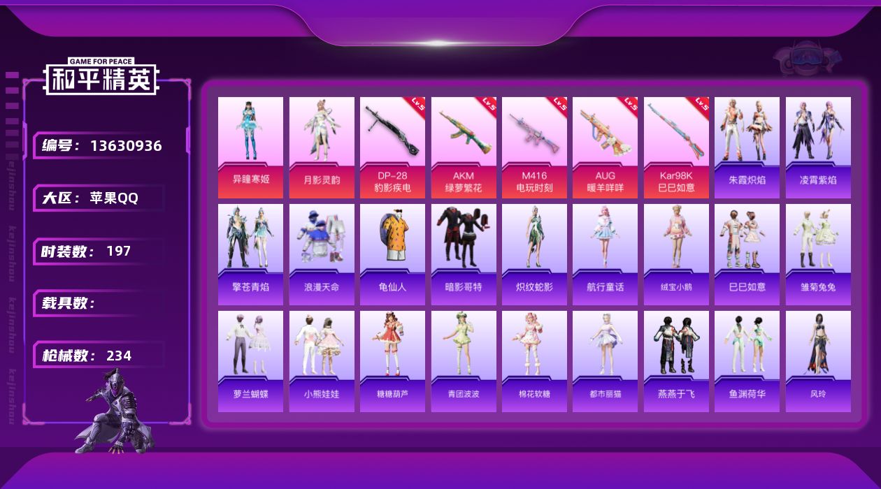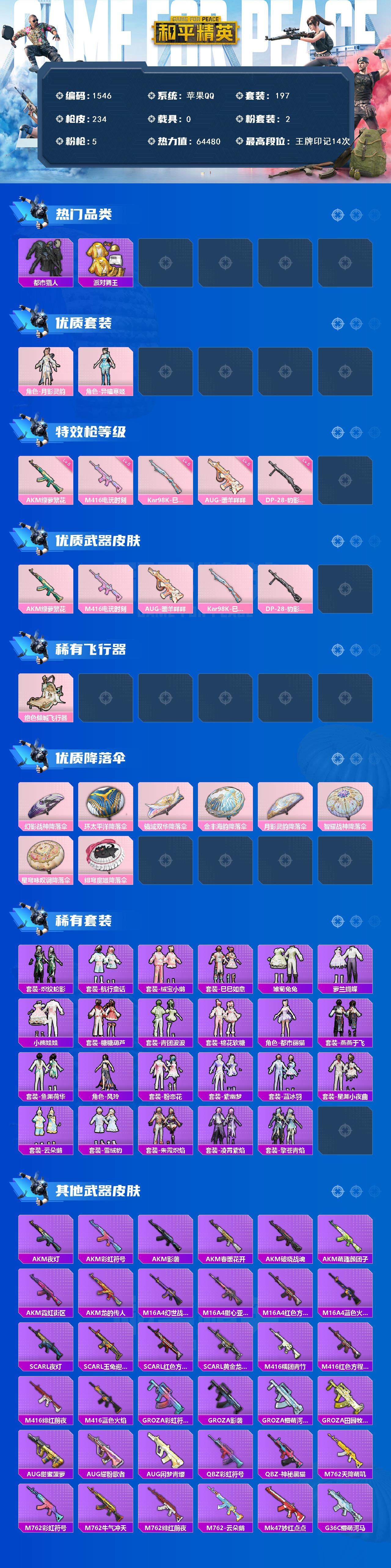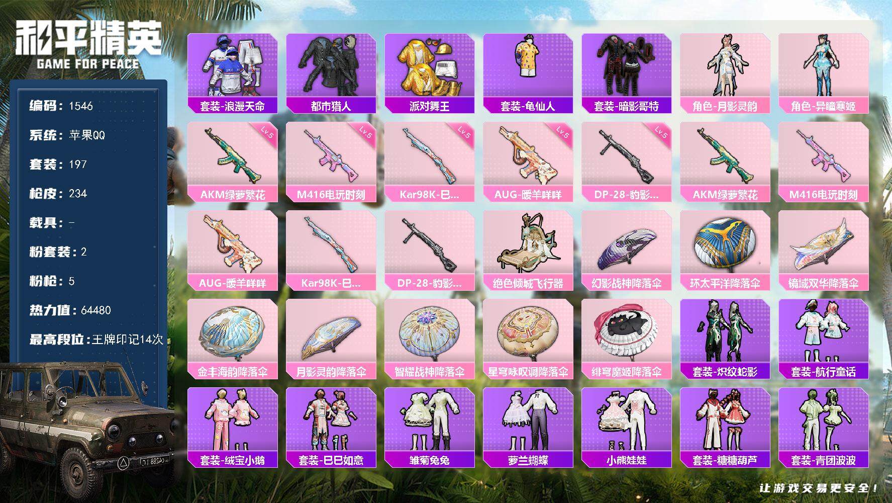 [13630936]苹果 手Q-2粉装-5特效枪-0载具-2粉色飞行器-64480热力值-14王牌印记-197套装-234枪皮 【热门品类】:套装-浪漫天命,套装-都市猎人,套装-派对舞王,套装-龟仙人,套装-暗影哥特 【粉色套装】:角色-月影灵韵,角色-异瞳寒姬 【粉色枪皮等级】:AKM-绿萝繁花(五级),M416-电玩时刻(五级),AUG-暖羊咩咩(五级),Kar98K-巳巳如意(五级),DP-28-豹影疾电(五级) 【粉色枪皮】:AKM-绿萝繁花,M416-电玩时刻,AUG-暖羊咩咩,Kar98K-巳巳如意,DP-28-豹影疾电 【粉色飞行器】:绝色倾城飞行器 【粉色降落伞】:幻影战神降落伞,环太平洋降落伞,镜域双华降落伞,金丰海韵降落伞,月影灵韵降落伞,智耀战神降落伞,星穹咏叹调降落伞,绯穹魔姬降落伞 【稀有套装】:套装-龟仙人,套装-炽纹蛇影,套装-航行童话,套装-绒宝小鹅,套装-巳巳如意,套装-雏菊兔兔,套装-萝兰蝴蝶,套装-小熊娃娃,套装-糖糖葫芦,套装-青团波波,套装-棉花软糖,角色-都市丽猫,套装-燕燕于飞,套装-鱼渊荷华,角色-风玲,套装-粉恋花,套装-紫幽梦,套装-蓝冰羽,套装-星渊小夜曲,套装-云朵鹅,套装-雪绒豹,套装-朱霞炽焰,套装-凌霄紫焰,套装-擎苍青焰 【稀有枪皮】:AKM-夜灯,AKM-彩虹符号,AKM-影袭,AKM-春暖花开,AKM-破晓战魂,AKM-萌趣颜团子,AKM-霓虹街区,AKM-龙的传人,M16A4-幻世战舞者,M16A4-甜心亚梦,M16A4-红色方程式,M16A4-蓝色火焰,SCAR-L-夜灯,SCAR-L-玉兔迎春,SCAR-L-红色方程式,SCAR-L-黄金龙骨,M416-糯团青竹,M416-红色方程式,M416-绯红前夜,M416-蓝色火焰,GROZA-彩虹符号,GROZA-影袭,GROZA-懵萌河马,GROZA-田园牧歌,AUG-甜蜜菠萝,AUG-耀粉歌者,AUG-闲梦青缨,QBZ-彩虹符号,QBZ-神秘黑猫,M762-天降萌叽,M762-彩虹符号,M762-牛气冲天,M762-绯红前夜,M762-云朵鹅,Mk47-妙红点点,G36C-懵萌河马,AC-VAL-快闪甜心,AC-VAL-甜心亚梦,蜜獾-天降萌叽,蜜獾-娇憨猪猪,ARX-凌霄紫焰,UZI-啾咪啾咪,UZI-天降萌叽,UZI-娇憨猪猪,UZI-影袭,UZI-红色方程