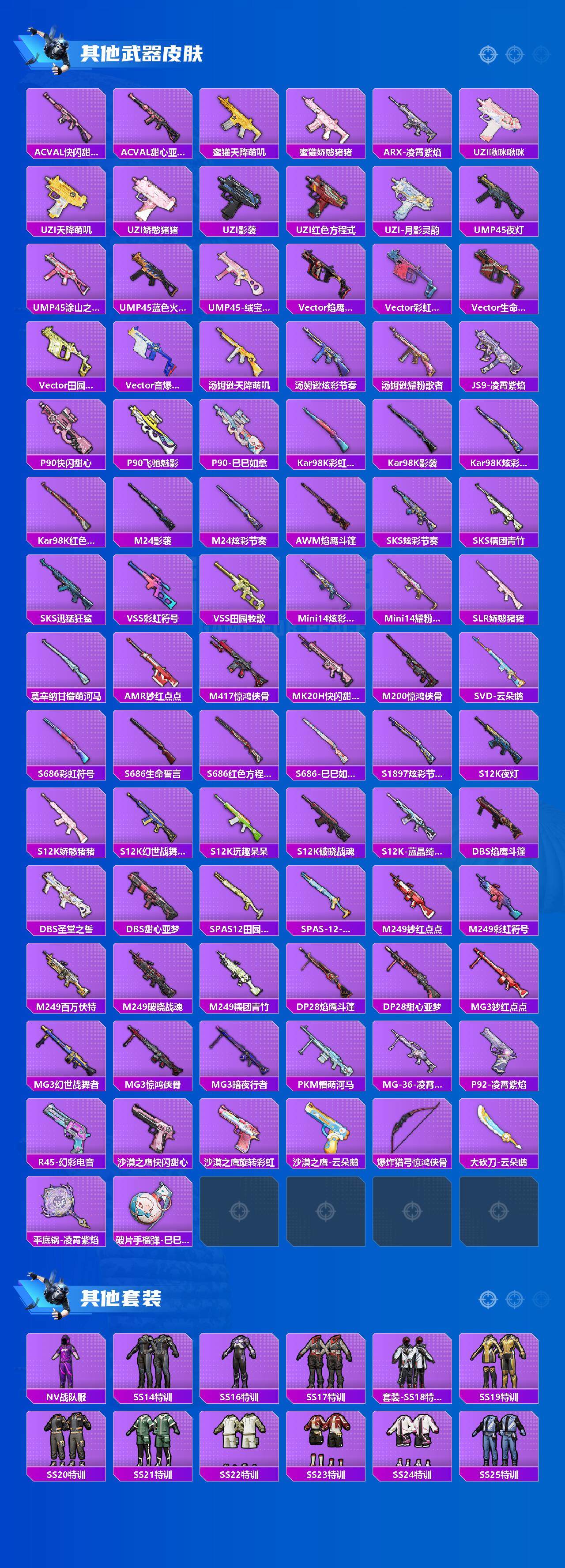 【稀有枪皮】:AKM-夜灯,AKM-彩虹符号,AKM-影袭,AKM-春暖花开,AKM-破晓战魂,AKM-萌趣颜团子,AKM-霓虹街区,AKM-龙的传人,M16A4-幻世战舞者,M16A4-甜心亚梦,M16A4-红色方程式,M16A4-蓝色火焰,SCAR-L-夜灯,SCAR-L-玉兔迎春,SCAR-L-红色方程式,SCAR-L-黄金龙骨,M416-糯团青竹,M416-红色方程式,M416-绯红前夜,M416-蓝色火焰,GROZA-彩虹符号,GROZA-影袭,GROZA-懵萌河马,GROZA-田园牧歌,AUG-甜蜜菠萝,AUG-耀粉歌者,AUG-闲梦青缨,QBZ-彩虹符号,QBZ-神秘黑猫,M762-天降萌叽,M762-彩虹符号,M762-牛气冲天,M762-绯红前夜,M762-云朵鹅,Mk47-妙红点点,G36C-懵萌河马,AC-VAL-快闪甜心,AC-VAL-甜心亚梦,蜜獾-天降萌叽,蜜獾-娇憨猪猪,ARX-凌霄紫焰,UZI-啾咪啾咪,UZI-天降萌叽,UZI-娇憨猪猪,UZI-影袭,UZI-红色方程