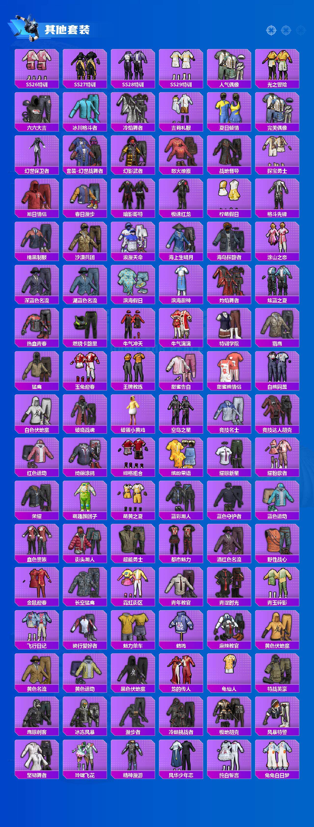 【稀有套装】:套装-龟仙人,套装-炽纹蛇影,套装-航行童话,套装-绒宝小鹅,套装-巳巳如意,套装-雏菊兔兔,套装-萝兰蝴蝶,套装-小熊娃娃,套装-糖糖葫芦,套装-青团波波,套装-棉花软糖,角色-都市丽猫,套装-燕燕于飞,套装-鱼渊荷华,角色-风玲,套装-粉恋花,套装-紫幽梦,套装-蓝冰羽,套装-星渊小夜曲,套装-云朵鹅,套装-雪绒豹,套装-朱霞炽焰,套装-凌霄紫焰,套装-擎苍青焰