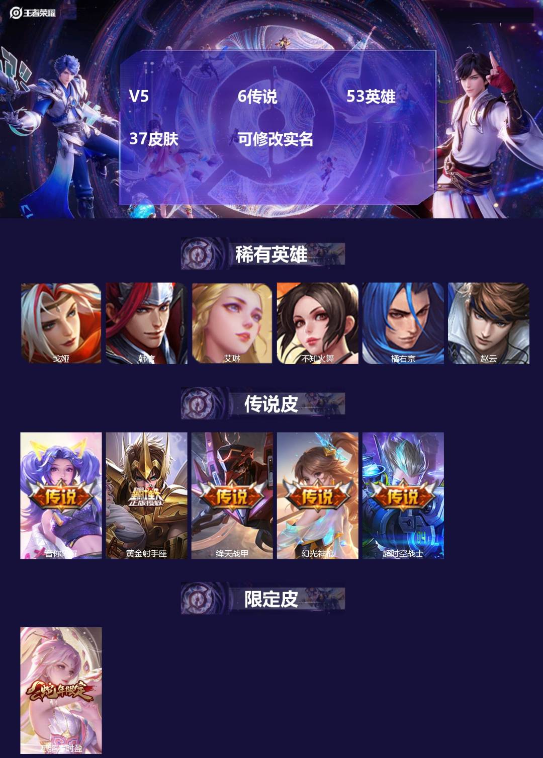 [11853478]V5 6传说 53英雄 37皮肤 可修改实名 【稀有英雄】:韩信(韩跳跳),艾琳,橘右京(橘子),不知火舞,赵云,戈娅 【传说皮】:幻光神枪,黄金射手座,绛天战甲(鸡嘴战神),超时空战士-狄仁杰,音你闪耀(rap皮) 【史诗皮】:女仆咖啡,水果甜心,魅力维加斯 【限定皮】:愿照·岁时盈(虞姬年限) 【普通皮】:谧流熔炉,街头霸王,雪境奇遇-西施,死霸装,春野闲踪,景韶洛都,玫蓝誓约,虚灵犬护,浪漫序章,灵野札记,布丁狗之约,命运加冕,海滩派对,皇家上将,黄金武士,星际陆战队(程咬金),阴阳师,死亡骑士,忍·炎影,救世之瞳,冰雪圆舞曲,孤猎,伊势巫女,花见巫女,加勒比小姐,启蛰,西部大镖客-孙悟空,潮玩牛仔