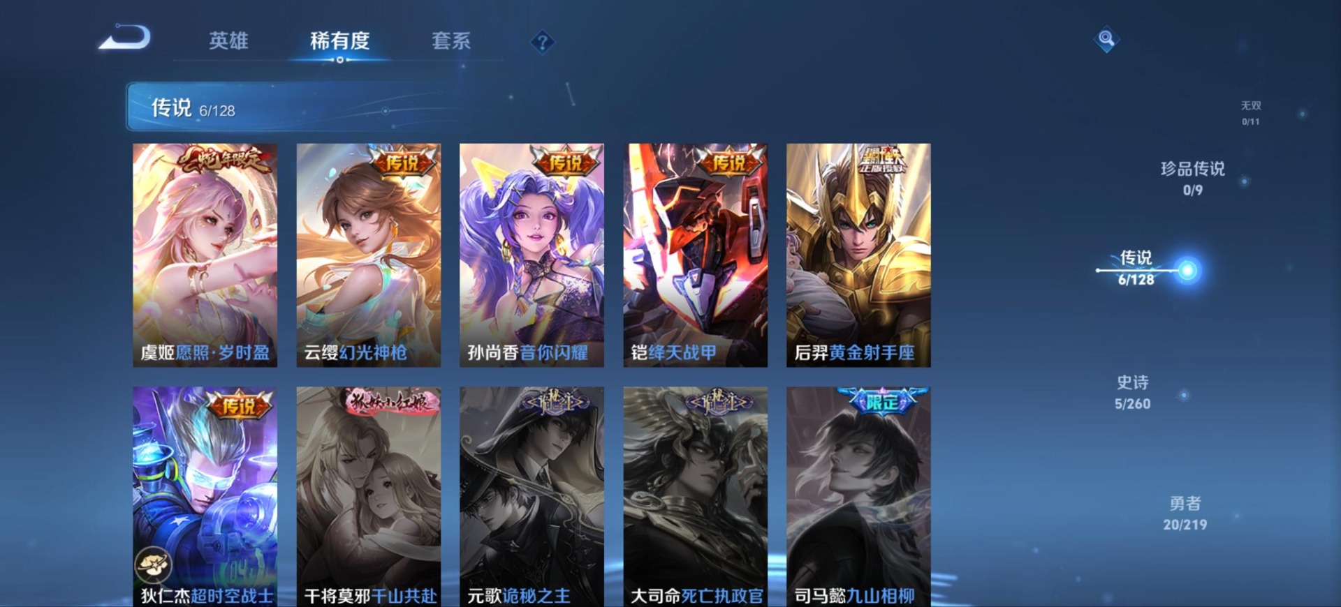- [11853271]V6 4传说 124英雄 199皮肤 可修改实名 优质装备:地狱火,胖达荣荣 珍宝阁皮:蔷薇恋人,女武神 限定皮:愿照·众生和(妲己年限),鸣野蒿,飞衡(韩信年限),遇见飞天,梁祝,冰霜恋舞曲 史诗皮:鸭鸭历险记-刘禅,器灵·浮梦炉,化蝶舞,龙之律动,茶境仙,破空之剑,蒙犽顽岩魄,百相守梦-百里守约,紫霞仙子,千年之狐,魅语,偶像歌手,白蛇,猫狗日记-孙策,乱世虎臣,修罗,女仆咖啡,水果甜心,绅士熊喵,天才门将,星夜王子,心灵骇客,功夫厨神,德古拉伯爵,纤云弄巧,繁星吟游(呼啦呼啦),缤纷独角兽,箭羽风息,金属风暴,圣诞恋歌,鹰眼统帅,黎明之约,无心,未来纪元-赵云