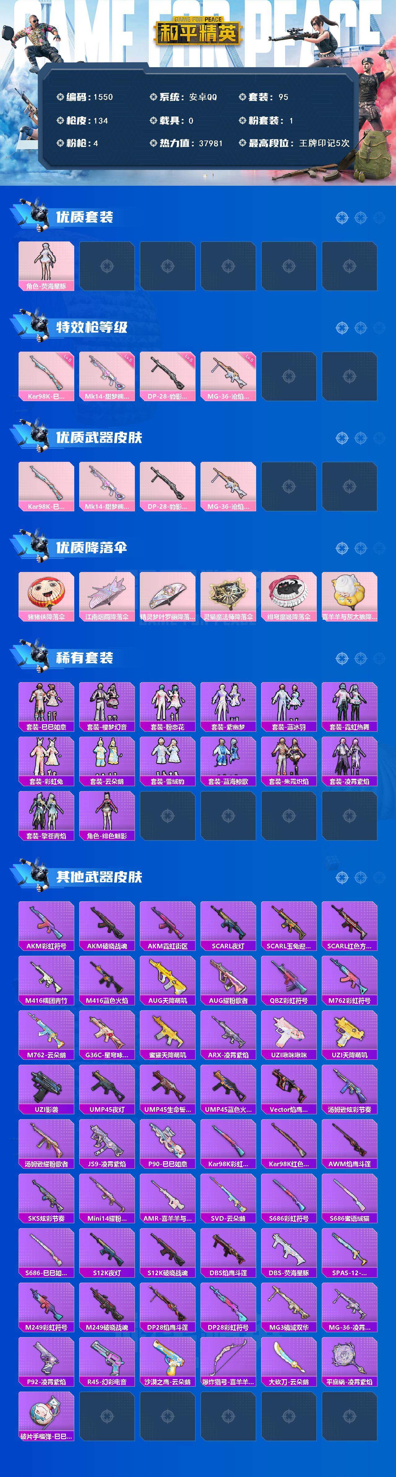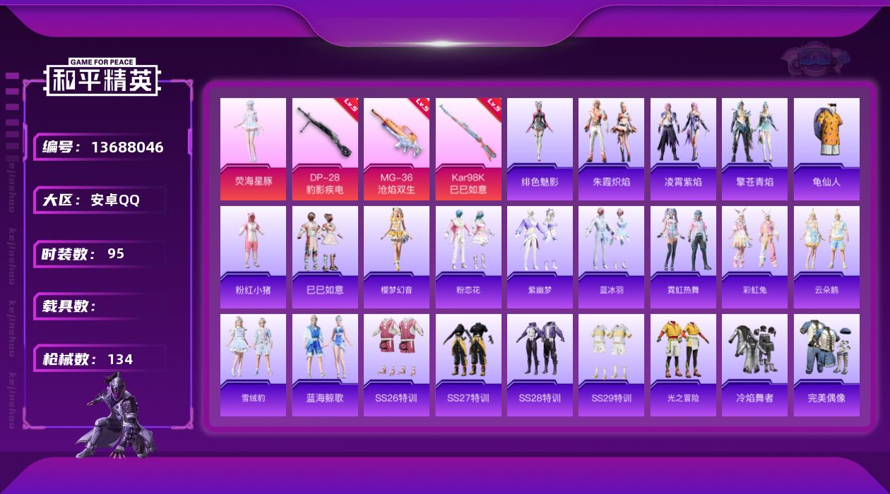[13688046]安卓 手Q-1粉装-4特效枪-0载具-1粉色飞行器-37981热力值-5王牌印记-95套装-134枪皮 【热门品类】:套装-龟仙人,套装-粉红小猪 【粉色套装】:角色-荧海星豚 【粉色枪皮等级】:Kar98K-巳巳如意(五级),Mk14-甜梦熊击(五级),DP-28-豹影疾电(五级),MG-36-沧焰双生(五级) 【粉色枪皮】:Kar98K-巳巳如意,Mk14-甜梦熊击,DP-28-豹影疾电,MG-36-沧焰双生 【粉色降落伞】:猪猪侠降落伞,江南烟雨降落伞,精灵梦叶罗丽降落伞,灵猫魔法师降落伞,绯穹魔姬降落伞,喜羊羊与灰太狼降落伞 【稀有套装】:套装-龟仙人,套装-巳巳如意,套装-樱梦幻音,套装-粉恋花,套装-紫幽梦,套装-蓝冰羽,套装-霓虹热舞,套装-彩虹兔,套装-云朵鹅,套装-雪绒豹,套装-蓝海鲸歌,套装-朱霞炽焰,套装-凌霄紫焰,套装-擎苍青焰,角色-绯色魅影 【稀有枪皮】:AKM-彩虹符号,AKM-破晓战魂,AKM-霓虹街区,SCAR-L-夜灯,SCAR-L-玉兔迎春,SCAR-L-红色方程式,M416-糯团青竹,M416-蓝色火焰,AUG-天降萌叽,AUG-耀粉歌者,QBZ-彩虹符号,M762-彩虹符号,M762-云朵鹅,G36C-星穹咏叹调,蜜獾-天降萌叽,ARX-凌霄紫焰,UZI-啾咪啾咪,UZI-天降萌叽,UZI-影袭,UMP45-夜灯,UMP45-生命誓言,UMP45-蓝色火焰,Vector-焰鹰斗篷,汤姆逊-炫彩节奏,汤姆逊-耀粉歌者,JS9-凌霄紫焰,P90-巳巳如意,Kar98K-彩虹符号,Kar98K-红色方程式,AWM-焰鹰斗篷,SKS-炫彩节奏,Mini14-耀粉歌者,AMR-喜羊羊与灰太狼,SVD-云朵鹅,S686-蜜语绒猫,S686-彩虹符号,S686-巳巳如意,S12K-破晓战魂,S12K-夜灯,DBS-焰鹰斗篷,DBS-荧海星豚,SPAS-12-云朵鹅,M249-彩虹符号,M249-破晓战魂,DP-28-焰鹰斗篷,DP-28-彩虹符号,MG3-镜域双华,MG-36-凌霄紫焰,P92-凌霄紫焰,R45-幻彩电音,沙漠之鹰-云朵鹅,爆炸猎弓-喜羊羊与灰太狼,大砍刀-云朵鹅,平底锅-凌霄紫焰,破片手榴弹-巳巳如意 【其他套装】:套装-SS26特训,套装-SS27特训,套装-SS28特训,套装-SS29特训,套装-光之冒险,套装-冷