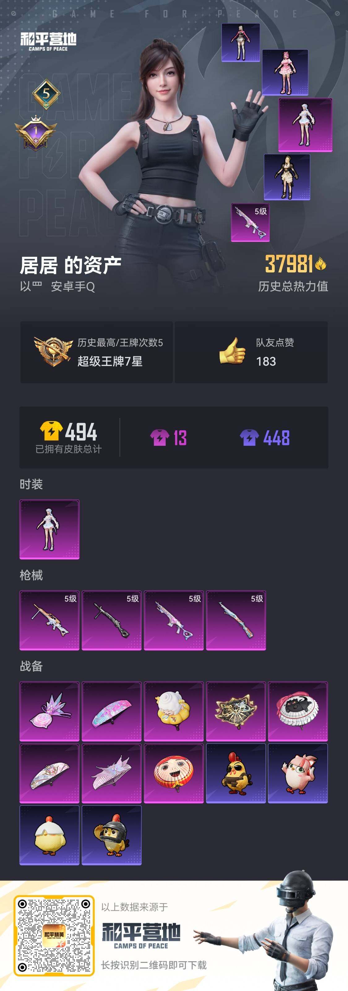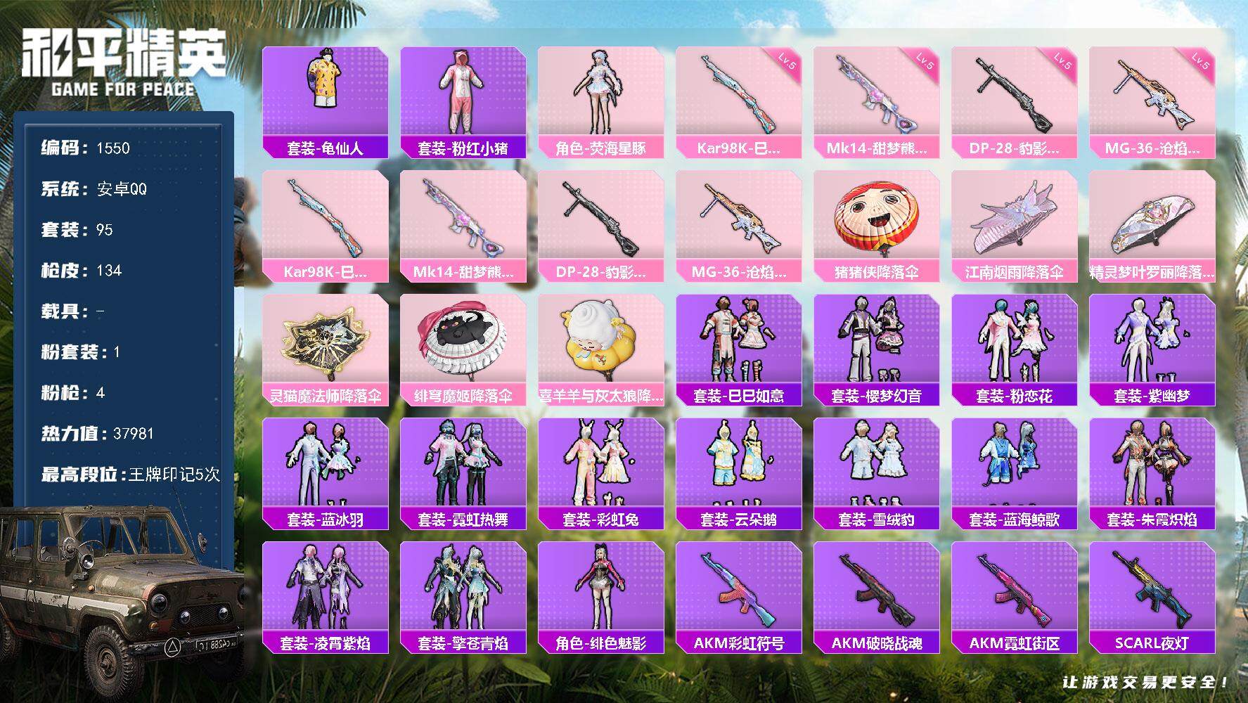 [13688046]安卓 手Q-1粉装-4特效枪-0载具-1粉色飞行器-37981热力值-5王牌印记-95套装-134枪皮