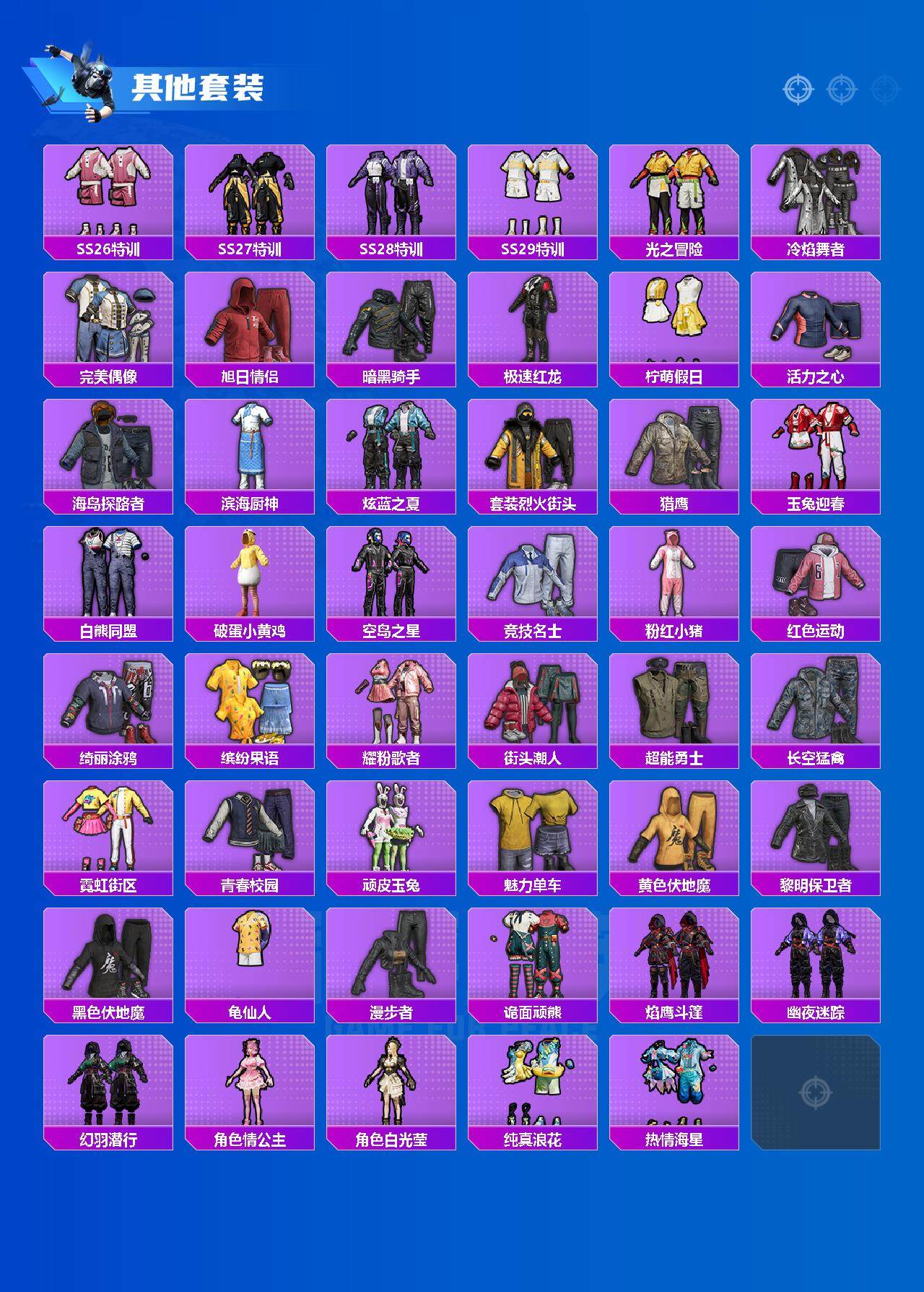 【稀有套装】:套装-龟仙人,套装-巳巳如意,套装-樱梦幻音,套装-粉恋花,套装-紫幽梦,套装-蓝冰羽,套装-霓虹热舞,套装-彩虹兔,套装-云朵鹅,套装-雪绒豹,套装-蓝海鲸歌,套装-朱霞炽焰,套装-凌霄紫焰,套装-擎苍青焰,角色-绯色魅影