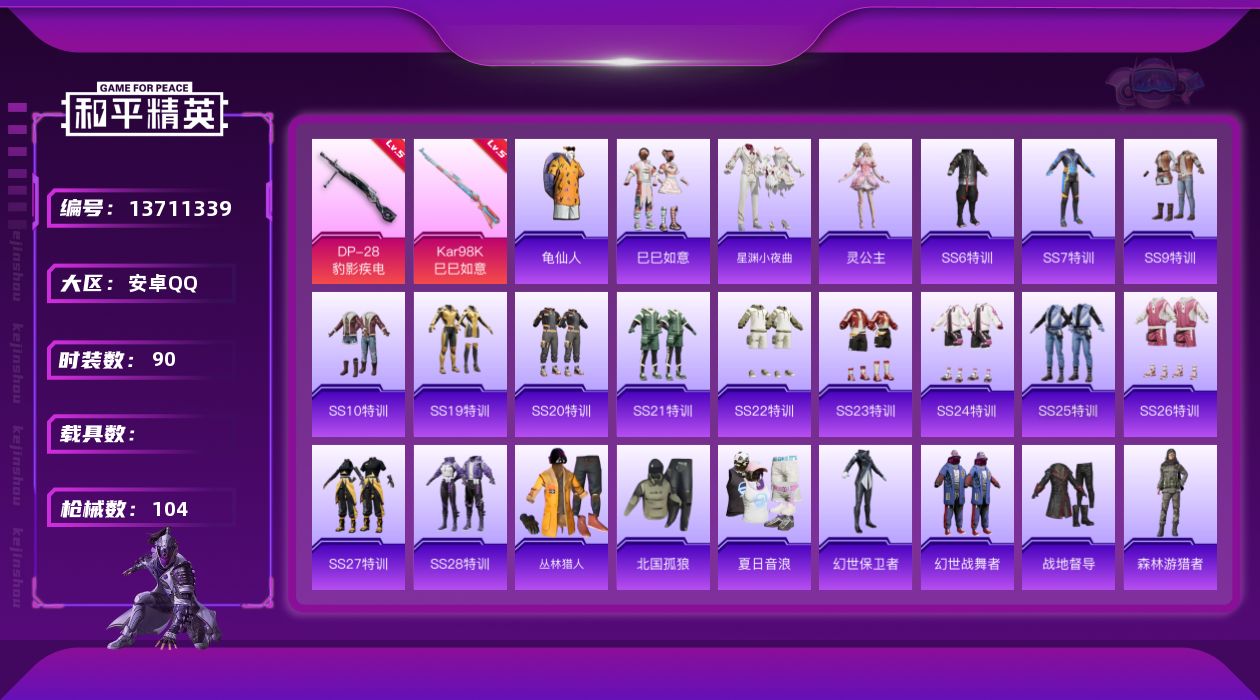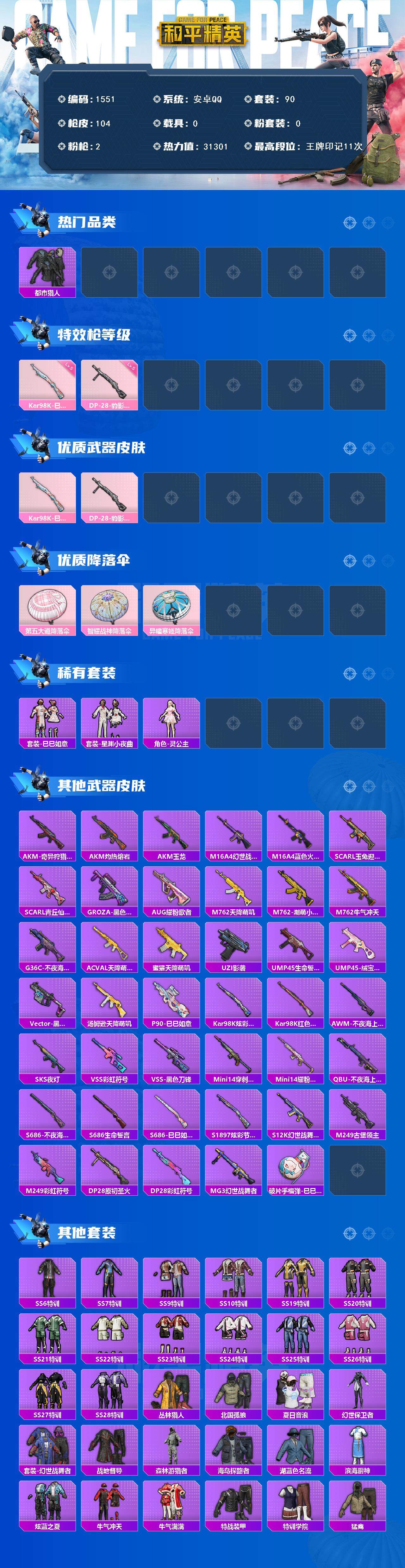 [13711339]安卓 手Q-0粉装-2特效枪-0载具-1粉色飞行器-31301热力值-11王牌印记-90套装-104枪皮 【热门品类】:套装-都市猎人,套装-龟仙人 【粉色枪皮等级】:Kar98K-巳巳如意(五级),DP-28-豹影疾电(五级) 【粉色枪皮】:Kar98K-巳巳如意,DP-28-豹影疾电 【粉色降落伞】:第五大道降落伞,智耀战神降落伞,异瞳寒姬降落伞 【稀有套装】:套装-龟仙人,套装-巳巳如意,套装-星渊小夜曲,角色-灵公主 【稀有枪皮】:AKM-奇异狩猎者,AKM-灼热熔岩,AKM-玉龙,M16A4-幻世战舞者,M16A4-蓝色火焰,SCAR-L-玉兔迎春,SCAR-L-青丘仙客,GROZA-黑色刀锋,AUG-耀粉歌者,M762-天降萌叽,M762-潮萌小黄鸭,M762-牛气冲天,G36C-不夜海上花,AC-VAL-天降萌叽,蜜獾-天降萌叽,UZI-影袭,UMP45-生命誓言,UMP45-绒宝小鹅,Vector-黑色刀锋,汤姆逊-天降萌叽,P90-巳巳如意,Kar98K-炫彩节奏,Kar98K-红色方程式,AWM-不夜海上花,SKS-夜灯,VSS-彩虹符号,VSS-黑色刀锋,Mini14-穿刺龙虾,Mini14-耀粉歌者,QBU-不夜海上花,S686-不夜海上花,S686-生命誓言,S686-巳巳如意,S1897-炫彩节奏,S12K-幻世战舞者,M249-古堡领主,M249-彩虹符号,DP-28-原初圣火,DP-28-彩虹符号,MG3-幻世战舞者,破片手榴弹-巳巳如意 【其他套装】:套装-SS6特训,套装-SS7特训,套装-SS9特训,套装-SS10特训,套装-SS19特训,套装-SS20特训,套装-SS21特训,套装-SS22特训,套装-SS23特训,套装-SS24特训,套装-SS25特训,套装-SS26特训,套装-SS27特训,套装-SS28特训,套装-丛林猎人,套装-北国孤狼,套装-夏日音浪,套装-幻世保卫者,套装-幻世战舞者,套装-战地督导,套装-森林游猎者,套装-海岛探路者,套装-湖蓝色名流,套装-滨海厨神,套装-炫蓝之夏,套装-牛气冲天,套装-牛气满满,套装-特战装甲,套装-特训学院,套装-猛禽,套装-玉兔迎春,套装-王牌教练,套装-甜蜜告白,套装-疯狂小兔子,套装-白色伏地魔,套装-破蛋小黄鸡,套装-竞技勇士朋克,套装-竞技名士,套装-红色运动,套