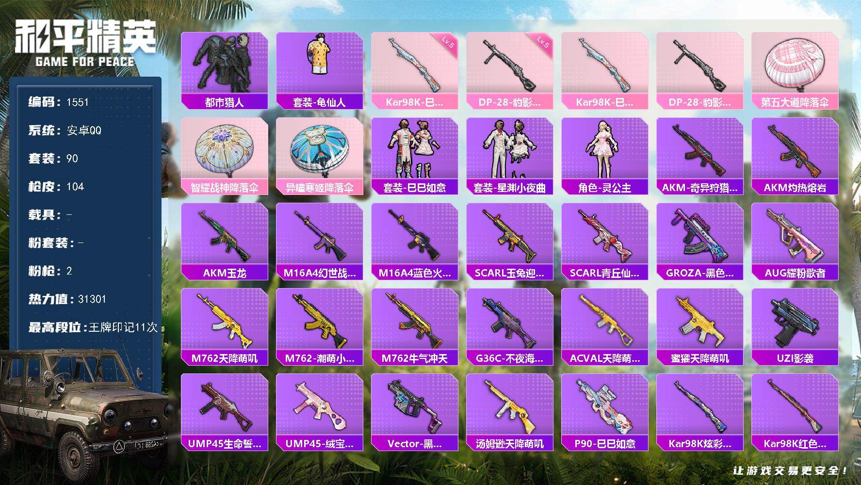 [13711339]安卓 手Q-0粉装-2特效枪-0载具-1粉色飞行器-31301热力值-11王牌印记-90套装-104枪皮