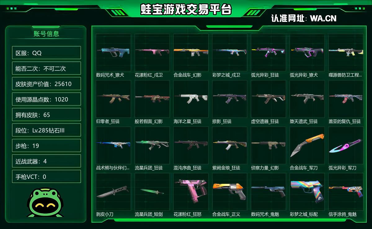 QQ 不可二次 皮肤资产价值25610 使用源晶点数1020 拥有皮肤65 段位Lv.285钻石III 步枪19 近战武器4 手枪VCT0 手枪19 狙击枪7 套装0 霰弹枪2 机枪3 冲锋枪6 英雄27 热门卡面8 热门挂饰18
