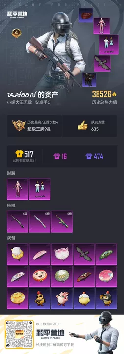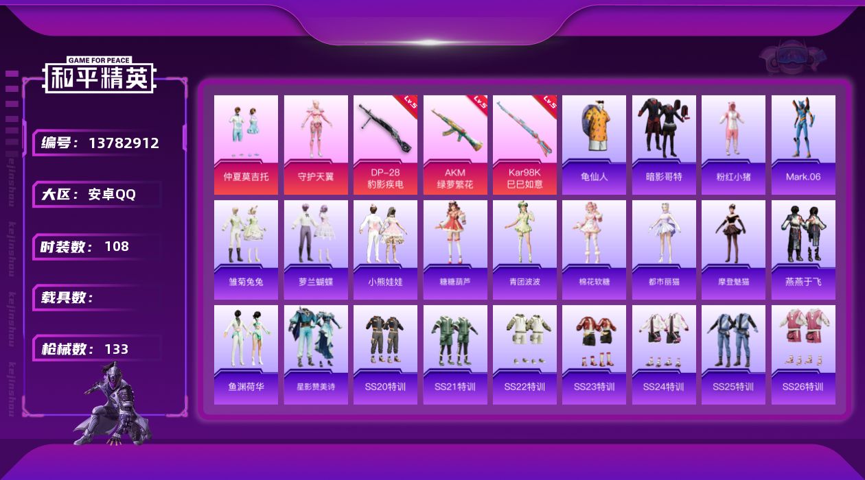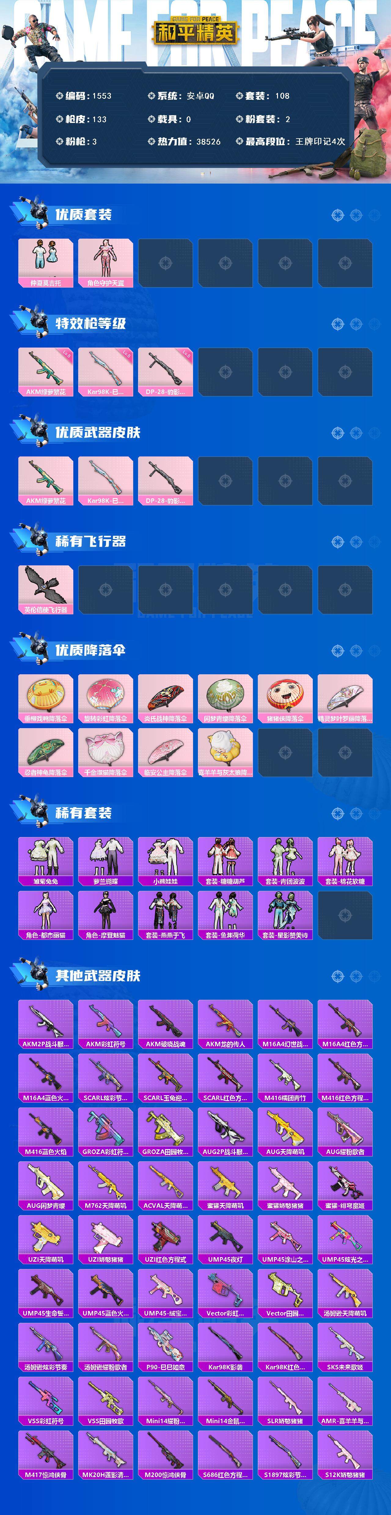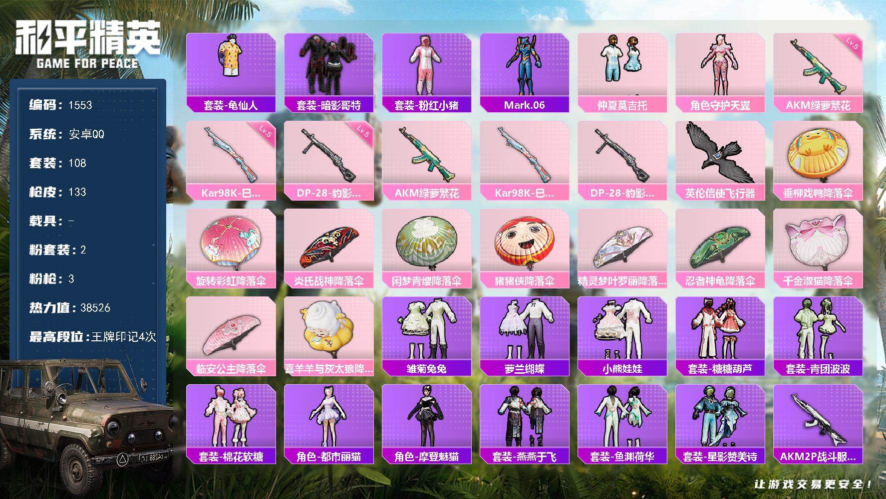 [13782912]安卓 手Q-2粉装-3特效枪-0载具-1粉色飞行器-38526热力值-4王牌印记-108套装-133枪皮 【热门品类】:套装-龟仙人,套装-暗影哥特,套装-粉红小猪,角色-Mark.06 【粉色套装】:粉装-仲夏莫吉托,角色-守护天翼 【粉色枪皮等级】:AKM-绿萝繁花(五级),Kar98K-巳巳如意(五级),DP-28-豹影疾电(五级) 【粉色枪皮】:AKM-绿萝繁花,Kar98K-巳巳如意,DP-28-豹影疾电 【粉色飞行器】:英伦信使飞行器 【粉色降落伞】:垂柳戏鸭降落伞,旋转彩虹降落伞,炎氏战神降落伞,闲梦青缨降落伞,猪猪侠降落伞,精灵梦叶罗丽降落伞,忍者神龟降落伞,千金淑猫降落伞,临安公主降落伞,喜羊羊与灰太狼降落伞 【稀有套装】:套装-龟仙人,套装-雏菊兔兔,套装-萝兰蝴蝶,套装-小熊娃娃,套装-糖糖葫芦,套装-青团波波,套装-棉花软糖,角色-都市丽猫,角色-摩登魅猫,套装-燕燕于飞,套装-鱼渊荷华,套装-星影赞美诗 【稀有枪皮】:AKM-2P战斗服款,AKM-彩虹符号,AKM-破晓战魂,AKM-龙的传人,M16A4-幻世战舞者,M16A4-红色方程式,M16A4-蓝色火焰,SCAR-L-炫彩节奏,SCAR-L-玉兔迎春,SCAR-L-红色方程式,M416-糯团青竹,M416-红色方程式,M416-蓝色火焰,GROZA-彩虹符号,GROZA-田园牧歌,AUG-2P战斗服款,AUG-天降萌叽,AUG-耀粉歌者,AUG-闲梦青缨,M762-天降萌叽,AC-VAL-天降萌叽,蜜獾-天降萌叽,蜜獾-娇憨猪猪,蜜獾-绯穹魔姬,UZI-天降萌叽,UZI-娇憨猪猪,UZI-红色方程式,UMP45-夜灯,UMP45-涂山之恋,UMP45-炫光之旅,UMP45-生命誓言,UMP45-蓝色火焰,UMP45-绒宝小鹅,Vector-彩虹符号,Vector-田园牧歌,汤姆逊-天降萌叽,汤姆逊-炫彩节奏,汤姆逊-耀粉歌者,P90-巳巳如意,Kar98K-影袭,Kar98K-红色方程式,SKS-未来歌姬,VSS-彩虹符号,VSS-田园牧歌,Mini14-耀粉歌者,Mini14-金鼠迎春,SLR-娇憨猪猪,AMR-喜羊羊与灰太狼,M417-惊鸿侠骨,MK20-H-莲影清波,M200-惊鸿侠骨,S686-红色方程式,S1897-炫彩节奏,S12K-玩趣呆呆,S12K-破晓战魂,S12