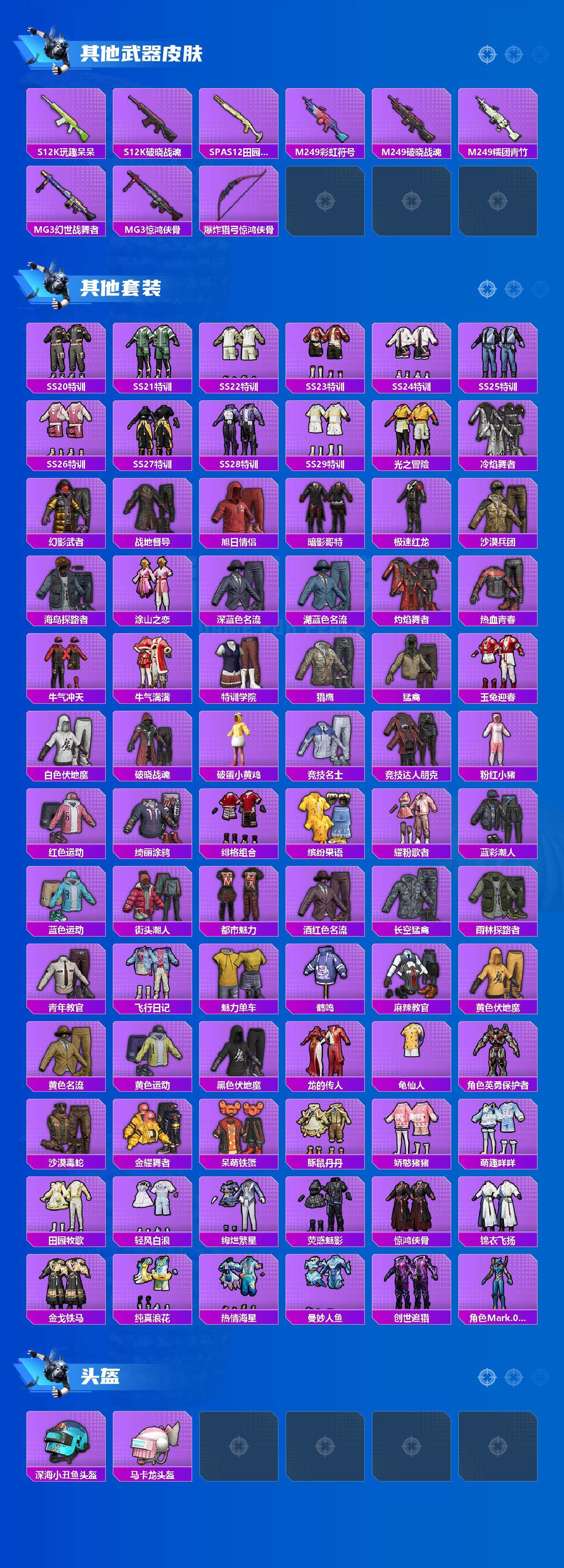 - [11349096]11粉装 5特效枪 1载具 8印记 可二次 可修改实名 身法装备:赤蝎幽灵,都市猎人,舞王派对(派对舞王、小金鞋),暗影哥特(红眼罩) 优质装备:永恒黄蜂,舞王派对(派对舞王、小金鞋),赤蝎幽灵,都市猎人,梦幻火箭(新101)(新火箭少女101粉色套装),极限特训,天使彩虹糖,M416风花雪月,洛天依,M762苔丝玫瑰,SCAR-L-锦绣绵绵,七级M762-苔丝玫瑰,七级M416-风花雪月,女娲灵识,雪月幻音,Kar98K-巳巳如意 热门装扮:焦糖拿铁,桃夭倾城,光明术士,炫光之旅,暖暖奶龙,迅捷狂鲨,鹰眼刺客,呆萌铁蟹,深海小丑鱼,东方飞龙,都市猎人,派对舞王(小金鞋),赤蝎幽灵 稀有枪皮:DP-28-豹影疾电 五级特效枪:五级Kar98K-巳巳如意,五级DP-28-豹影疾电,五级SCAR-L-锦绣绵绵 紫色装扮:星夜迷魅,琉璃情波,田园牧歌,轻风白浪,SS22特训,莱茵河畔,SS23特训,幻彩翩翩,娇憨猪猪,萌趣咩咩,SS21特训,极光玫瑰,艾菲玫瑰,绚烂繁星,SS31特训套装,千禧之恋,旭日情侣,SS33特训套装,青涩时光,顶瓜瓜,冰爽风暴,音速流光,SS19特训,吉莉礼服,电音精灵,瑞龙福将,团圆交子,SS17特训,魔力冰咖,异彩先驱,SS18特训,都市漫游者,长空猛禽,雪鹰学院,霓虹极客,霓虹街区,青年教官,迎春赐吉,缤纷果语,魅力单车,麻辣教官,黄色伏地魔,黄色运动,黑色伏地魔,龙的传人,龟仙人,龙魂突击队,极地朋克,海岛探路者,深蓝色名流,夏日倾情,湖蓝色名流,绮丽涂鸦,空岛之星,空投萌叽,王牌教练,牛气冲天,白光莹,SS28特训,卖崽青蛙,李逍遥,冰公主,异域银装,鱼渊荷华,玉兔迎春,燕燕于飞,竞技名士,暗影哥特(红眼罩),深海梦境,惊鸿侠骨,SS25特训,金戈铁马,锦衣飞扬,焰鹰斗篷,幻羽潜行,幽夜迷踪,SS27特训,无暇誓言,金羽特工,浪漫天命,日照花林,SS26特训,春光漫游,快闪甜心,贝斯之夜,智谋强哥,晶辉守护,摩艾涂鸦,奇趣章鱼,星谷精灵,耀粉歌者,粉恋花,蓝冰羽,紫幽梦,SS32特训服(SS32特训套装),瑰梦爱神,绯格组合,蜜桃派对,新风雅兰,恋语绒绒,漫步者,冷酷挑战者,冰冻风暴,弄潮海豚,光之冒险 优质战备:圣堂之誓降落伞,萌物绒绒飞行器,鬼刀降落伞,金蛇镇世降落伞,赛博古神降落伞,智耀战神降落伞,樱桃泡泡降落伞,极限特训降落