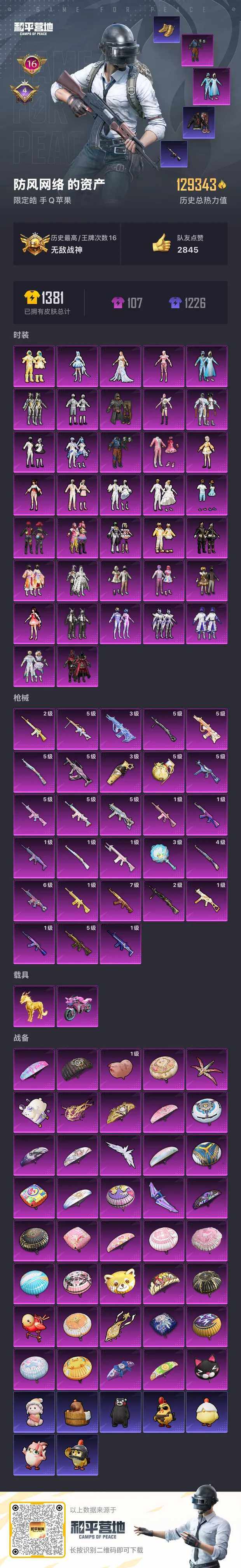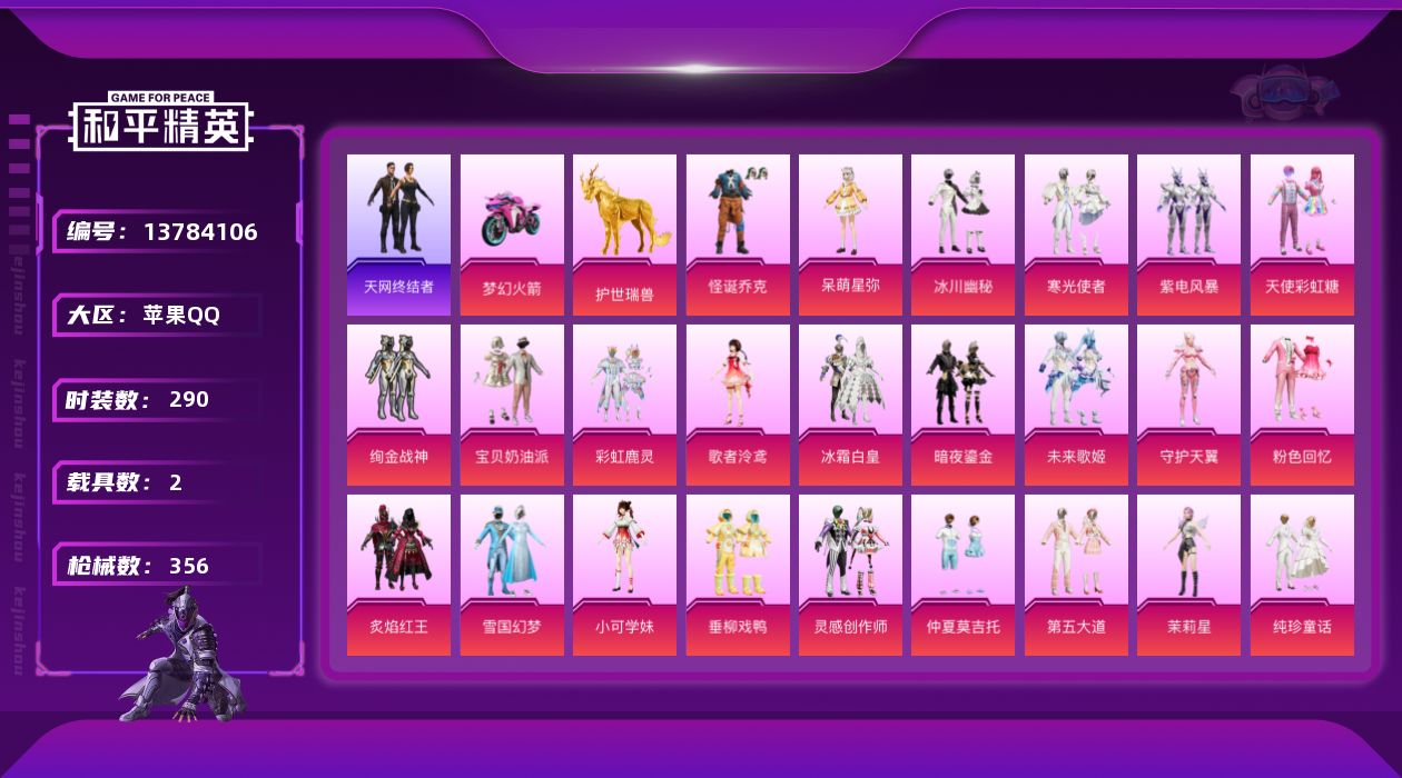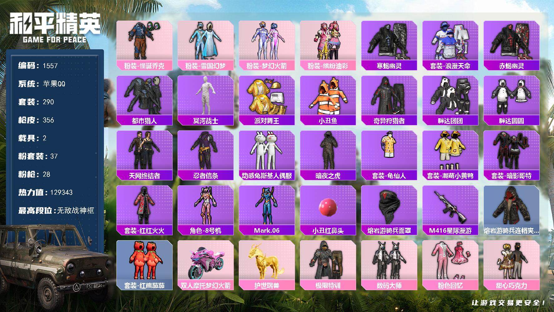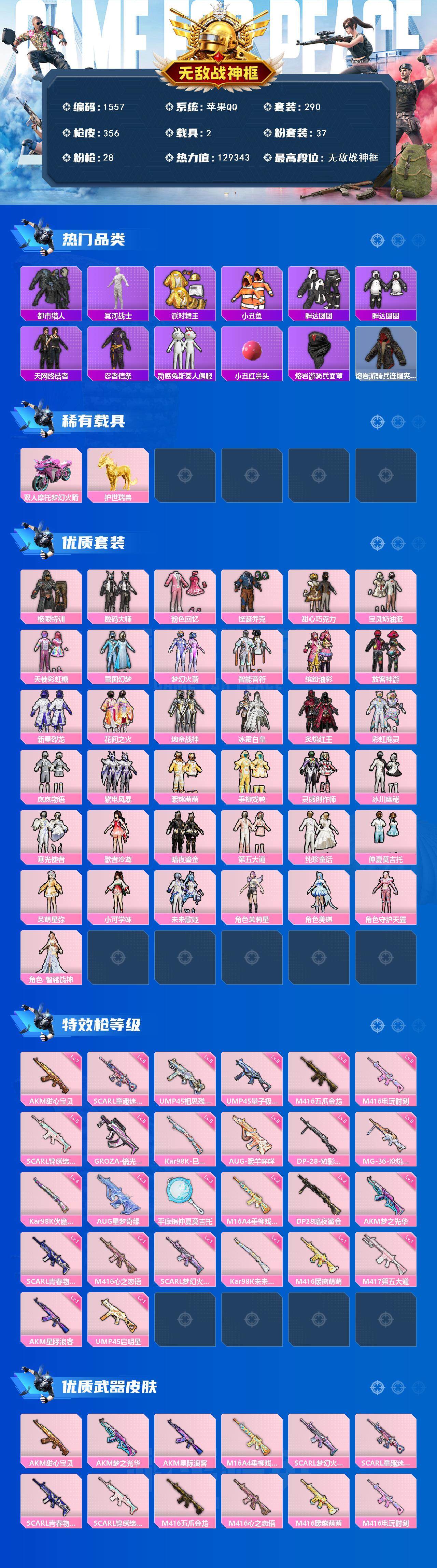 [13784106]苹果 手Q-无敌战神框-37粉装-28特效枪-2载具-8粉色飞行器-129343热力值-16王牌印记-290套装-356枪皮