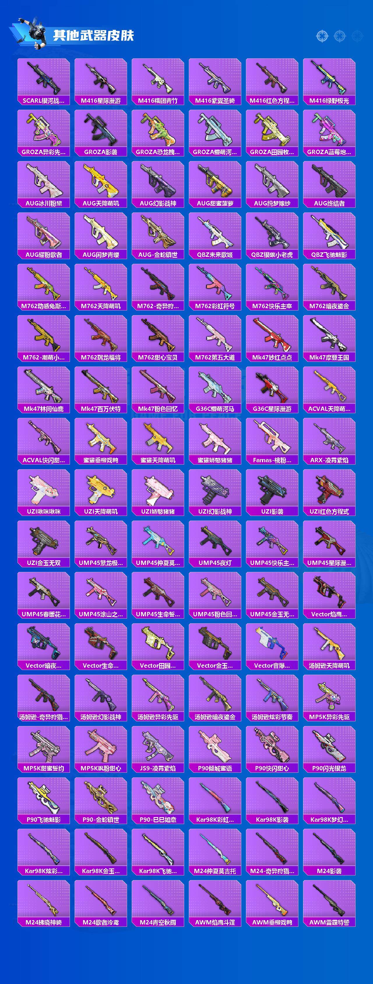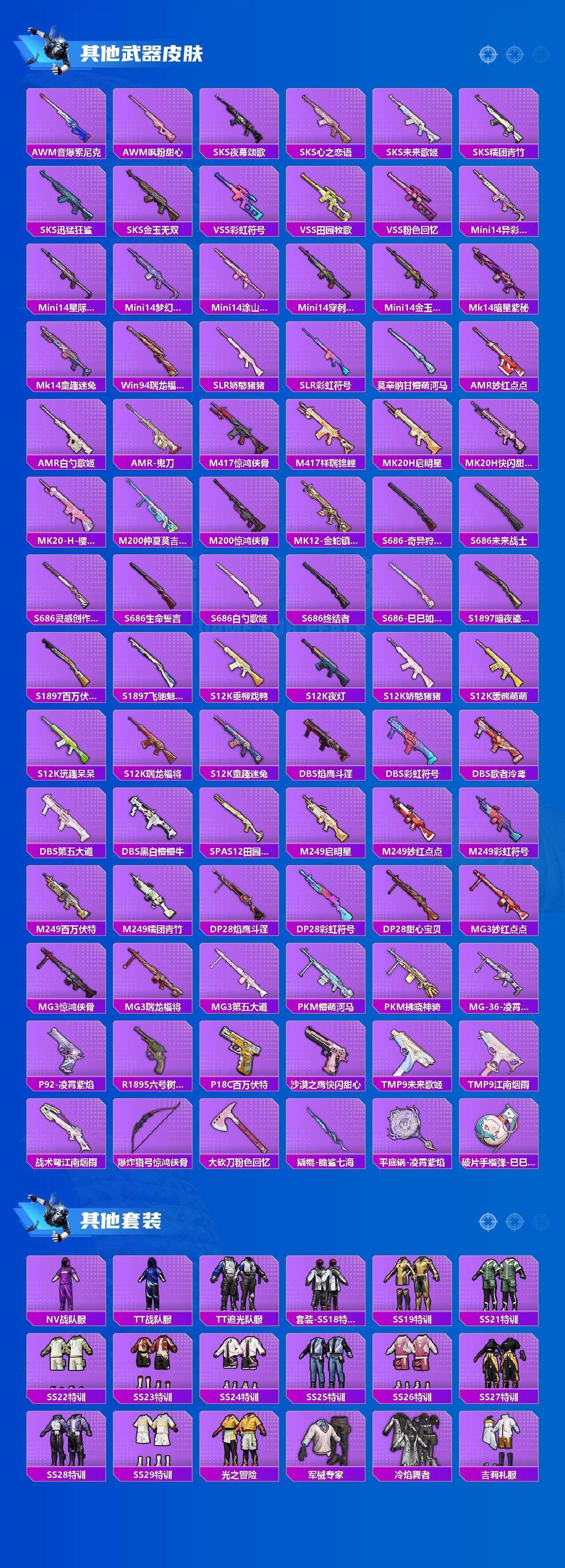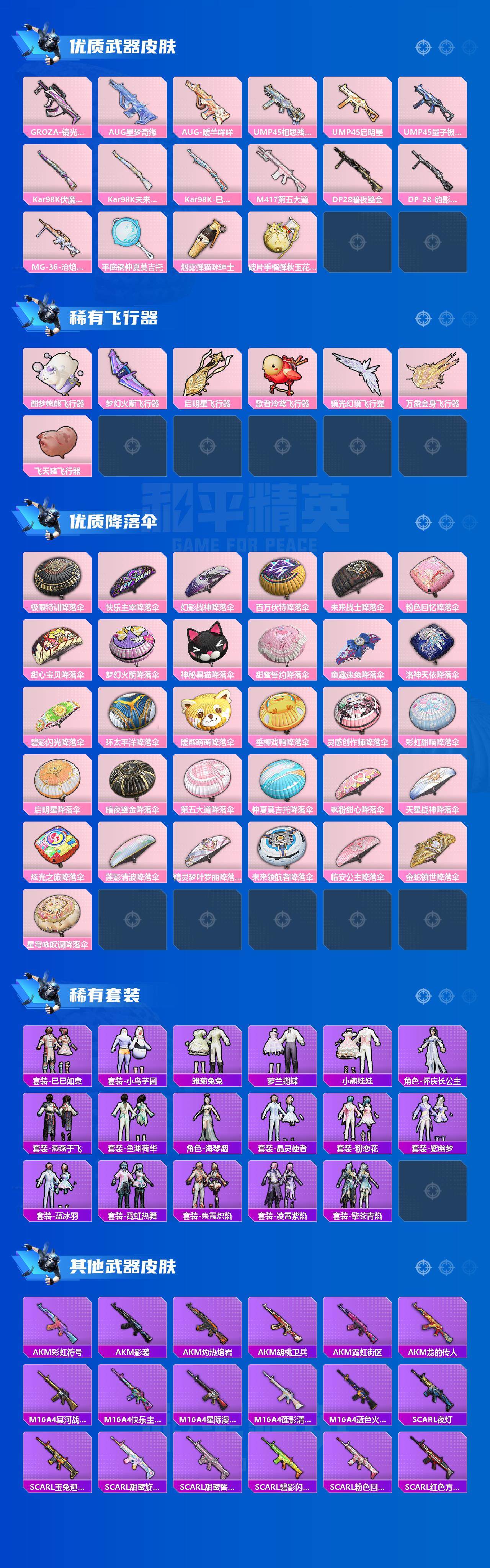 AKM-甜心宝贝,AKM-梦之光华,AKM-星际浪客,M16A4-垂柳戏鸭,SCAR-L-梦幻火箭,SCAR-L-童趣迷兔,SCAR-L-青春物语,M416-五爪金龙,M416-心之恋语,M416-暖熊萌萌,M416-电玩时刻,GROZA-镜光银凌,AUG-星梦奇缘,AUG-暖羊咩咩,UMP45-相思残雪,UMP45-量子极限,Kar98K-伏魔团,Kar98K-未来歌姬,Kar98K-巳巳如意,M417-第五大道,DP-28-暗夜鎏金,平底锅-仲夏莫吉托,烟雾弹-猫咪绅士,破片手榴弹-秋玉花灯