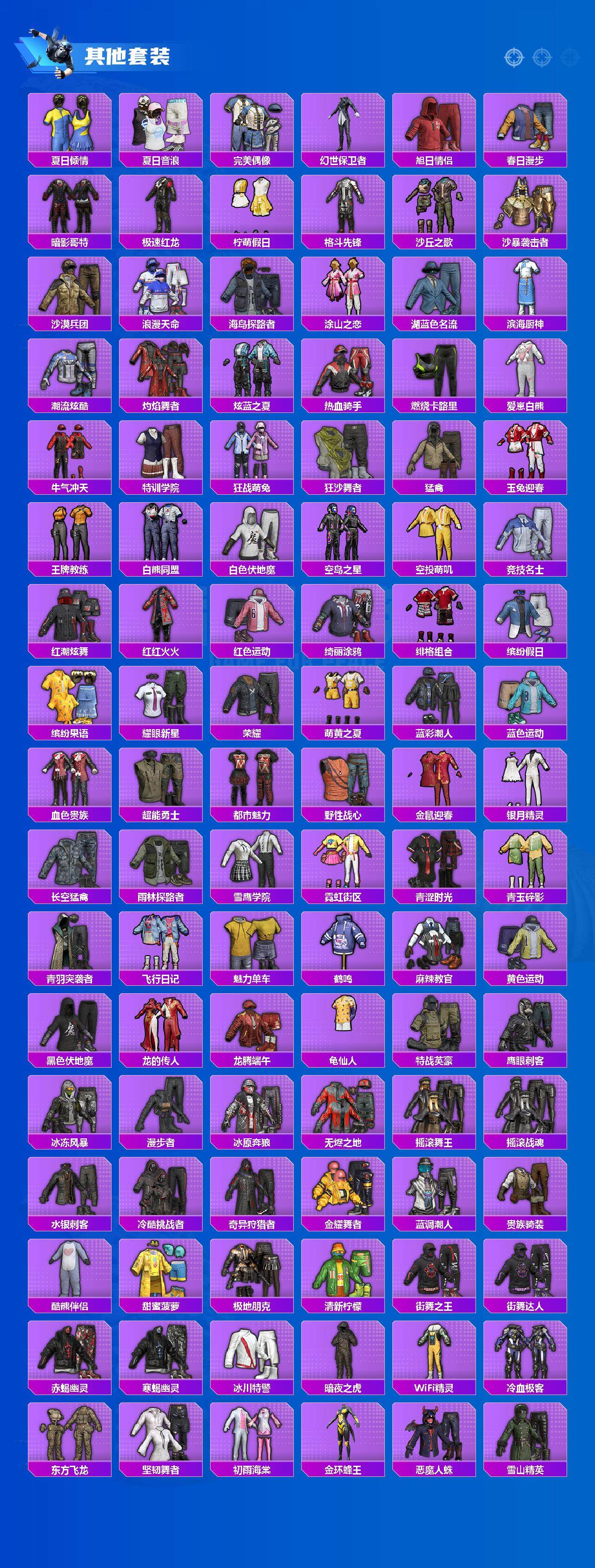 套装-怪诞乔克,角色-呆萌星弥,套装-冰川幽秘,套装-寒光使者,套装-紫电风暴,套装-天使彩虹糖,套装-绚金战神,套装-宝贝奶油派,套装-彩虹鹿灵,角色-歌者泠鸢,套装-暗夜鎏金,套装-未来歌姬,角色-守护天翼,套装-粉色回忆,套装-炙焰红王,套装-雪国幻梦,角色-小可学妹,套装-垂柳戏鸭,套装-灵感创作师,套装-仲夏莫吉托,套装-第五大道,角色-茉莉星,套装-纯珍童话,套装-智能音符,角色-美琪,套装-暖熊萌萌,套装-缤纷油彩,套装-极限特训,岚岚物语套装,套装-放客神游,套装-新星烈龙,套装-数码大师,套装-花间之火