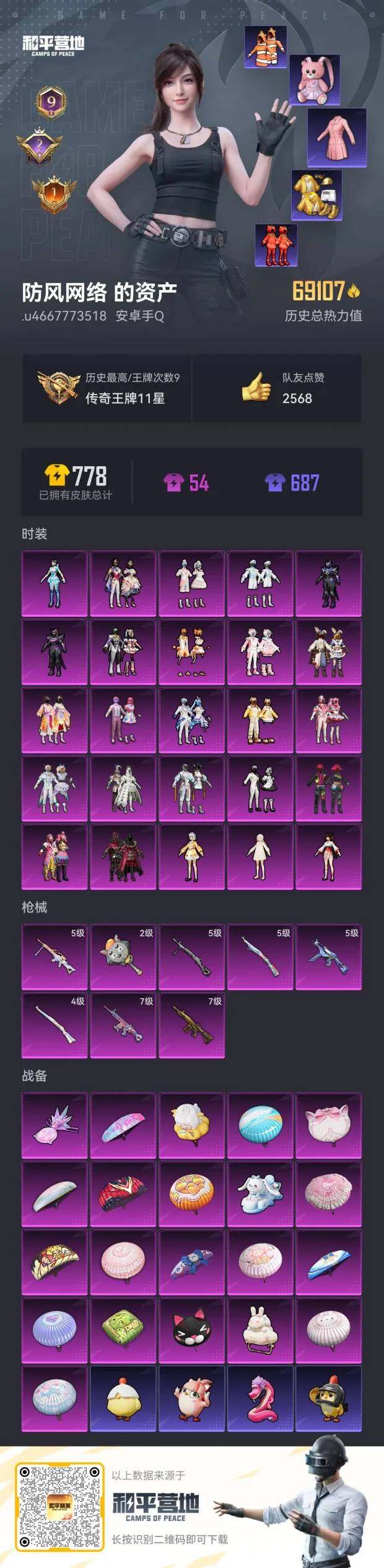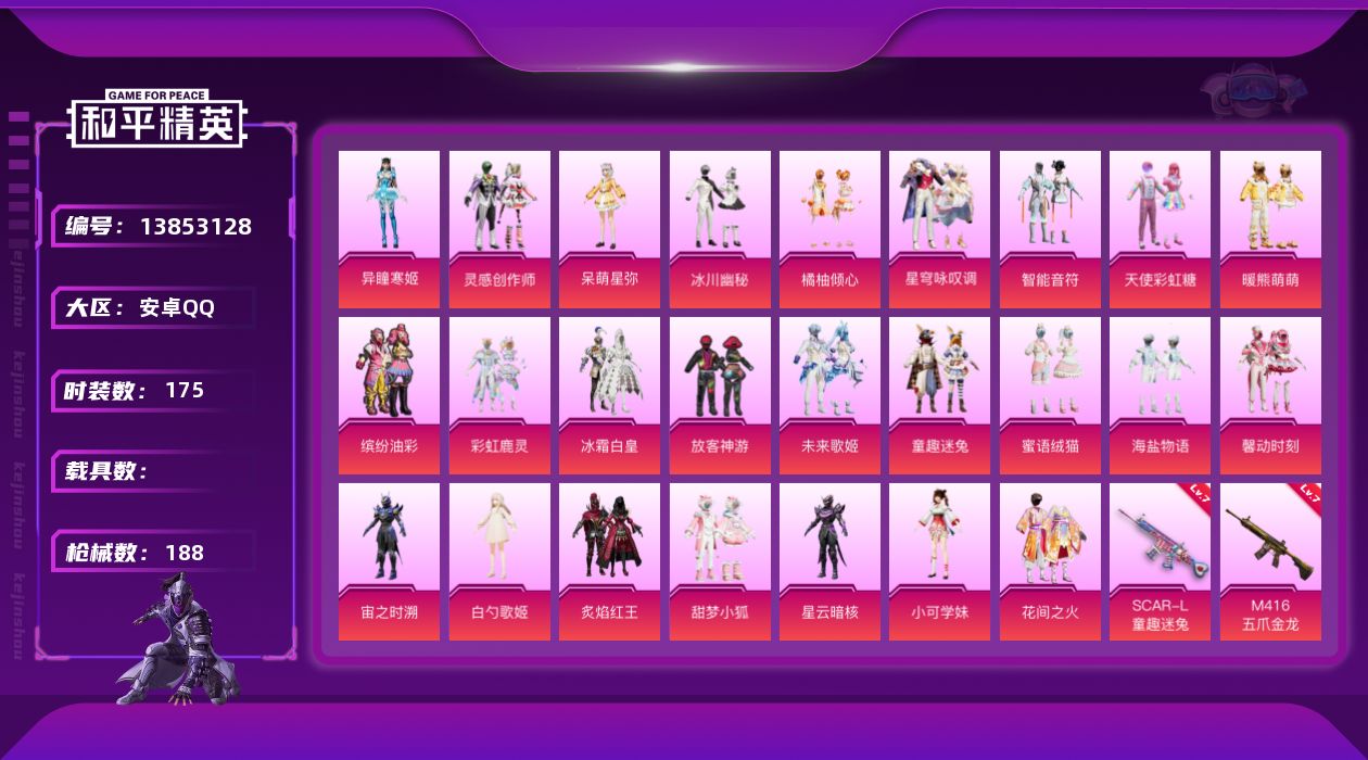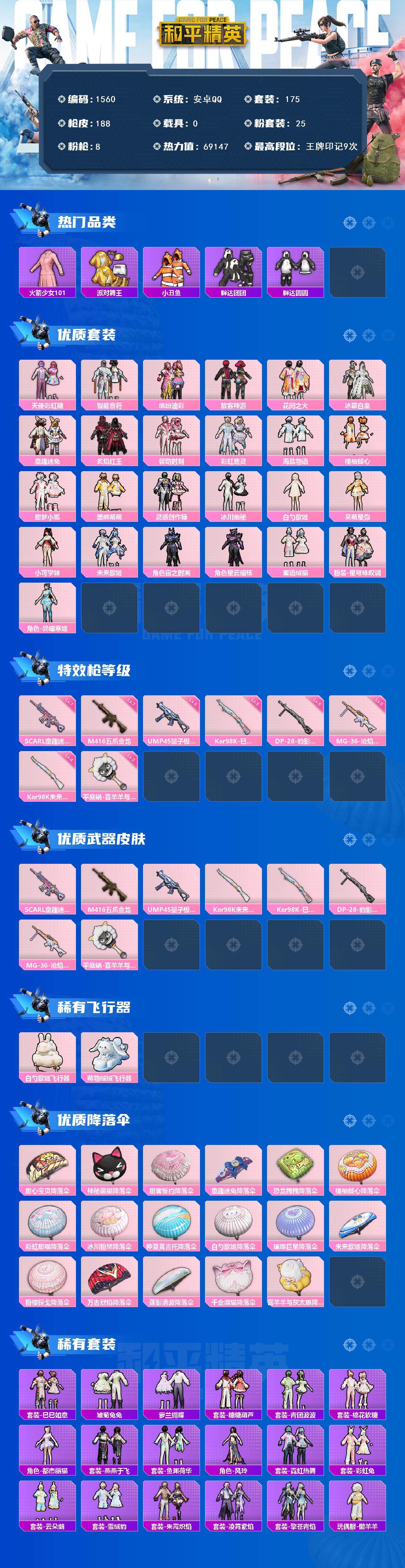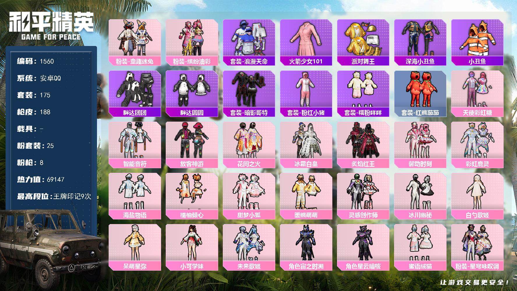 [13853128]安卓 手Q-25粉装-8特效枪-0载具-3粉色飞行器-69147热力值-9王牌印记-175套装-188枪皮 【热门品类】:粉装-童趣迷兔,粉装-缤纷油彩,套装-浪漫天命,套装-火箭少女101,套装-派对舞王,套装-深海小丑鱼,套装-小丑鱼,套装-胖达团团,套装-胖达圆圆,套装-暗影哥特,套装-粉红小猪,套装-糯粉咩咩,套装-红熊茄茄 【粉色套装】:粉装-天使彩虹糖,粉装-智能音符,粉装-缤纷油彩,粉装-放客神游,粉装-花间之火,粉装-冰霜白皇,粉装-童趣迷兔,粉装-炙焰红王,粉装-馨动时刻,粉装-彩虹鹿灵,粉装-海盐物语,粉装-橘柚倾心,粉装-甜梦小狐,粉装-暖熊萌萌,粉装-灵感创作师,粉装-冰川幽秘,角色-白勺歌姬,角色-呆萌星弥,角色-小可学妹,粉装-未来歌姬,角色-宙之时溯,角色-星云暗核,粉装-蜜语绒猫,粉装-星穹咏叹调,角色-异瞳寒姬 【粉色枪皮等级】:SCAR-L-童趣迷兔(七级),M416-五爪金龙(七级),UMP45-量子极限(五级),Kar98K-未来歌姬(四级),Kar98K-巳巳如意(五级),DP-28-豹影疾电(五级),MG-36-沧焰双生(五级),平底锅-喜羊羊与灰太狼(二级) 【粉色枪皮】:SCAR-L-童趣迷兔,M416-五爪金龙,UMP45-量子极限,Kar98K-未来歌姬,Kar98K-巳巳如意,DP-28-豹影疾电,MG-36-沧焰双生,平底锅-喜羊羊与灰太狼 【粉色飞行器】:白勺歌姬飞行器,萌物绒绒飞行器 【粉色降落伞】:甜心宝贝降落伞,神秘黑猫降落伞,甜蜜誓约降落伞,童趣迷兔降落伞,恐龙拽拽降落伞,橘柚倾心降落伞,彩虹甜喵降落伞,冰川粉黛降落伞,仲夏莫吉托降落伞,白勺歌姬降落伞,璀璨巨星降落伞,未来歌姬降落伞,粉樱探戈降落伞,万古烈焰降落伞,莲影清波降落伞,千金淑猫降落伞,喜羊羊与灰太狼降落伞 【稀有套装】:套装-巳巳如意,套装-雏菊兔兔,套装-萝兰蝴蝶,套装-糖糖葫芦,套装-青团波波,套装-棉花软糖,角色-都市丽猫,套装-燕燕于飞,套装-鱼渊荷华,角色-风玲,套装-霓虹热舞,套装-彩虹兔,套装-云朵鹅,套装-雪绒豹,套装-朱霞炽焰,套装-凌霄紫焰,套装-擎苍青焰,玩偶服-懒羊羊,角色-绯色魅影 【稀有枪皮】:AKM-2P战斗服款,AKM-缤纷海域,AKM-龙的传人,M16A4-莲影清波,SCAR-L-夜灯,SCAR-L-炫