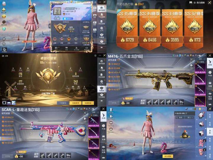 【粉色枪皮等级】:SCAR-L-童趣迷兔(七级),M416-五爪金龙(七级),UMP45-量子极限(五级),Kar98K-未来歌姬(四级),Kar98K-巳巳如意(五级),DP-28-豹影疾电(五级),MG-36-沧焰双生(五级),平底锅-喜羊羊与灰太狼(二级)