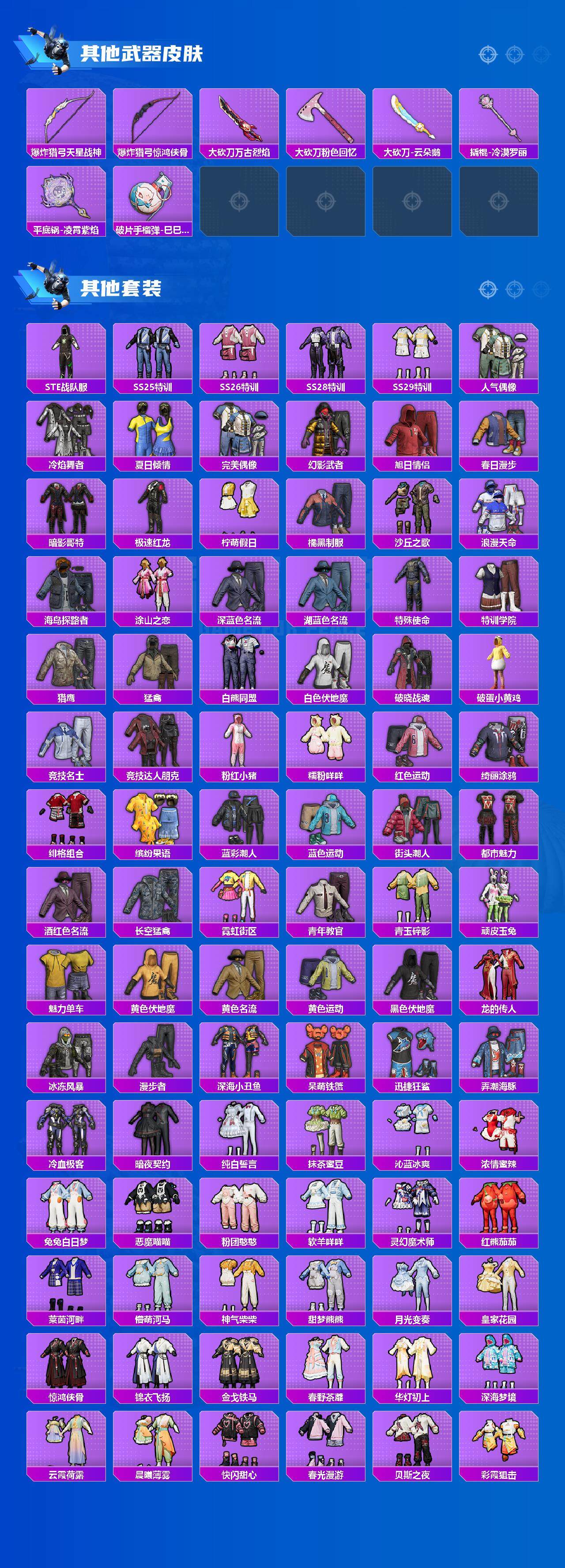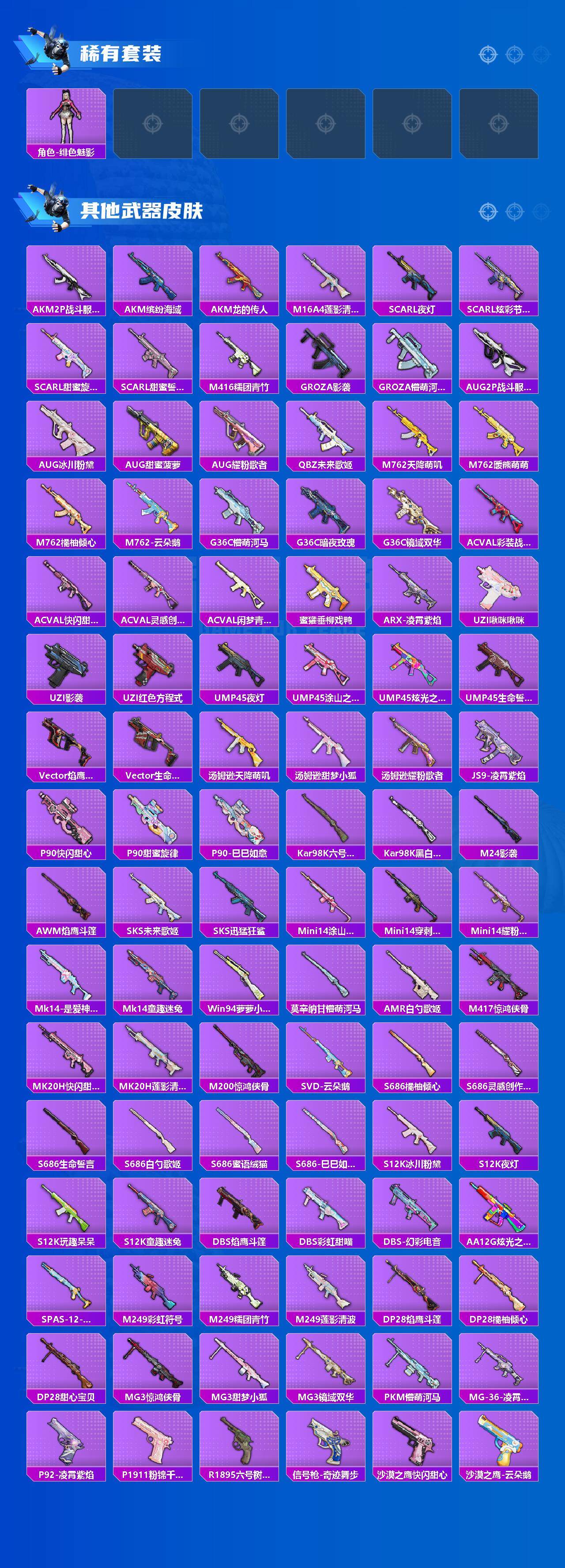 - [11998854]5特效枪 2印记 可二次 可修改实名 优质装备:AUG-暖羊咩咩,GROZA-圣辉之星,AMR-智耀战神,Kar98K-巳巳如意 稀有枪皮:DP-28-豹影疾电 六级特效枪:六级GROZA-圣辉之星 五级特效枪:五级DP-28-豹影疾电,五级AUG-暖羊咩咩 四级特效枪:四级AMR-智耀战神 二级特效枪:二级Kar98K-巳巳如意 紫色装扮:云朵鹅,彩虹兔,雪绒豹,SS33特训套装,电音精灵,萌趣颜团子,魅力单车,鹤鸣,黑色伏地魔,都市魅力,海岛探路者,柠萌假日,绮丽涂鸦,王牌教练,鱼渊荷华,燕燕于飞,异域银装,小丑鱼,耀粉歌者,大橘大利,SS32特训服(SS32特训套装),萌萌史莱姆,幽秘之星,蓝冰羽,紫幽梦,粉恋花,恋语绒绒,弄潮海豚 优质战备:幻彩电音降落伞,智耀战神降落伞,雪月幻音降落伞