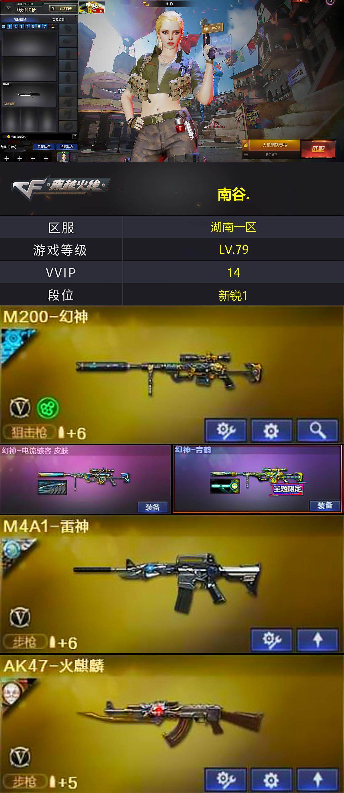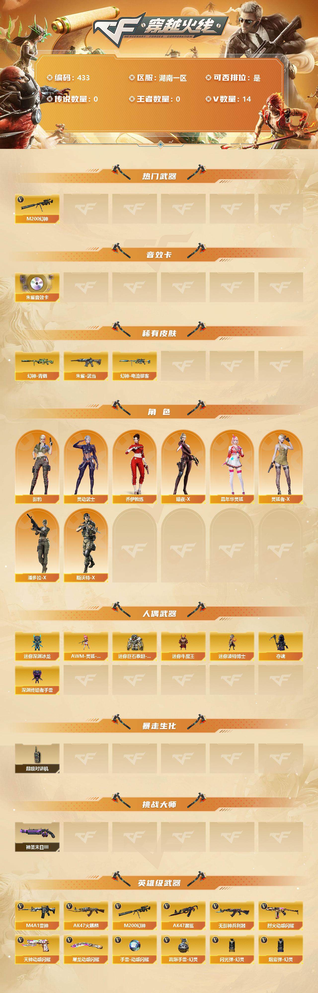 [13130629]湖南一区-14V-0王者-0炫金 【热门武器】:M200-幻神 【音效卡】:HK417-朱雀音效卡 【皮肤】:幻神-青鹤,幻神-电流骇客 皮肤,HK417-朱雀-武当 【角色】:影豹,乔伊教练,暗夜-X,嘉年华灵狐,灵动武士,灵狐者-X,潘多拉-X,斯沃特-X 【人偶武器】:AWM-灵狐-15周年嘉年华,迷你巨石泰坦-魔花研究所,迷你深渊冰龙,迷你牛魔王,迷你波特博士,夺魂,深渊终结者手雷 【暴走生化】:超级对讲机 【挑战大师】:神圣爆裂者-末日III 【英雄级武器】:AK47-火麒麟,M4A1-雷神,AK47-黑鲨,无影-神兵利器,烈火-动感闪耀,M200-幻神,天神-动感闪耀,屠龙-动感闪耀,高爆手雷-幻灵*2,手雷-动感闪耀,闪光弹-幻灵,烟雾弹-幻灵 【特殊枪械】: