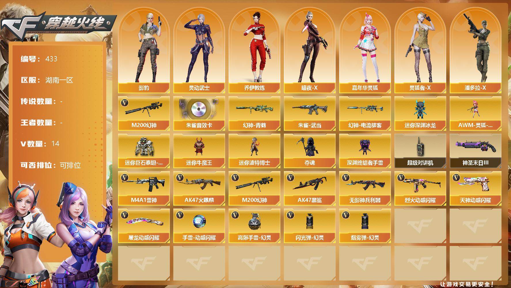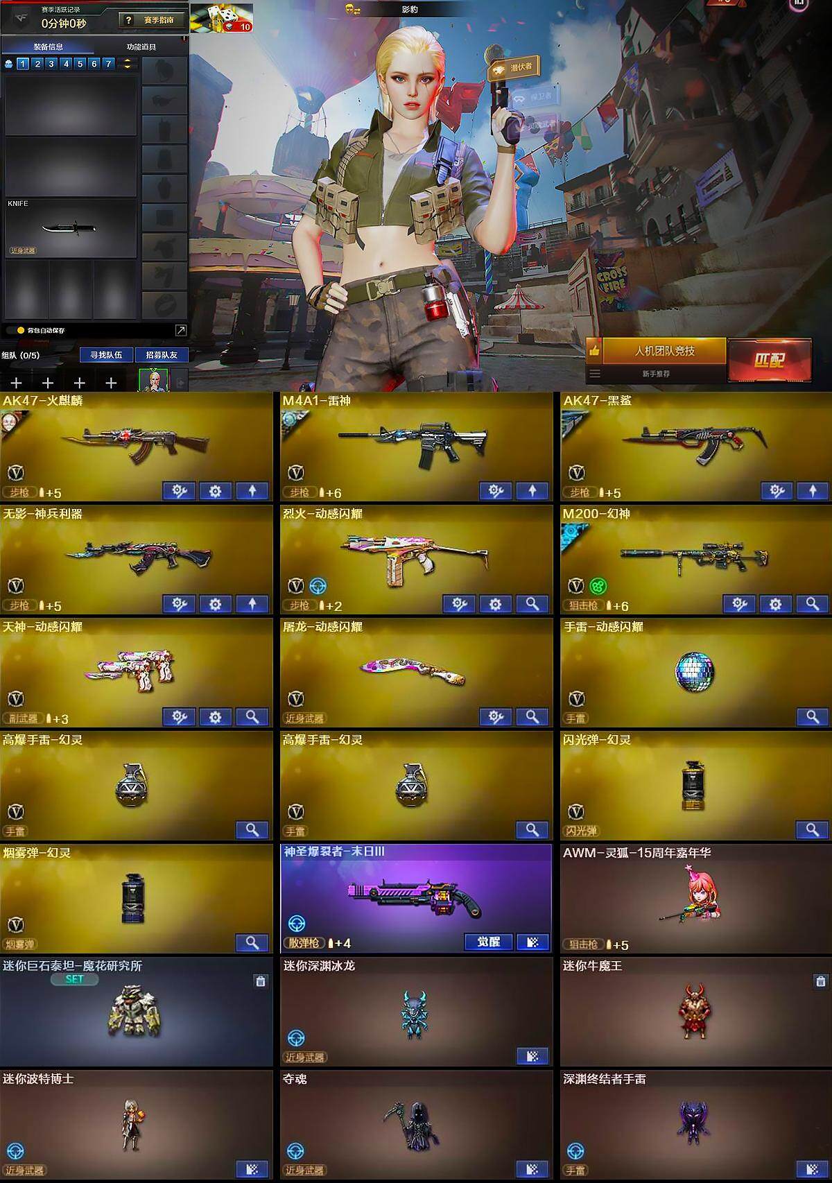 【英雄级武器】:AK47-火麒麟,M4A1-雷神,AK47-黑鲨,无影-神兵利器,烈火-动感闪耀,M200-幻神,天神-动感闪耀,屠龙-动感闪耀,高爆手雷-幻灵*2,手雷-动感闪耀,闪光弹-幻灵,烟雾弹-幻灵