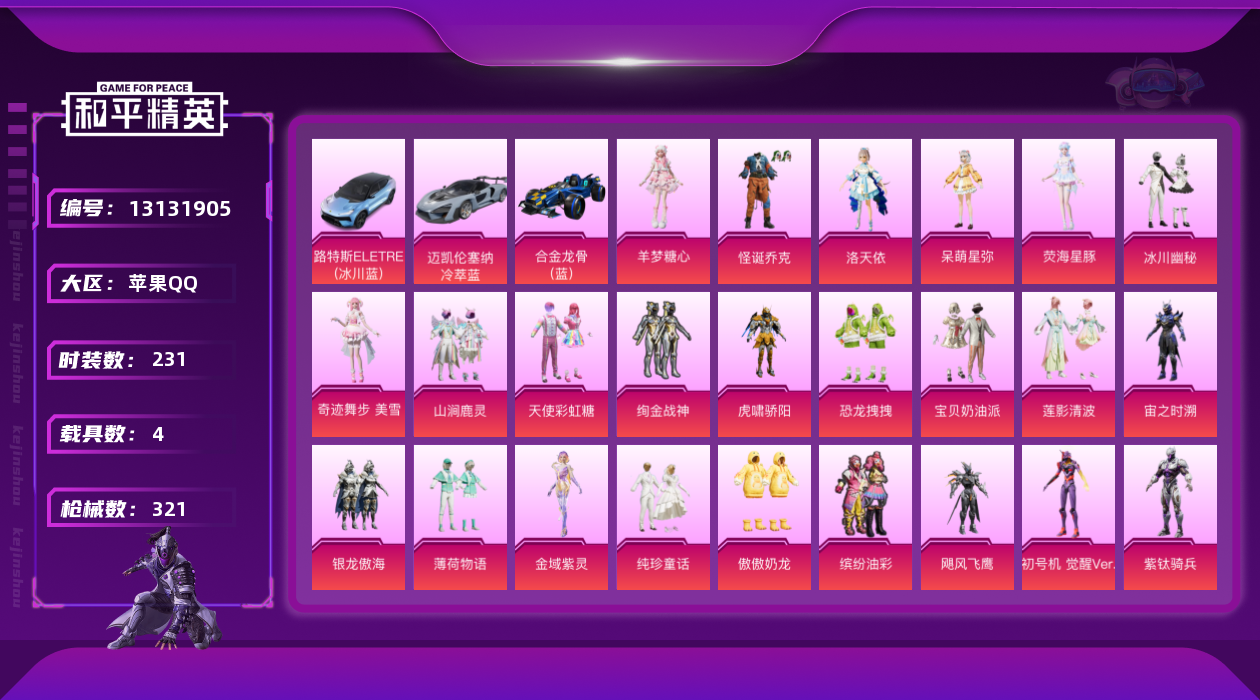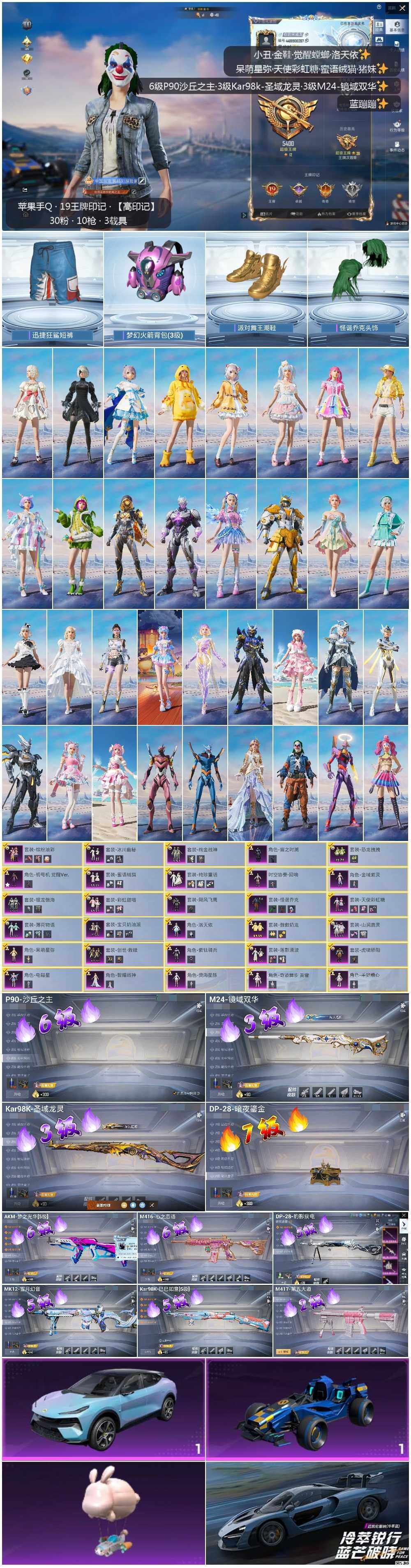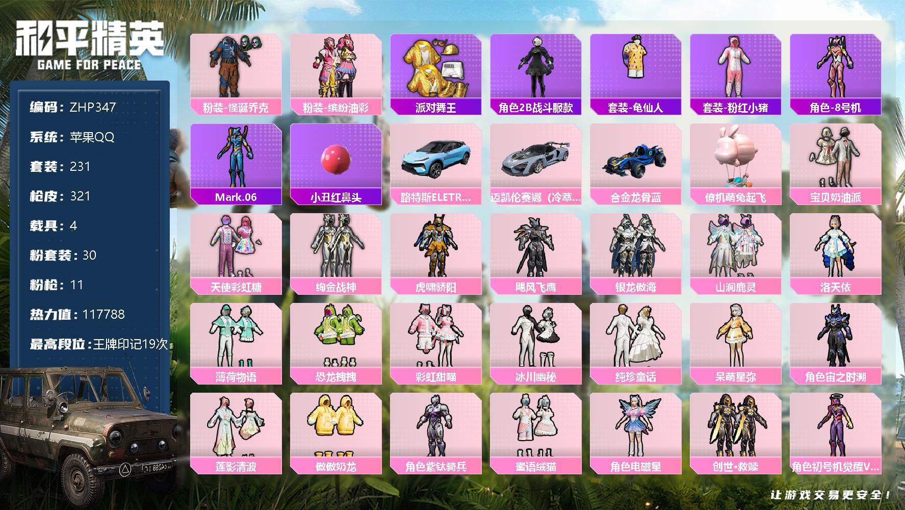[13131905]素材身法号/地铁满天赋 苹果 手Q-30粉装-11特效枪-4载具-8粉色飞行器-11.7w热力值-19王牌印记-231套装-321枪皮【热门品类】:粉装-怪诞乔克,粉装-缤纷油彩,套装-派对舞王,角色-2B战斗服款,套装-龟仙人,套装-粉红小猪,角色-8号机,角色-Mark.06,小丑红鼻头【粉色载具】:路特斯ELETRE(冰川蓝),迈凯伦塞纳(冷萃蓝),合金龙骨(蓝),僚机-萌兔起飞【粉色套装】:粉装-怪诞乔克,粉装-宝贝奶油派,粉装-天使彩虹糖,粉装-缤纷油彩,粉装-绚金战神,粉装-虎啸骄阳,粉装-飓风飞鹰,粉装-银龙傲海,粉装-山涧鹿灵,角色-洛天依,粉装-薄荷物语,粉装-恐龙拽拽,粉装-彩虹甜喵,粉装-冰川幽秘,粉装-纯珍童话,角色-呆萌星弥,角色-宙之时溯,粉装-莲影清波,粉装-傲傲奶龙,角色-紫钛骑兵,粉装-蜜语绒猫,角色-电磁星,套装-创世·救赎,角色-初号机 觉醒Ver.,角色-金域紫灵,角色-智耀战神,角色-荧海星豚,角色-奇迹舞步 美雪,角色-羊梦糖心【粉色枪皮等级】:AKM-梦之光华(六级),M416-心之恋语(六级),P90-沙丘之主(六级),Kar98K-巳巳如意(五级),Kar98K-圣域龙灵(三级),M24-镜域双华(三级),M417-第五大道(二级),MK12-雪月幻音(五级),DP-28-暗夜鎏金(七级),DP-28-豹影疾电(五级),破片手榴弹-美味星星糖(七级)【粉色飞行器】:梦之光华飞行器,沙丘之主天马,镜域双华-灵镜之阶,龙翔九天飞行器,圣域金龙飞行器,幻星舰长飞行器,终晖之翼飞行器