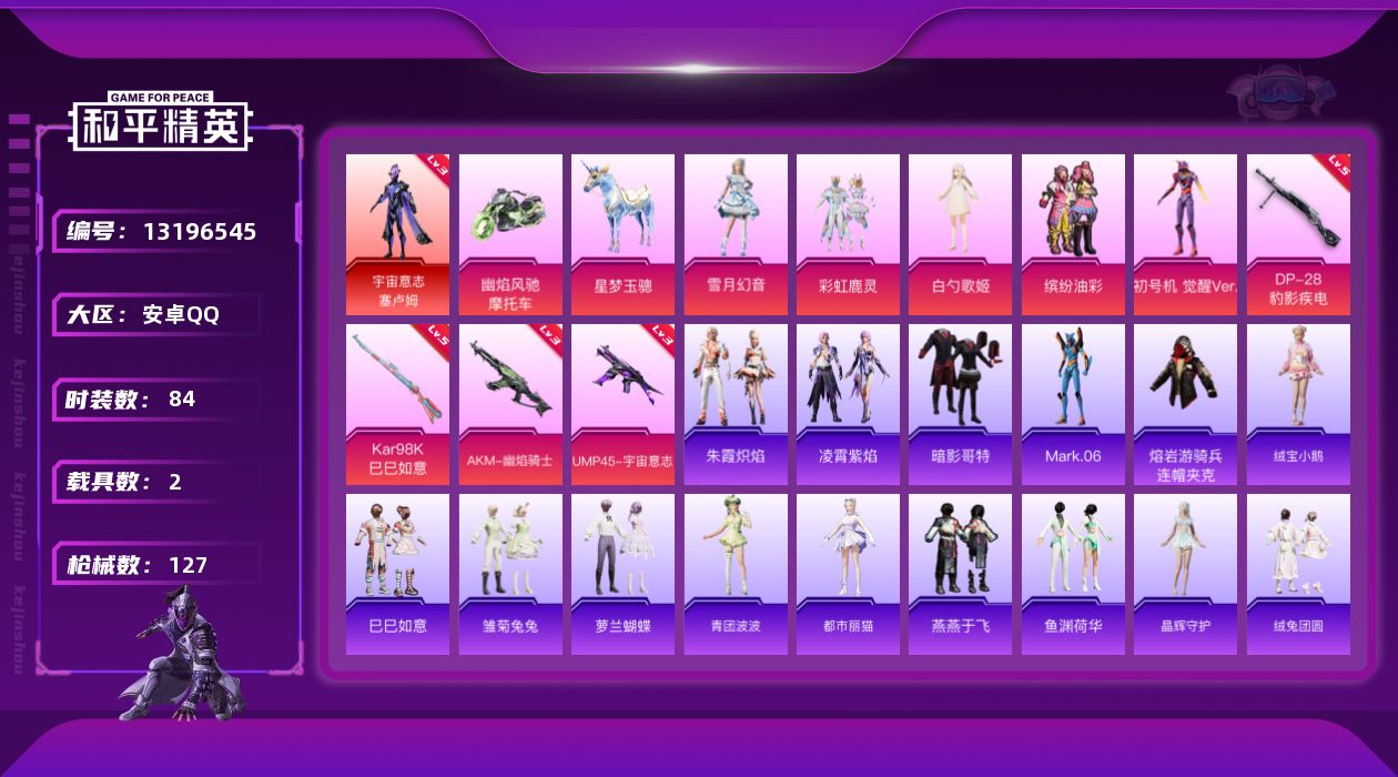 - [12043751]【暑期末清货/特价急出/永久包赔】:安卓 手Q-1红装-8粉装-8特效枪-1载具-7.6w热力值-16印记-136套装-235枪皮【热门品类】:套装-S1赛事【角色神装等级】:镜域双华-欧若拉(三级)【稀有载具】:俏皮小熊猫【特效枪等级】:AKM-幽焰骑士(三级),Kar98K-巳巳如意(五级),Kar98K-圣域龙灵(三级),Mk14-盛世惊鸿(三级),MK12-雪月幻音(七级),DP-28-豹影疾电(五级),MG3-洛神天依(七级),破片手榴弹-瓶中星球(七级)【优质套装】:粉装-梦幻火箭,角色-洛天依,粉装-暗夜鎏金,粉装-金丰海韵,角色-樱桃泡泡,粉装-星穹咏叹调,角色-奇迹舞步 美雪,角色-羊梦糖心【优质飞行器】:梦幻火箭飞行器,镜域双华-灵镜之阶,龙翔九天飞行器,凤舞九天飞行器,圣域金龙飞行器,绯果甜心飞行器,灵猫魔法师飞行器,飞天猪飞行器