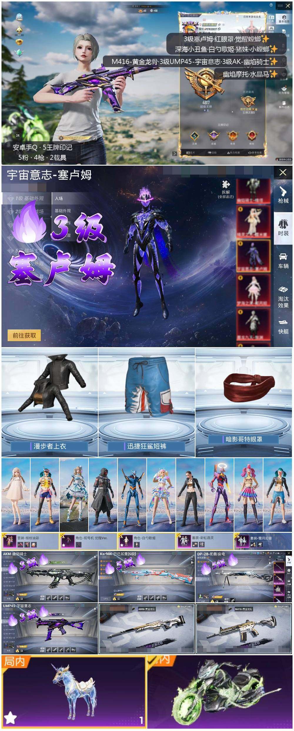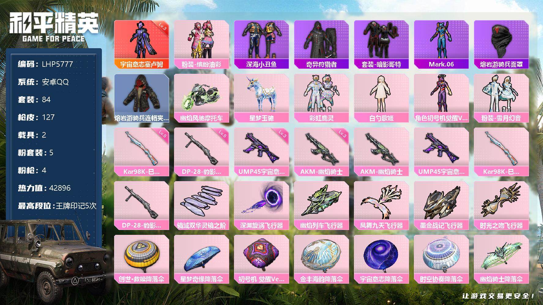 [13196545]素材身法号/绝世印记1/地铁满天赋 安卓 手Q-1神装-5粉装-4特效枪-2载具-6粉色飞行器-4.2w热力值-5王牌印记-84套装-127枪皮【红色神装等级】:宇宙意志-塞卢姆(三级)【热门品类】:粉装-缤纷油彩,套装-深海小丑鱼,套装-奇异狩猎者,套装-暗影哥特,角色-Mark.06,熔岩游骑兵面罩,熔岩游骑兵连帽夹克【粉色载具】:幽焰风驰摩托车,星梦玉骢【粉色套装】:粉装-缤纷油彩,粉装-彩虹鹿灵,角色-白勺歌姬,角色-初号机 觉醒Ver.,粉装-雪月幻音【粉色枪皮等级】:AKM-幽焰骑士(三级),UMP45-宇宙意志(三级),Kar98K-巳巳如意(五级),DP-28-豹影疾电(五级)【粉色飞行器】:镜域双华-灵镜之阶,深渊漩涡飞行器,幽焰列车飞行器,凤舞九天飞行器,墨金战记飞行器,时光之吻飞行器