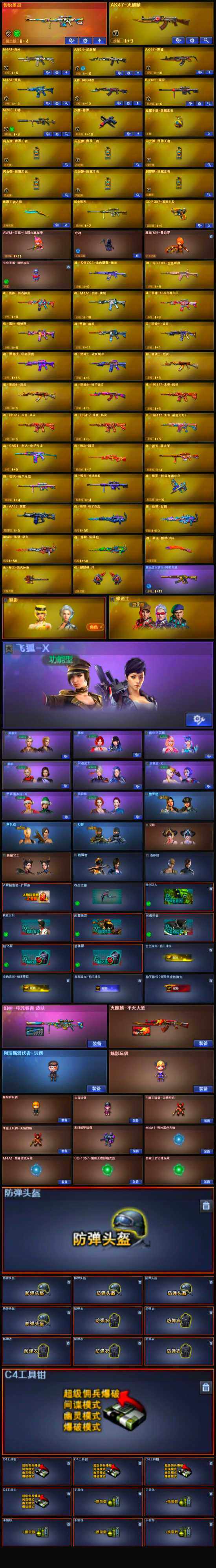 【英雄级武器】:AK47-火麒麟,M4A1-死神,AN94-超新星,AK47-黑鲨,M4A1-青龙,无影-神兵利器,Barrett-毁灭,M200-幻神,沙鹰-修罗,高爆手雷-雷霆王者