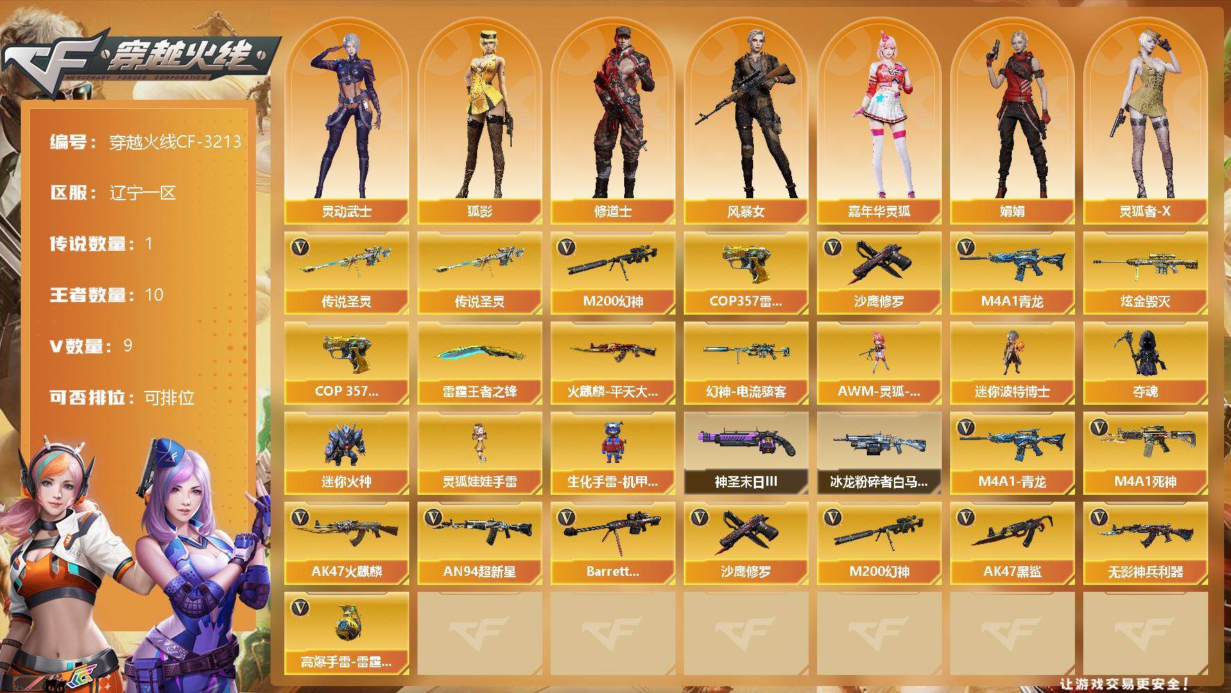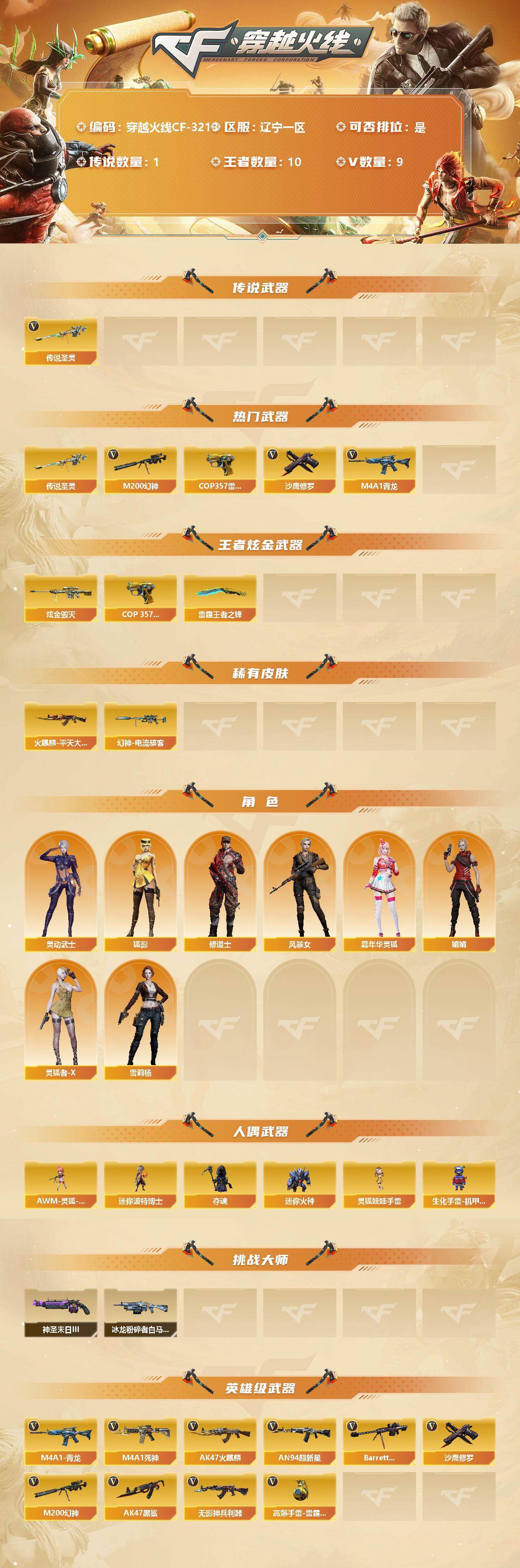 [13237995]辽宁一区-9V-10王者-1炫金 【传说武器】:传说圣灵 【热门武器】:传说圣灵,M4A1-青龙,M200-幻神,COP 357-雷霆王者,沙鹰-修罗 【王者炫金武器】:COP 357-雷霆王者,雷霆王者之锋,炫金毁灭 【皮肤】:幻神-电流骇客 皮肤,火麒麟-平天大圣 【角色】:狐影,修道士,风暴女,嘉年华灵狐,娟娟,灵动武士,灵狐者-X,雪莉杨 【人偶武器】:AWM-灵狐-15周年嘉年华,迷你波特博士,夺魂,迷你火种,灵狐娃娃手雷,生化手雷-机甲核心 【挑战大师】:冰龙粉碎者-白马银枪,神圣爆裂者-末日III 【英雄级武器】:AK47-火麒麟,M4A1-死神,AN94-超新星,AK47-黑鲨,M4A1-青龙,无影-神兵利器,Barrett-毁灭,M200-幻神,沙鹰-修罗,高爆手雷-雷霆王者 【特殊枪械】: