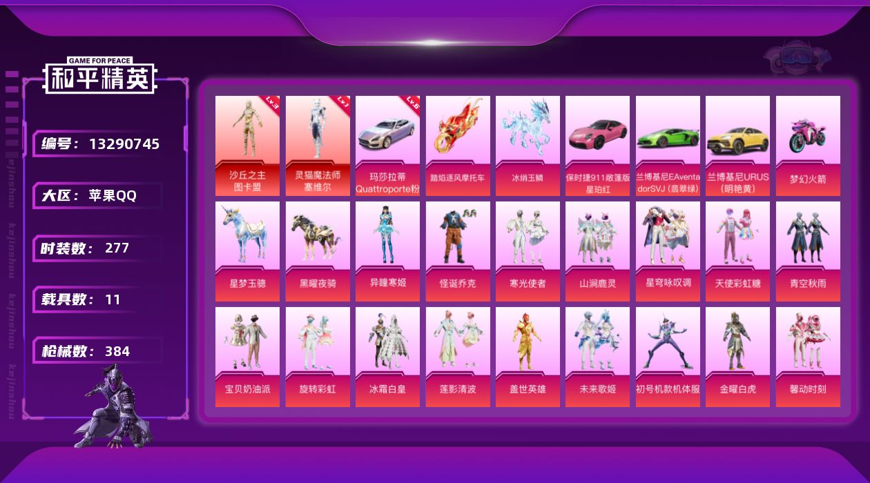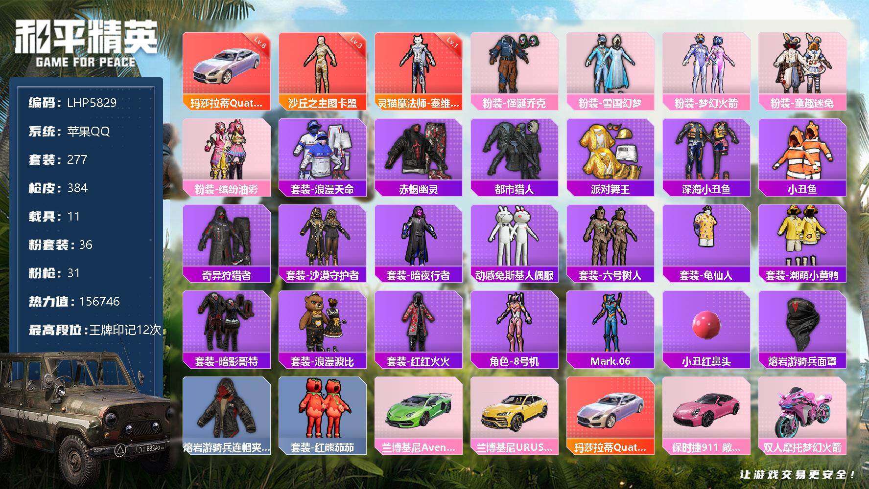 - PX_2091798- 苹果手Q-17王牌印记-12粉装-8特效枪-1载具-106143热力值-237套装-305枪皮-1卓越印记-1传奇印记 【12粉装】,天使彩虹糖,缤纷油彩,蝶舞迷情,第五大道,洛天依,草莓生巧,蓝莓炮弹,精灵娃娃,PEL轰鸣竞梦者,静灵氛围,智能音符,烟云彩露 【8特效枪】AKM-炫紫旋律-7级 AKM-甜心宝贝-7级 M416-电玩时刻-5级 Kar98K-巳巳如意-4级