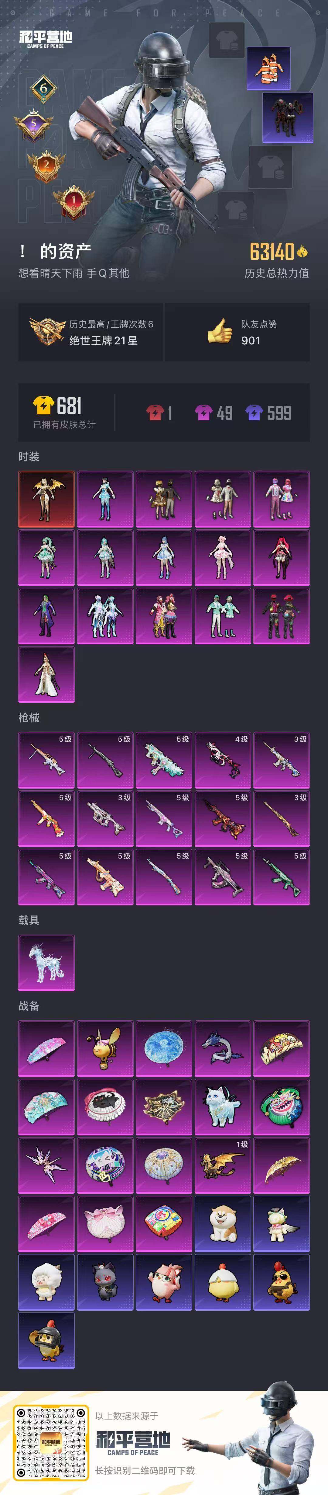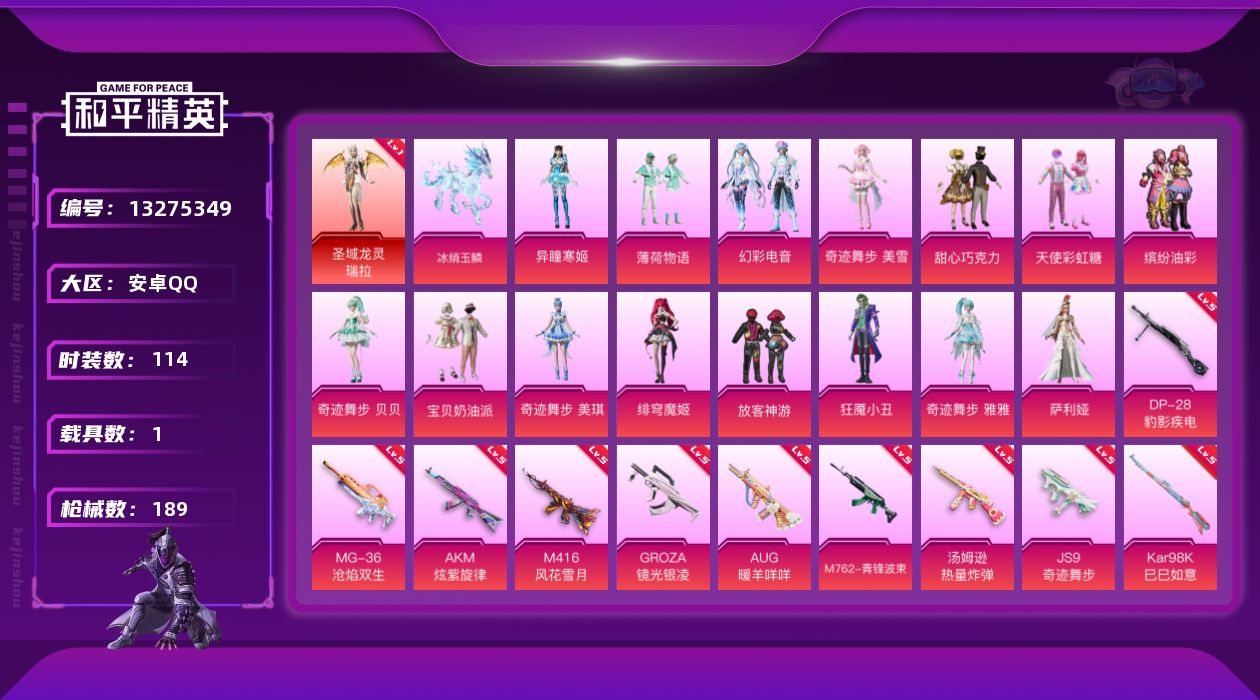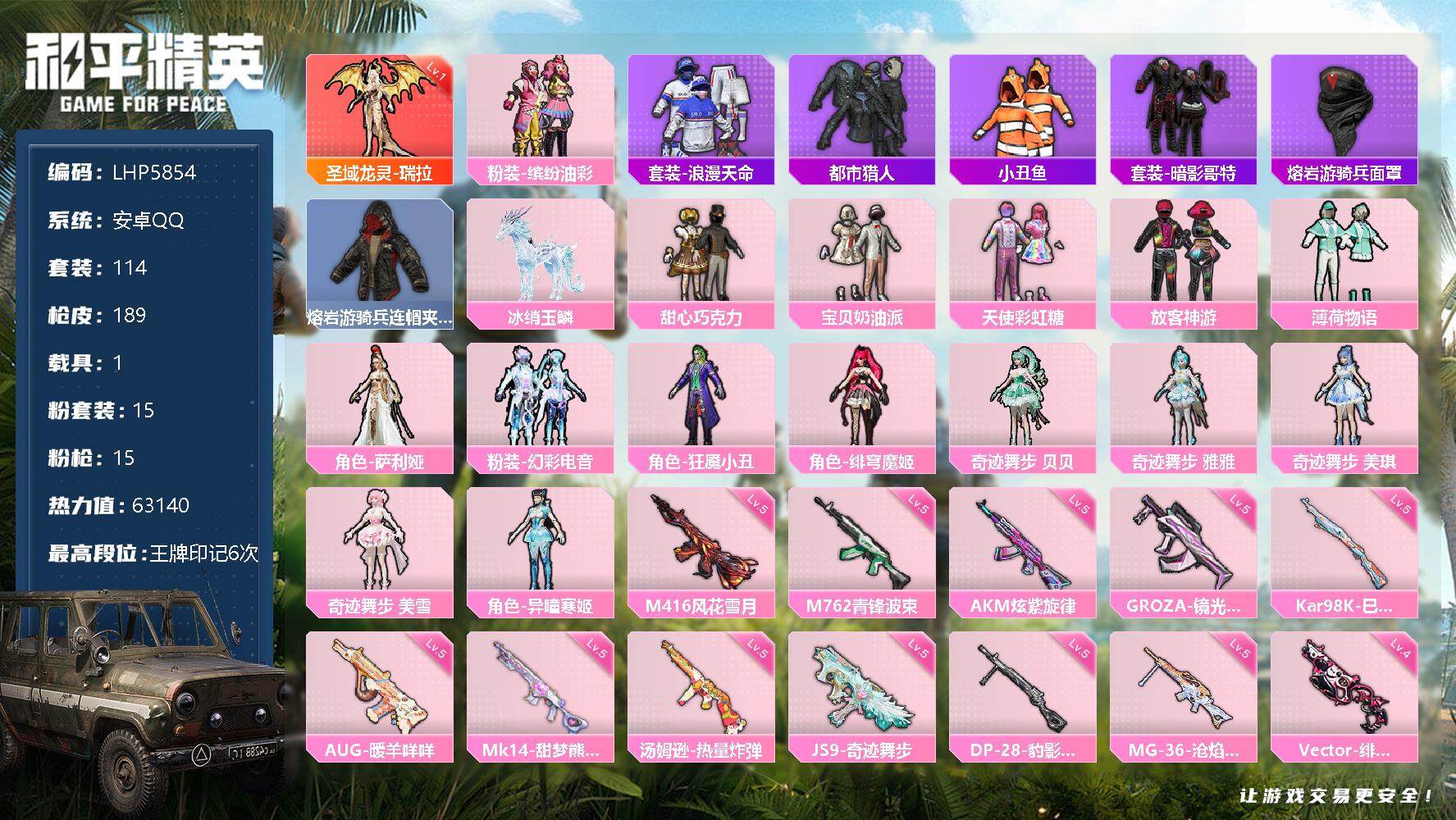 [13275349]安卓 手Q-1神装-15粉装-15特效枪-1载具-5粉色飞行器-63140热力值-6王牌印记-114套装-189枪皮【红色神装等级】:圣域龙灵-瑞拉(一级)【红色角色神装】:圣域龙灵-瑞拉【热门品类】:粉装-缤纷油彩,套装-浪漫天命,套装-都市猎人,套装-小丑鱼,套装-暗影哥特,熔岩游骑兵面罩,熔岩游骑兵连帽夹克【粉色载具】:冰绡玉鳞【粉色套装】:粉装-甜心巧克力,粉装-宝贝奶油派,粉装-天使彩虹糖,粉装-缤纷油彩,粉装-放客神游,粉装-薄荷物语,角色-萨利娅,粉装-幻彩电音,角色-狂魇小丑,角色-绯穹魔姬,角色-奇迹舞步 贝贝,角色-奇迹舞步 雅雅,角色-奇迹舞步 美琪,角色-奇迹舞步 美雪,角色-异瞳寒姬【粉色枪皮等级】:AKM-炫紫旋律(五级),M416-风花雪月(五级),M416-灵猫魔法师(三级),GROZA-镜光银凌(五级),AUG-暖羊咩咩(五级),M762-青锋波束(五级),Vector-最终圣卫者(三级),Vector-绯穹魔姬(四级),汤姆逊-热量炸弹(五级),JS9-奇迹舞步(五级),Kar98K-巳巳如意(五级),Kar98K-圣域龙灵(三级),Mk14-甜梦熊击(五级),DP-28-豹影疾电(五级),MG-36-沧焰双生(五级)【粉色枪皮】:AKM-炫紫旋律,M416-风花雪月,M416-灵猫魔法师,GROZA-镜光银凌,AUG-暖羊咩咩,M762-青锋波束,Vector-最终圣卫者,Vector-绯穹魔姬,汤姆逊-热量炸弹,JS9-奇迹舞步,Kar98K-巳巳如意,Kar98K-圣域龙灵,Mk14-甜梦熊击,DP-28-豹影疾电,MG-36-沧焰双生【粉色飞行器】:圣域金龙飞行器,终晖之翼飞行器,灵猫魔法师飞行器,灵珠游龙飞行器