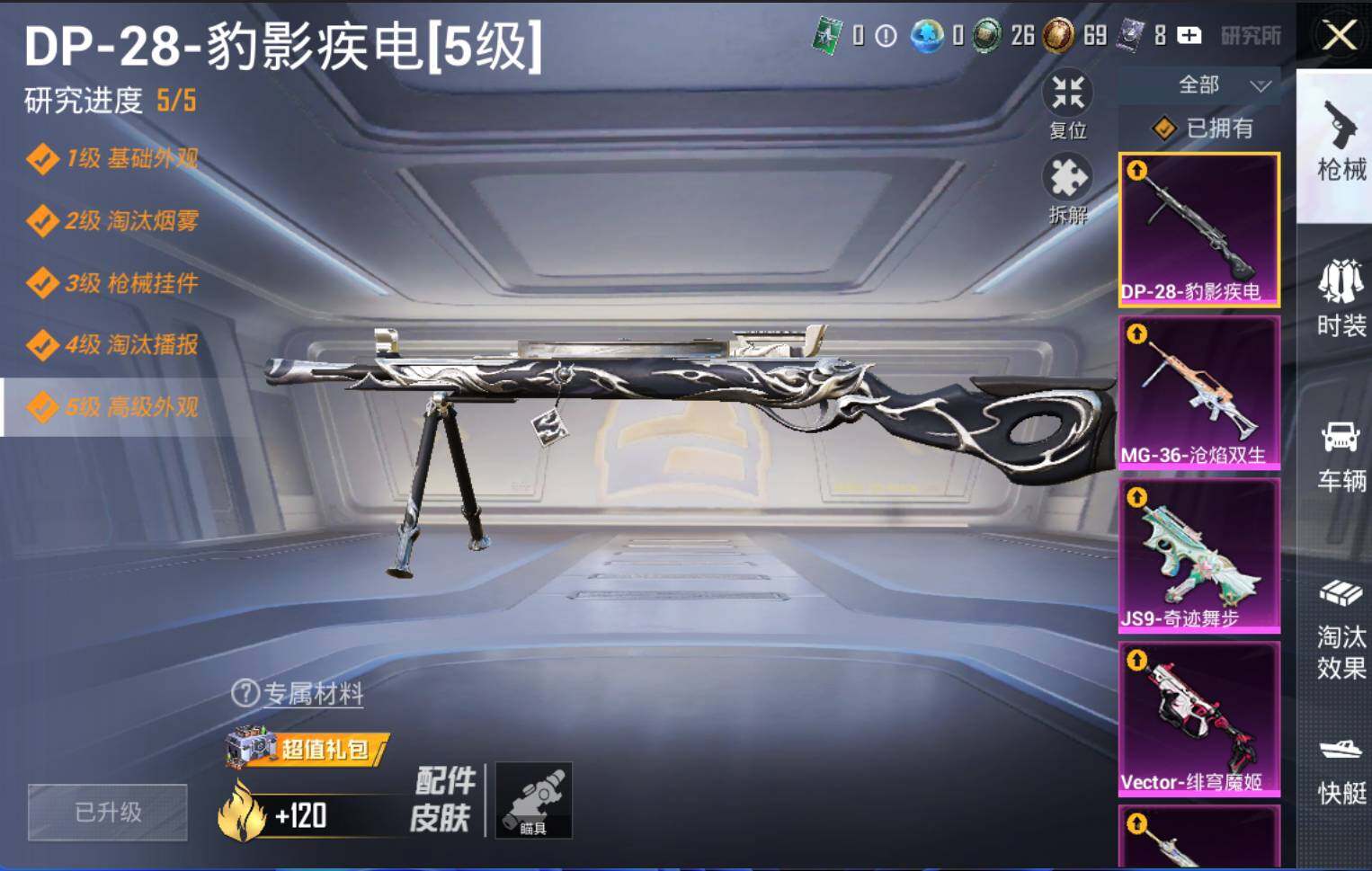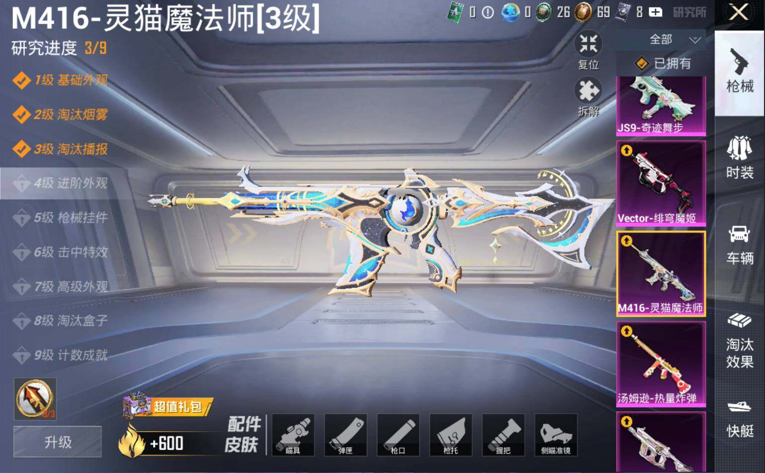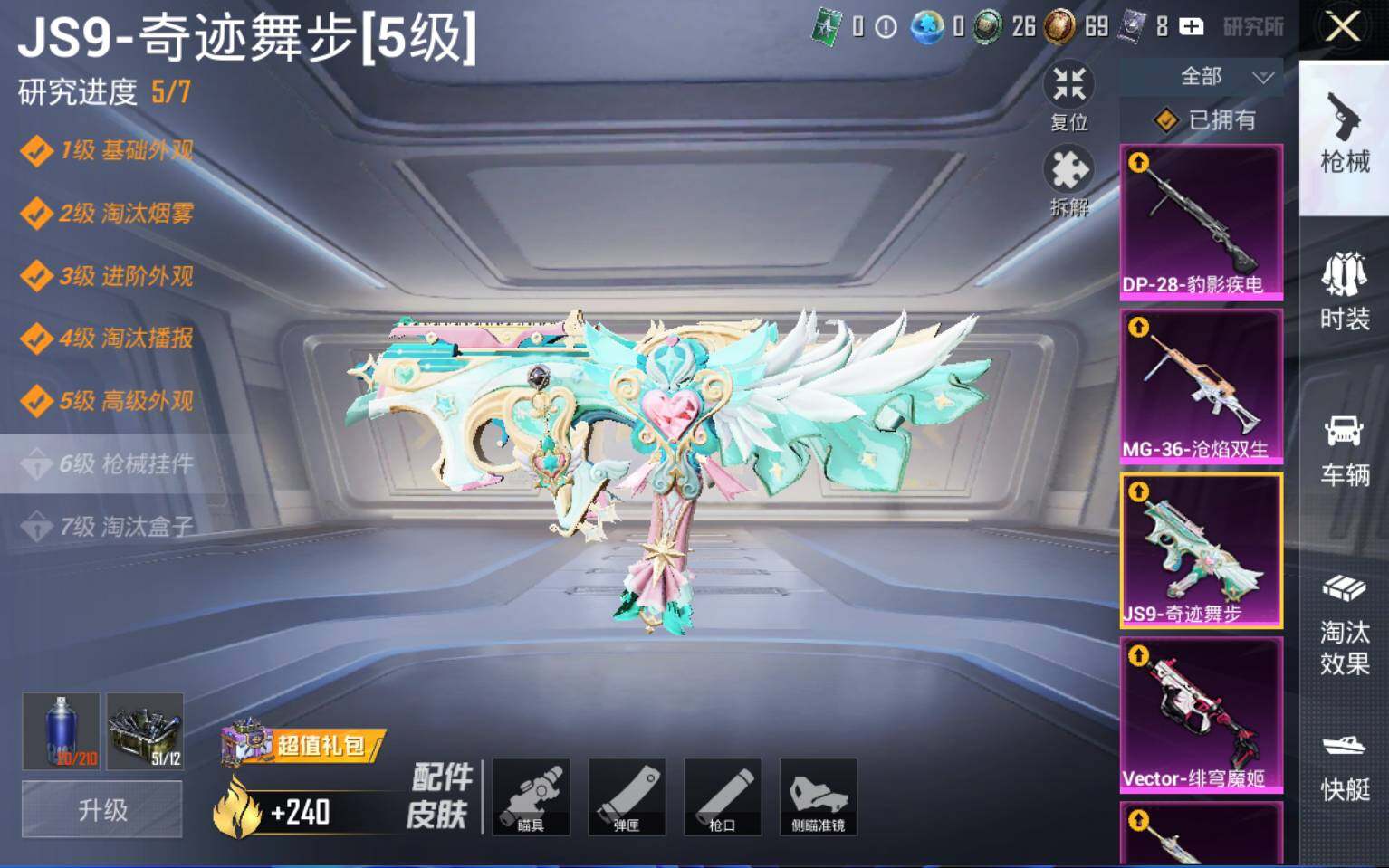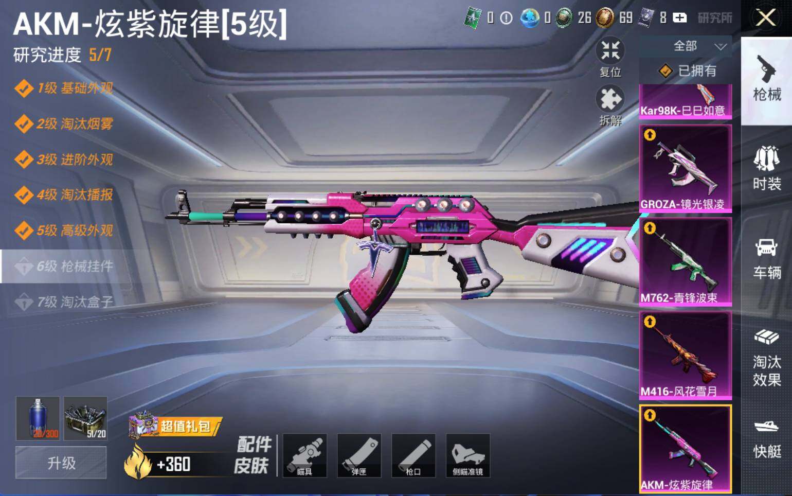 AKM-炫紫旋律,M416-风花雪月,GROZA-镜光银凌,AUG-暖羊咩咩,M762-青锋波束,Kar98K-巳巳如意,Kar98K-圣域龙灵