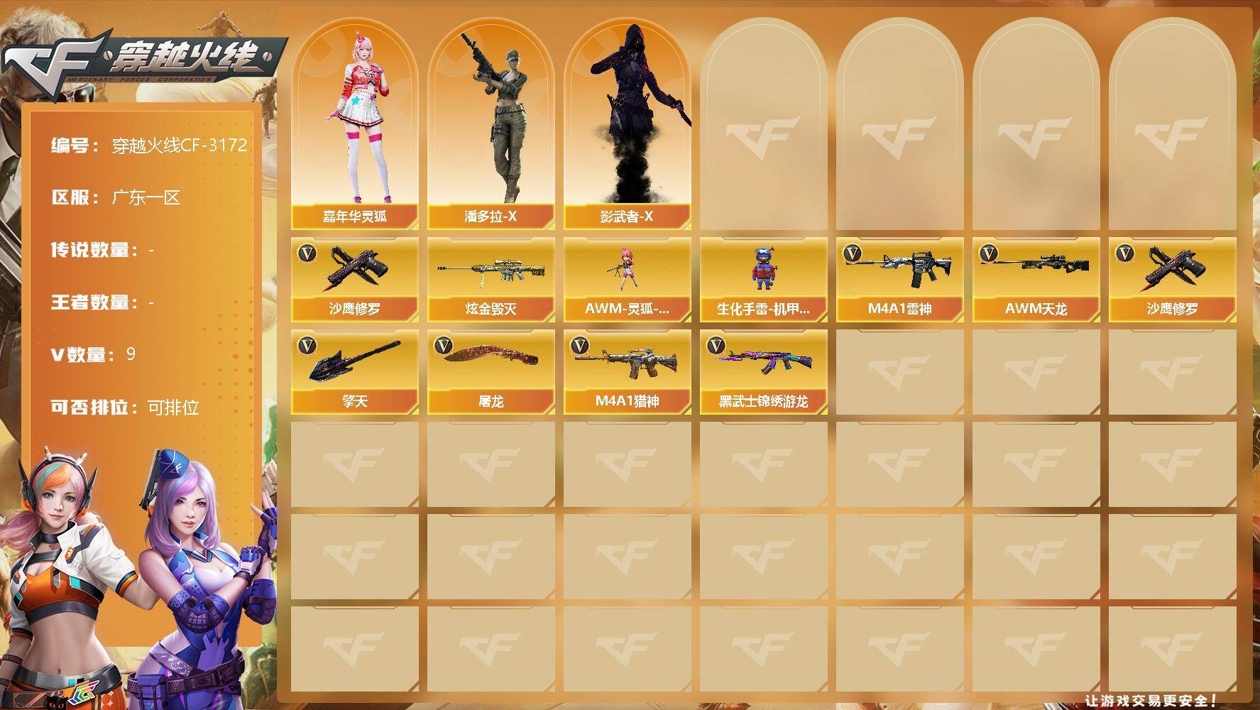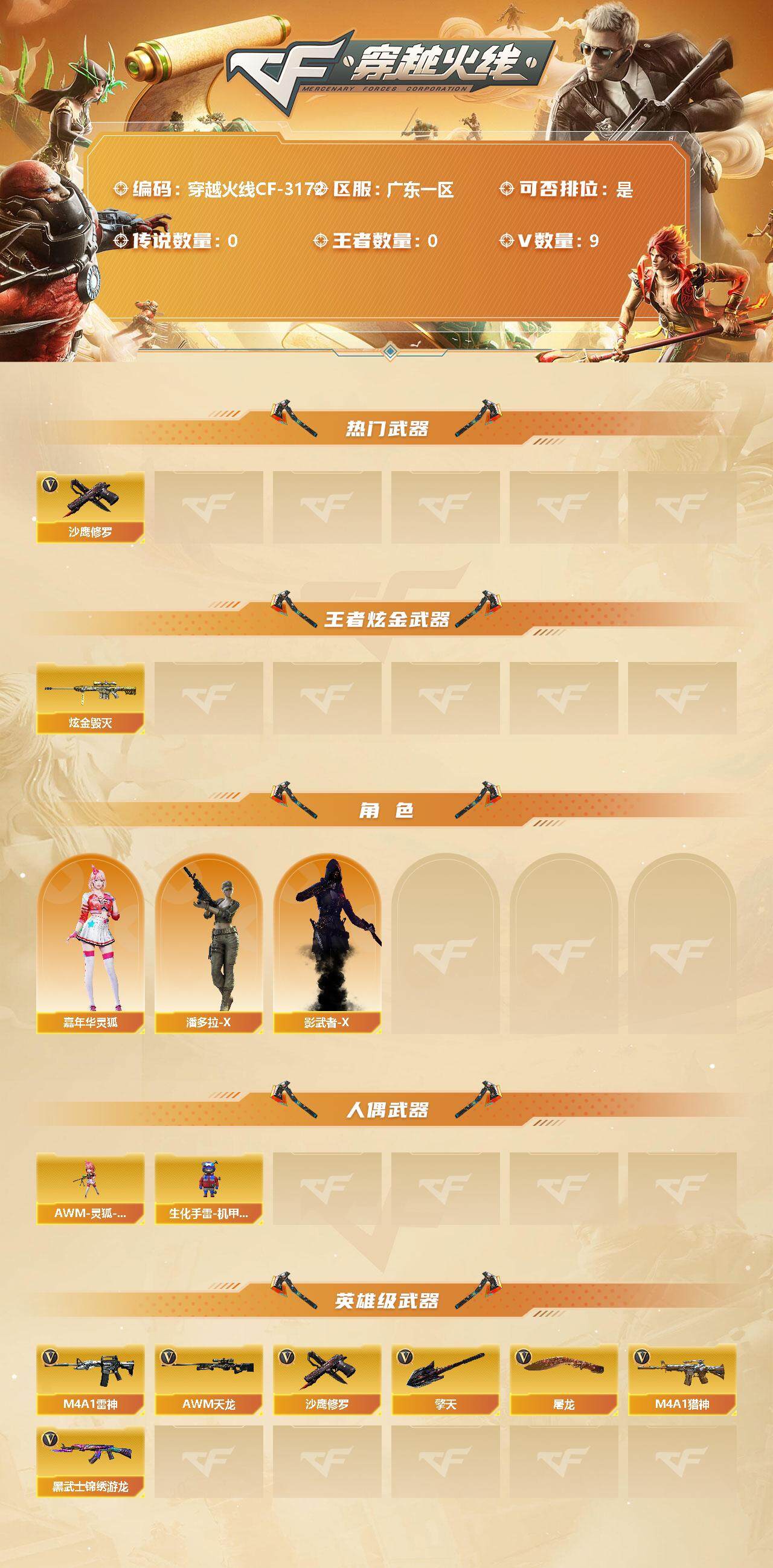 [13330295]广东一区-9V-0王者-1炫金 【热门武器】:沙鹰-修罗 【王者炫金武器】:炫金毁灭 【角色】:嘉年华灵狐,潘多拉-X,影武者-X 【人偶武器】:AWM-灵狐-15周年嘉年华,生化手雷-机甲核心 【英雄级武器】:M4A1-雷神,黑武士-锦绣游龙,M4A1-猎神*3,AWM-天龙,沙鹰-修罗,屠龙,擎天 【道具】:超级背包,夺命之镰,防化服,金色流光-枪王排位*2,星辰流光-枪王排位,枪王排位28赛季金色流光,枪王排位29赛季金色流光,防弹头盔*4,防弹衣*4,C4工具钳*4,手雷包*4 【特殊枪械】: