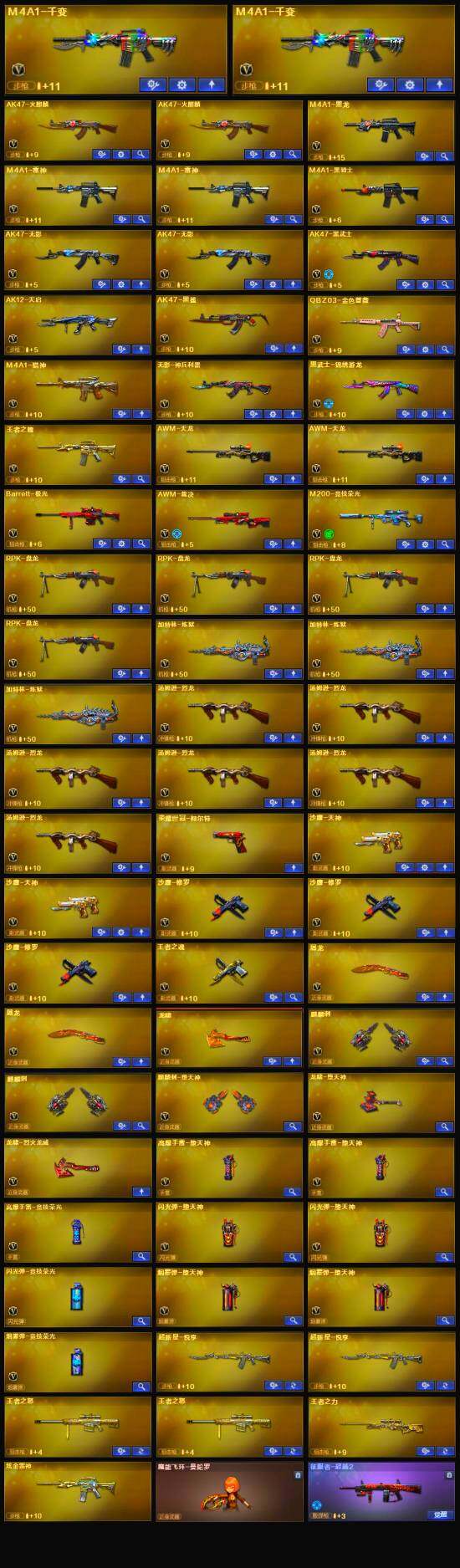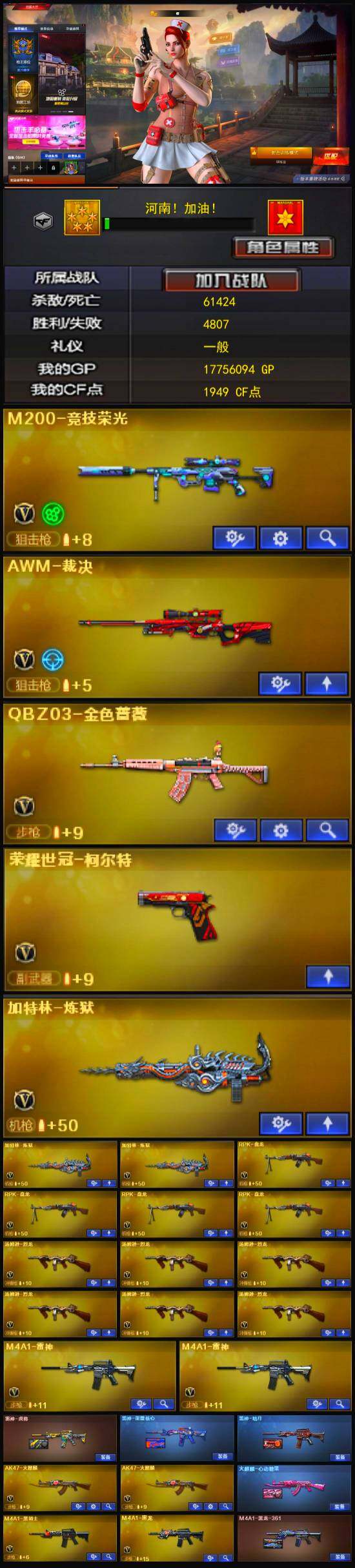 【热门武器】:QBZ03-金色蔷薇,M200-竞技荣光,荣耀世冠-柯尔特,M4A1-黑骑士,汤姆逊-烈龙*6,RPK-盘龙*4,加特林-炼狱*3,沙鹰-修罗*3