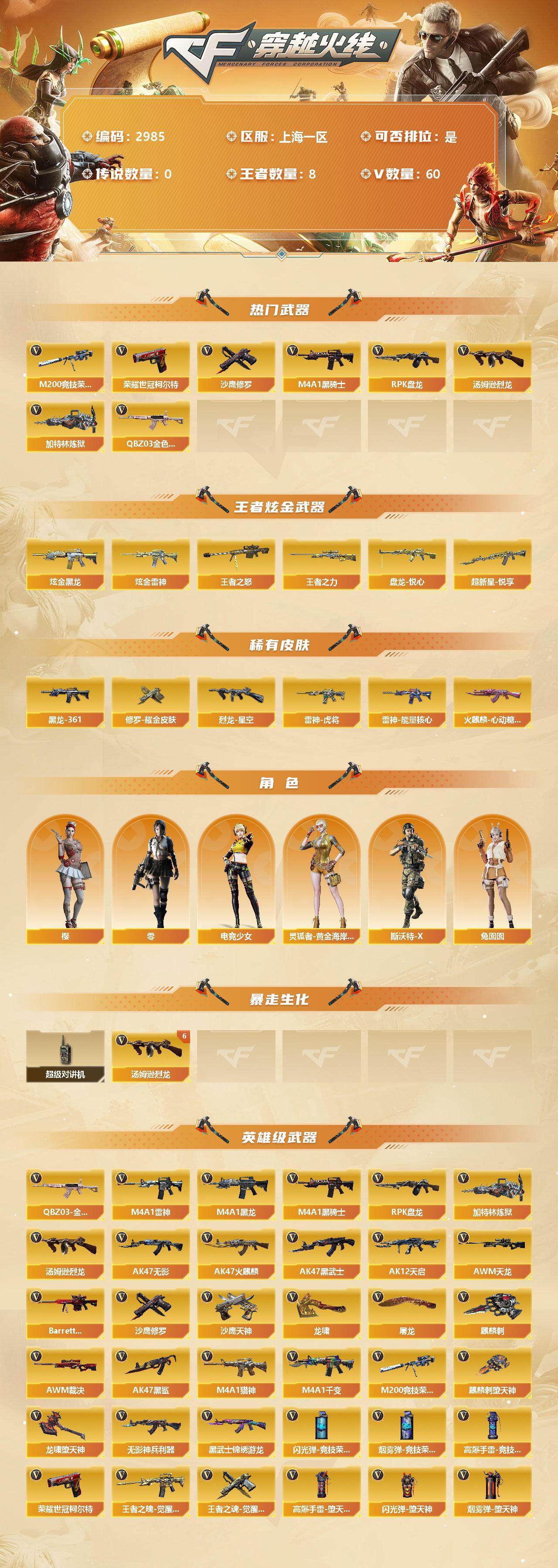 [13337075]上海一区-60V-8王者-2炫金 【热门武器】:QBZ03-金色蔷薇,M200-竞技荣光,荣耀世冠-柯尔特,M4A1-黑骑士,汤姆逊-烈龙*6,RPK-盘龙*4,加特林-炼狱*3,沙鹰-修罗*3 【王者炫金武器】:超新星-悦享*2,王者之怒*2,王者之力,盘龙-悦心,炫金黑龙,炫金雷神 【皮肤】:烈龙-星空,雷神-暗月,雷神-能量核心,雷神-虎将,火麒麟-心动糖果,M4A1-黑龙-361,天启-暗月,修罗耀金皮肤 【角色】:零,樱,电竞少女,灵狐者-黄金海岸,斯沃特-X,兔囡囡 【暴走生化】:超级对讲机 【英雄级武器】:M4A1-千变*2,AK47-火麒麟*2,M4A1-黑龙,M4A1-雷神*2,M4A1-黑骑士,AK47-无影*2,AK47-黑武士,AK12-天启,AK47-黑鲨,无影-神兵利器,黑武士-锦绣游龙,QBZ03-金色蔷薇,M4A1-猎神,王者之魄-觉醒版,AWM-天龙*2,Barrett-极光,AWM-裁决,M200-竞技荣光,RPK-盘龙*4,加特林-炼狱*3,汤姆逊-烈龙*6,沙鹰-修罗*3,沙鹰-天神*2,荣耀世冠-柯尔特,王者之魂-觉醒版,屠龙*2,龙啸,麒麟刺-堕天神,麒麟刺*2,龙啸-堕天神,高爆手雷-堕天神*2,高爆手雷-竞技荣光,闪光弹-堕天神*2,闪光弹-竞技荣光,烟雾弹-堕天神*2,烟雾弹-竞技荣光 【道具】:BS战队炫彩背包,炫彩背包,超级背包,生化弹匣,夺命之镰,防化服,金色流光-枪王排位*2,枪王排位28赛季金色流光,防弹头盔*7,防弹衣*7,C4工具钳*4,手雷包*4 【特殊枪械】:1黑骑士,6烈龙,4盘龙,3炼狱
