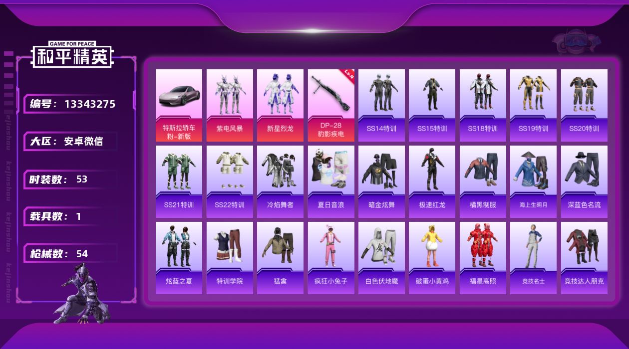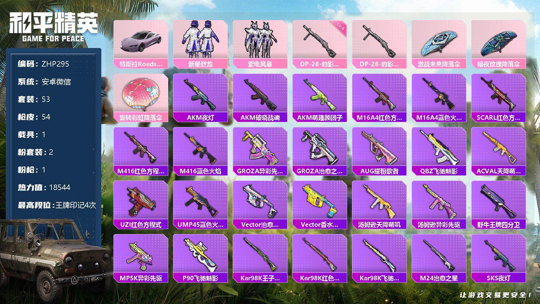 [13343275]安卓 微信-2粉装-1特效枪-1载具-0粉色飞行器-18544热力值-4王牌印记-53套装-54枪皮 【粉色载具】:特斯拉Roadster(沁心粉) 【粉色套装】:粉装-新星烈龙,粉装-紫电风暴 【粉色枪皮等级】:DP-28-豹影疾电(四级) 【粉色枪皮】:DP-28-豹影疾电 【粉色降落伞】:激战未来降落伞,暗夜玫瑰降落伞,旋转彩虹降落伞 【稀有枪皮】:AKM-夜灯,AKM-破晓战魂,AKM-萌趣颜团子,M16A4-红色方程式,M16A4-蓝色火焰,SCAR-L-红色方程式,M416-红色方程式,M416-蓝色火焰,GROZA-异彩先驱,GROZA-治愈之星,AUG-耀粉歌者,QBZ-飞驰魅影,AC-VAL-天降萌叽,UZI-红色方程式,UMP45-蓝色火焰,Vector-治愈之星,Vector-香水柠檬,汤姆逊-天降萌叽,汤姆逊-异彩先驱,野牛-王牌四分卫,MP5K-异彩先驱,P90-飞驰魅影,Kar98K-王子的夏天,Kar98K-红色方程式,Kar98K-飞驰魅影,M24-治愈之星,SKS-夜灯,Mini14-异彩先驱,Mk14-暗星紫秘,Mk14-治愈之星,S686-红色方程式,S1897-飞驰魅影,DBS-荧海星豚,M249-糯团青竹,DP-28-彩虹符号 【其他套装】:套装-SS14特训,套装-SS15特训,套装-SS18特训,套装-SS19特训,套装-SS20特训,套装-SS21特训,套装-SS22特训,套装-冷焰舞者,套装-夏日音浪,套装-暗金炫舞,套装-极速红龙,套装-橘黑制服,套装-海上生明月,套装-深蓝色名流,套装-炫蓝之夏,套装-特训学院,套装-猛禽,套装-疯狂小兔子,套装-白色伏地魔,套装-破蛋小黄鸡,套装-福星高照,套装-竞技名士,套装-竞技达人朋克,套装-缤纷假日,套装-萌趣颜团子,套装-萌黄之夏,套装-蓝色运动,套装-酒红色名流,套装-长空猛禽,套装-青年教官,套装-魅力单车,套装-鹤鸣,套装-麻辣教官,套装-黄色伏地魔,套装-黄色名流,套装-黑色伏地魔,套装-治愈之星,套装-迅捷之星,套装-科技之星,套装-异彩先驱,套装-霓虹极客,套装-极乐追光,套装-炫光向阳,套装-飞驰魅影,套装-音速流光 【营地ID】:769201964