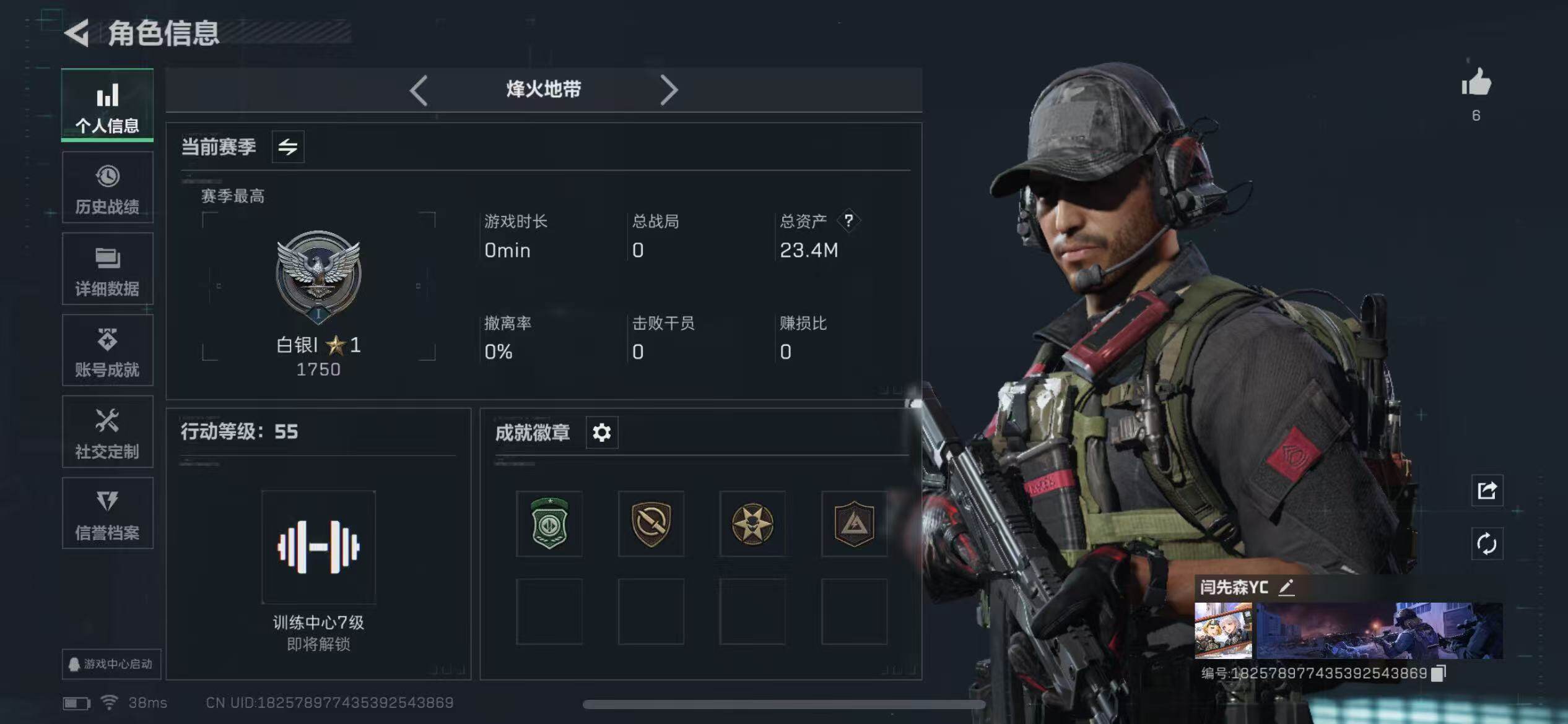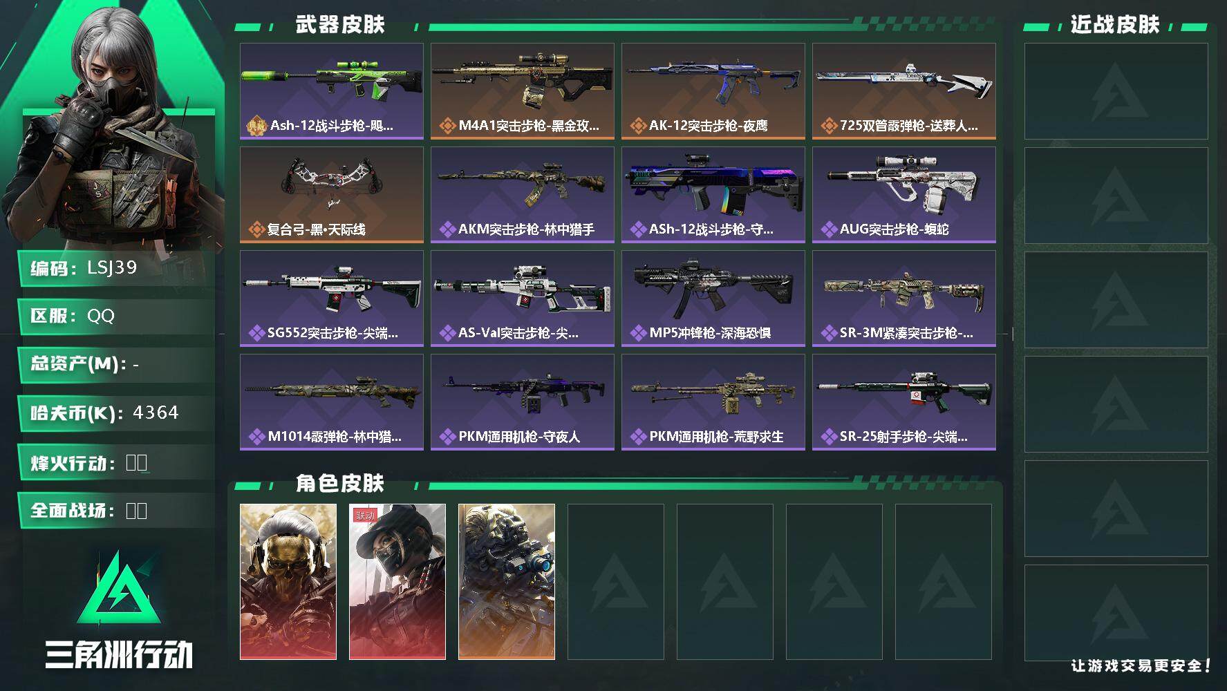 - [11684294]总资产:259.1M 2干员外观 2近战传说 13传说枪械 哈夫币:64.299K 可二次 可修改实名 优质装备:近战-影锋,近战-北极星 烽火地带段位:黑鹰 全面战场段位:无段位 传说武器皮肤:M1014霰弹枪-影锋,AWM狙击步枪-影锋,SMG45冲锋枪-骑士,复合弓-黑-天际线,K437突击步枪-北极星,QCQ171冲锋枪-北极星,725双管霰弹枪-送葬人-无题密令,CAR-15突击步枪-阿米娅,AK-12突击步枪-夜鹰,M4A1突击步枪-阿瑞斯之怒,CAR-15突击步枪-黑鹰坠落 干员外观:红狼-蚀金玫瑰,露娜-黑·天际线