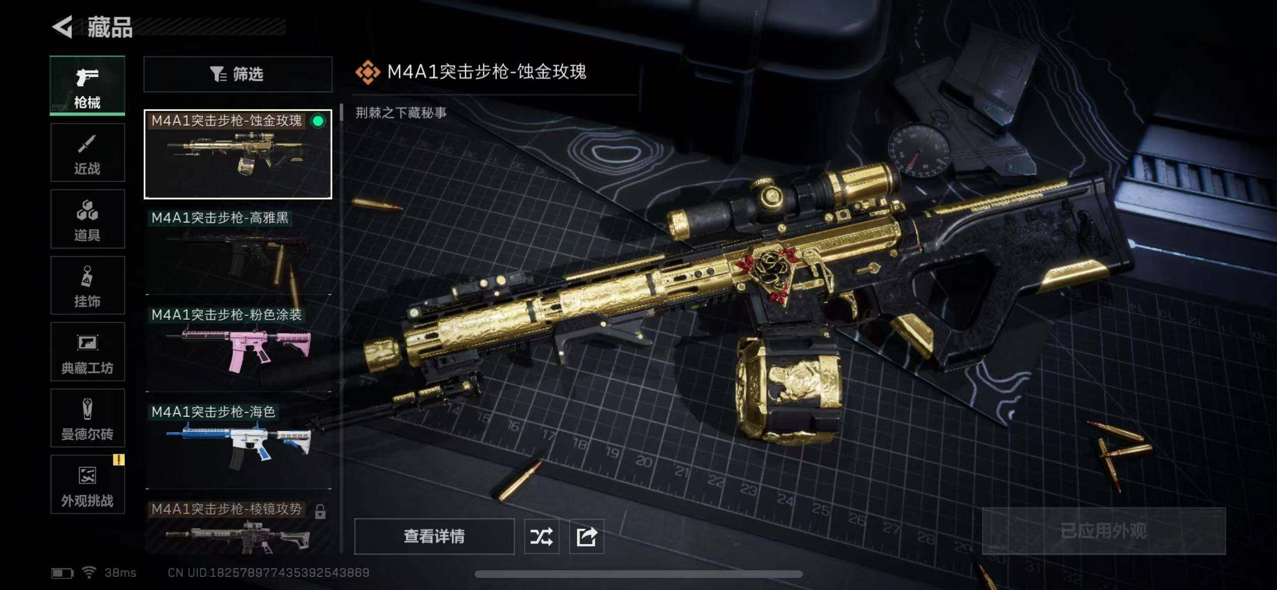【传说级普通外观】:M4A1突击步枪-蚀金玫瑰,AK-12突击步枪-夜鹰,725双管霰弹枪-送葬人-无题密令,复合弓-黑·天际线
