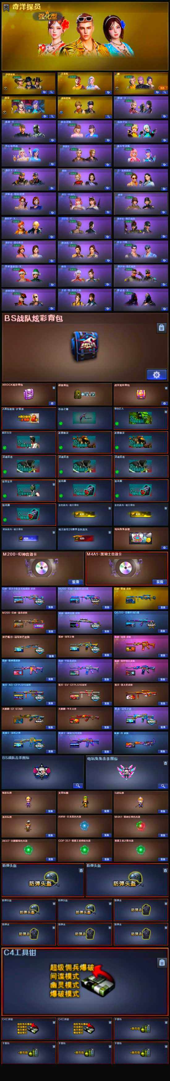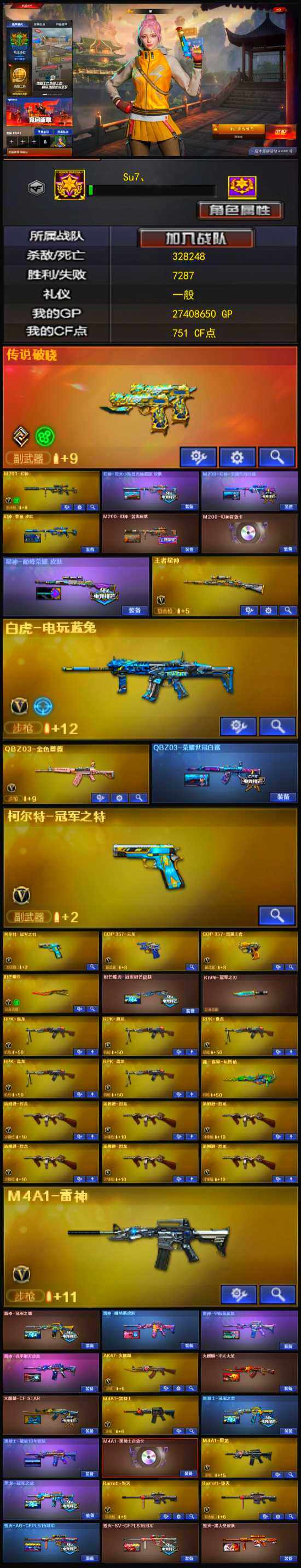 【皮肤】:M200-幻神-黄忠皮肤,M200-幻神-荣耀世冠白鲨,幻神-星火小队签名臻藏版 皮肤,幻神-曹操 皮肤,QBZ03-荣耀世冠白鲨,星神-巅峰荣耀 皮肤,雷神-冠军之魄,雷神-机甲刑天皮肤,雷神-宇航兔皮肤,雷神-维纳斯皮肤,雷神-刘备 皮肤,火麒麟-平天大圣,毁灭-SV-CFPLS16冠军,毁灭-黑大圣皮肤,M4A1-千变-孔明皮肤,黑龙-冠军之武,黑骑士-冠军之势,黑骑士-破浪10年皮肤,超新星-深海萌鲨 皮肤,战神-粉色甜心皮肤,战神-紫绶金章皮肤,战神-流金岁月皮肤,炼狱-月 皮肤,麒麟刺-萌杀皮肤,炽芒蝶刃-冠军炽芒皮肤