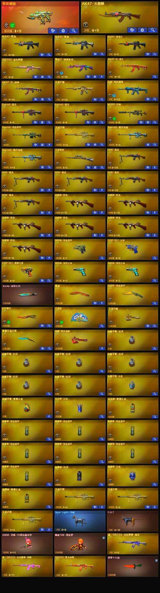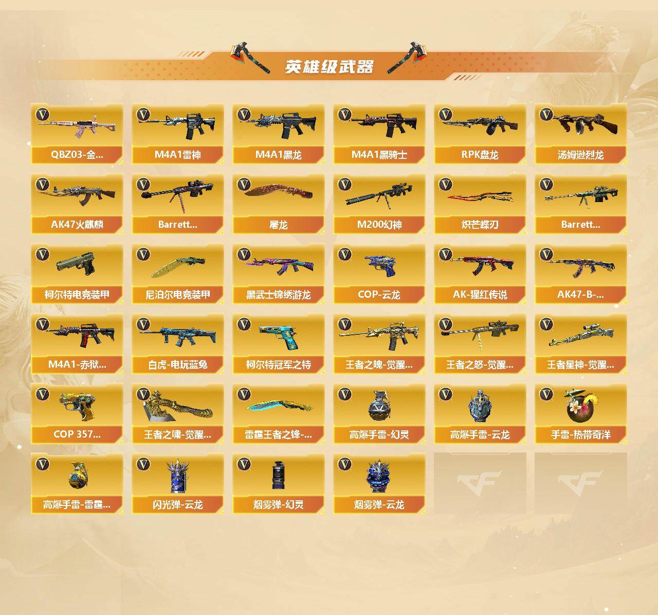 【英雄级武器】:AK47-火麒麟,M4A1-黑龙,M4A1-雷神,M4A1-黑骑士,黑武士-锦绣游龙,QBZ03-金色蔷薇,王者之魄-觉醒版,AK-47-猩红传说*18,AK47-B-战神,白虎-电玩蓝兔,Barrett-毁灭*2,M200-幻神,Barrett-电竞装甲,王者之怒-觉醒版,王者星神-觉醒版,RPK-盘龙*5,汤姆逊-烈龙*6,COP 357-雷霆王者-觉醒版,柯尔特-冠军之特*2,柯尔特-电竞装甲,COP 357-云龙,屠龙,炽芒蝶刃,尼泊尔-电竞装甲,王者之啸-觉醒版,雷霆王者之锋-觉醒版,高爆手雷-幻灵*6,高爆手雷-云龙,手雷-热带