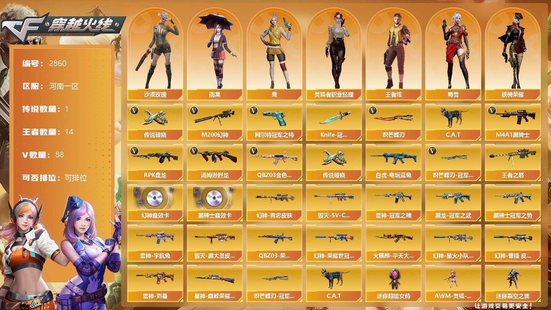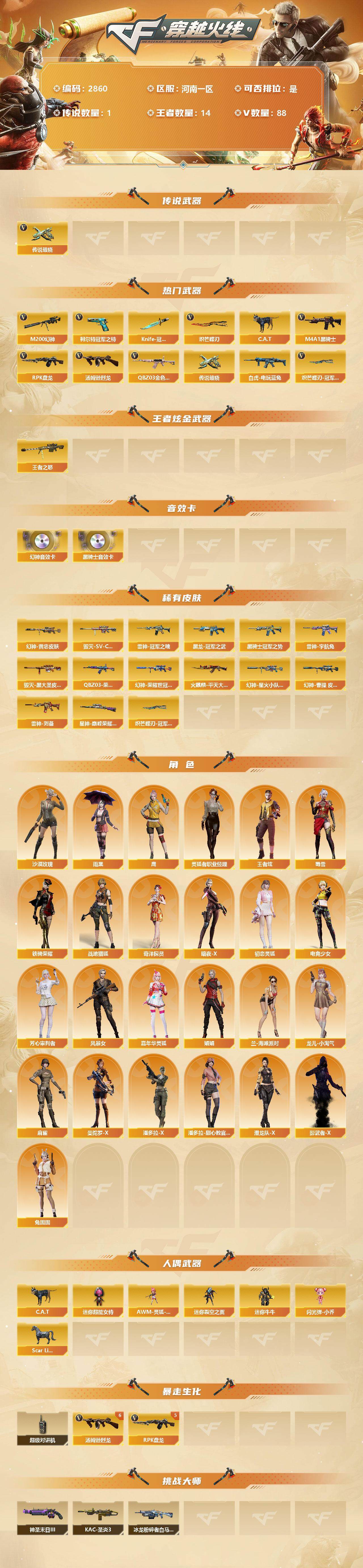 [13324519]河南一区-88V-14王者-0炫金 【传说武器】:传说破晓 【热门武器】:传说破晓,QBZ03-金色蔷薇,M200-幻神,白虎-电玩蓝兔,柯尔特-冠军之特*2,C.A.T,M4A1-黑骑士,汤姆逊-烈龙*6,RPK-盘龙*5,Knife-冠军之刃,炽芒蝶刃,炽芒蝶刃-冠军炽芒皮肤 【王者炫金武器】:王者之怒*3 【音效卡】:M200-幻神音效卡,M4A1-黑骑士音效卡 【皮肤】:M200-幻神-黄忠皮肤,M200-幻神-荣耀世冠白鲨,幻神-星火小队签名臻藏版 皮肤,幻神-曹操 皮肤,QBZ03-荣耀世冠白鲨,星神-巅峰荣耀 皮肤,雷神-冠军之魄,雷神-机甲刑天皮肤,雷神-宇航兔皮肤,雷神-维纳斯皮肤,雷神-刘备 皮肤,火麒麟-平天大圣,毁灭-SV-CFPLS16冠军,毁灭-黑大圣皮肤,M4A1-千变-孔明皮肤,黑龙-冠军之武,黑骑士-冠军之势,黑骑士-破浪10年皮肤,超新星-深海萌鲨 皮肤,战神-粉色甜心皮肤,战神-紫绶金章皮肤,战神-流金岁月皮肤,炼狱-月 皮肤,麒麟刺-萌杀皮肤,炽芒蝶刃-冠军炽芒皮肤 【角色】:沙漠玫瑰,雨棠,鹰,战地猎狐,王者炫,奇洋探员,暗夜-X,初恋灵狐,电竞少女,芳心审判者,风暴女,嘉年华灵狐,娟娟,兰-海滩派对,灵狐者-职业经理,龙儿-小淘气,麻雀,曼陀罗-X,潘多拉-X,潘多拉-甜心教官,潜龙队-X,蜀雪,铁骑荣耀,兔囡囡,影武者-X 【人偶武器】:Scar Light-马枪,AWM-灵狐-15周年嘉年华,C.A.T,迷你裂空之翼,迷你牛牛,闪光弹-小乔,迷你超能女侍 【暴走生化】:超级对讲机 【挑战大师】:冰龙粉碎者-白马银枪,KAC-圣炎切割者III,神圣爆裂者-末日III 【英雄级武器】:AK47-火麒麟,M4A1-黑龙,M4A1-雷神,M4A1-黑骑士,黑武士-锦绣游龙,QBZ03-金色蔷薇,王者之魄-觉醒版,AK-47-猩红传说*18,AK47-B-战神,白虎-电玩蓝兔,Barrett-毁灭*2,M200-幻神,Barrett-电竞装甲,王者之怒-觉醒版,王者星神-觉醒版,RPK-盘龙*5,汤姆逊-烈龙*6,COP 357-雷霆王者-觉醒版,柯尔特-冠军之特*2,柯尔特-电竞装甲,COP 357-云龙,屠龙,炽芒蝶刃,尼泊尔-电竞装甲,王者之啸-觉醒版,雷霆王者之锋-觉醒版,高爆手雷-幻灵*6,高爆手雷-云龙,手雷-热带