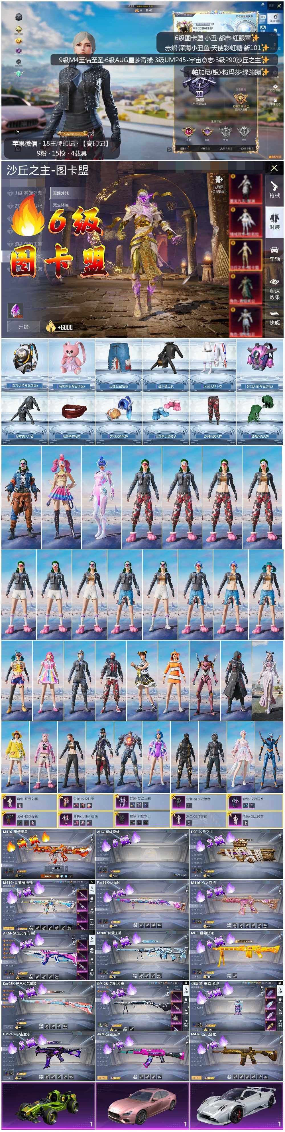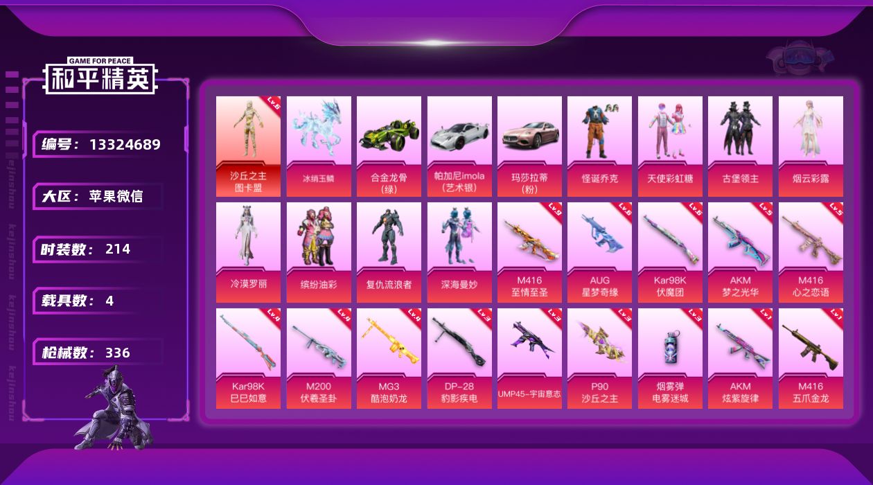 [13324689]素材身法号/沙丘之主-图卡盟(六级)/扭蛋碎片577/璀璨碎片647/M416-至情至圣(九级) 苹果 微信-1神装-9粉装-15特效枪-4载具-8粉色飞行器-12.3w热力值-18王牌印记-214套装-336枪皮【红色神装等级】:沙丘之主-图卡盟(六级)【热门品类】:粉装-怪诞乔克,粉装-梦幻火箭,粉装-缤纷油彩,套装-浪漫天命,套装-赤蝎幽灵,套装-都市猎人,套装-深海小丑鱼,套装-小丑鱼,套装-奇异狩猎者,套装-金羽特工,套装-忍者信条,套装-SS1特训,旭日初心兜帽大衣,套装-龟仙人,套装-潮萌小黄鸭,套装-暗影哥特,套装-浪漫波比,角色-8号机,角色-Mark.06,小丑红鼻头,熔岩游骑兵面罩,熔岩游骑兵连帽夹克【粉色载具】:玛莎拉蒂Ghibli(粉),帕加尼imola(艺术银),合金龙骨(绿),冰绡玉鳞【粉色套装】:粉装-深海曼妙,粉装-怪诞乔克,粉装-天使彩虹糖,粉装-梦幻火箭,粉装-缤纷油彩,粉装-古堡领主,角色-复仇流浪者,角色-烟云彩露,角色-冷漠罗丽【粉色枪皮等级】:AKM-炫紫旋律(一级),AKM-梦之光华(五级),M416-五爪金龙(一级),M416-心之恋语(五级),M416-至情至圣(九级),M416-灵猫魔法师(一级),AUG-星梦奇缘(六级),UMP45-宇宙意志(三级),P90-沙丘之主(三级),Kar98K-伏魔团(六级),Kar98K-巳巳如意(四级),M200-伏羲圣卦(四级),DP-28-豹影疾电(三级),MG3-酷泡奶龙(四级),烟雾弹-电雾迷城(三级)【粉色飞行器】:梦幻火箭飞行器,炫紫旋律飞行器,阿狸红飞行器,沙丘之主天马,龙翔九天飞行器,动力核心飞行器,灵猫魔法师飞行器,灵珠游龙飞行器