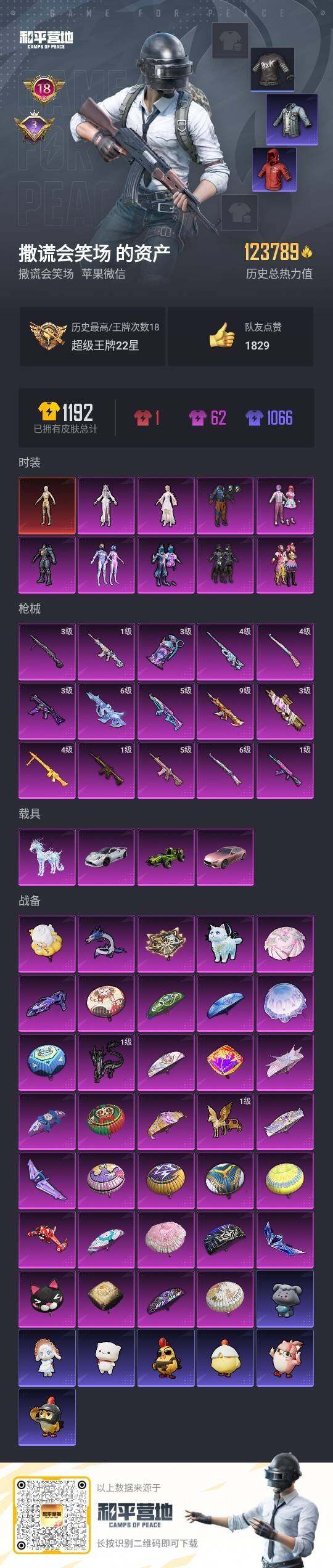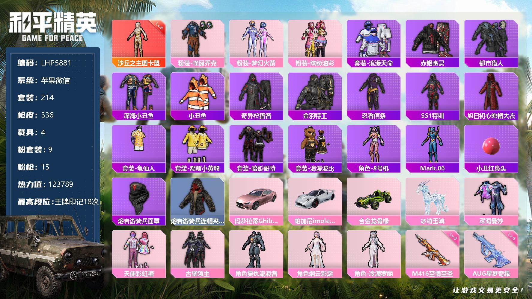 - [12234691]2粉装 6特效枪 5印记 可二次 可修改实名 身法装备:暗影哥特(红眼罩),Mark.06(新蓝螳螂) 优质装备:GROZA-镜光银凌,M762-鬼刀,AUG-暖羊咩咩,MK14-甜梦熊击,Kar98K-巳巳如意 热门装扮:电波星,光极星 稀有枪皮:DP-28-豹影疾电 五级特效枪:五级GROZA-镜光银凌,五级Kar98K-巳巳如意,五级MK14-甜梦熊击,五级M762-鬼刀,五级AUG-暖羊咩咩 四级特效枪:四级DP-28-豹影疾电 紫色装扮:SS30特训套装,SS31特训套装,SS33特训套装,青涩时光,香榭午后,魅力单车,冰河战士,香桃花海,霓虹街区,海岛探路者,暗黑骑手,极地朋克,血色贵族,缤纷果语,特殊使命,特训学院,猎鹰,萝兰蝴蝶,SS29特训,多纳泰罗,星途旅人,雏菊兔兔,热情海星,SS28特训,Mark.06(新蓝螳螂),鱼渊荷华,玉兔迎春,燕燕于飞,巳巳如意,智谋强哥,青团波波,糖糖葫芦,竞技名士,街头风暴,暗影哥特(红眼罩),纯真浪花,SS27特训,浪漫天命,SS26特训,春光漫游,快闪甜心,贝斯之夜,大橘大利,SS32特训服(SS32特训套装),蓝冰羽,紫幽梦,恋语绒绒 优质战备:圣堂之誓降落伞,精灵梦叶罗丽降落伞,星途旅人降落伞,忍者神龟降落伞,千金淑猫降落伞,繁龙极客降落伞,盛世惊鸿降落伞,临安公主降落伞,千面幻镜降落伞