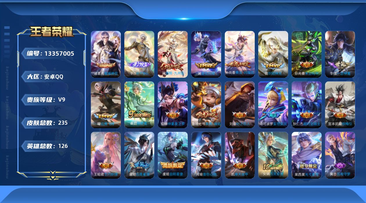[13357005]【店主推荐捡漏号!可直接换绑】安卓Q-V9-至尊星耀I段位-126英雄-235皮肤-1典藏-1无双-19传说-72史诗
