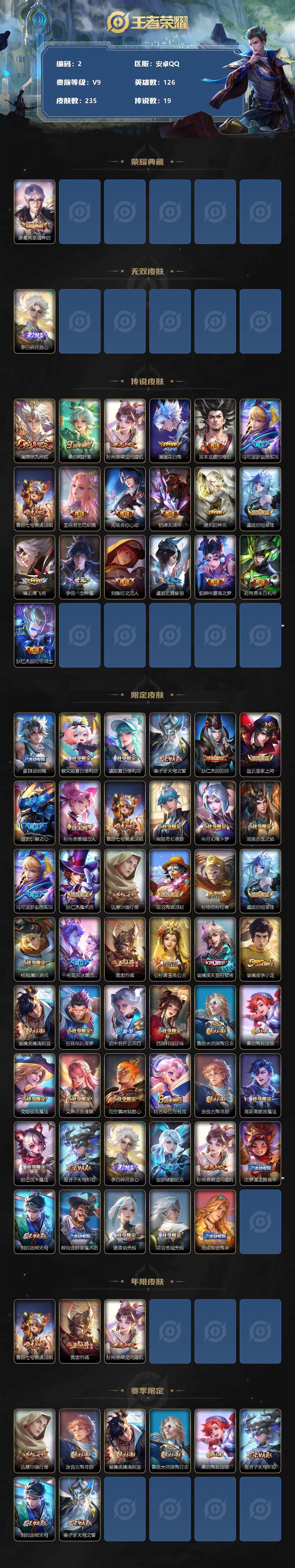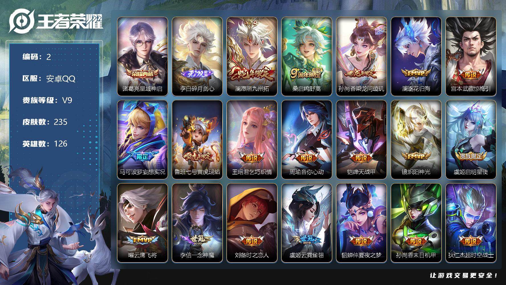 [13357005]【店主推荐捡漏号!可直接换绑】安卓Q-V9-至尊星耀I段位-126英雄-235皮肤-1典藏-1无双-19传说-72史诗 【荣耀典藏】:诸葛亮星域神启 【无双皮肤】:李白碎月剑心 【传说皮肤】:澜愿照九州拓,桑启鸣野蒿,孙尚香乘龙问璇玑,澜逐花归海,宫本武藏惊梅引,马可波罗妄想实况,鲁班七号寅虎瑞焰,王昭君乞巧织情,周瑜音你心动,铠绛天战甲,镜炽阳神光,虞姬启明星使,曜云鹰飞将,李信一念神魔,刘备时之恋人,虞姬云霓雀翎,貂蝉仲夏夜之梦,孙尚香末日机甲,狄仁杰超时空战士 【限定皮肤】:蒙犽顽岩魄,蔡文姬夏日便利店,虞姬夏日便利店,姜子牙天穹之誓,狄仁杰阴阳师,赵云皇家上将,赵云引擎之心,孙尚香蔷薇恋人,鲁班七号寅虎瑞焰,扁鹊奇幻香踪,芈月幻夜卜梦,周瑜赤莲之焰,马可波罗妄想实况,狄仁杰魔术师,达摩沙漠行僧,项羽海滩派对,孙悟空孙行者,虞姬启明星使,杨戬潮玩骑兵,干将莫邪冰霜恋舞曲,黄忠烈魂,公孙离玉兔公主,裴擒虎天狼狩猎者,裴擒虎李小龙,裴擒虎擒涛扼浪,狂铁电玩高手,云中君纤云弄巧,西施玲珑珍味,鲁班大师探海日志,桑启海盐诗旅,戈娅驭风魔法,艾琳流音漫舞,司空震地狱燃心,阿古朵江河有灵,张良古海寻踪,高渐离燃音魔法,妲己灵卜魔法,鬼谷子天穹祈灯,李白碎月剑心,伽罗琥珀纪元,孙尚香乘龙问璇玑,沈梦溪龙舞盛年,刘邦剑破天穹,程咬金群星魔术团,镜青焰无极,项羽苍威无极,周瑜熔金海岸 【年限皮肤】:鲁班七号寅虎瑞焰,黄忠烈魂,孙尚香乘龙问璇玑 【赛季限定】:达摩沙漠行僧,张良古海寻踪,裴擒虎擒涛扼浪,鲁班大师探海日志,桑启海盐诗旅,鬼谷子天穹祈灯,刘邦剑破天穹,姜子牙天穹之誓 【战令限定】:蔡文姬夏日便利店,虞姬夏日便利店,扁鹊奇幻香踪,芈月幻夜卜梦,周瑜赤莲之焰,艾琳流音漫舞,杨戬潮玩骑兵,狂铁电玩高手,西施玲珑珍味,司空震地狱燃心,戈娅驭风魔法,高渐离燃音魔法,妲己灵卜魔法,镜青焰无极,项羽苍威无极 【史诗皮肤】:鲁班七号电玩小子,项羽苍穹之光,露娜紫霞仙子,阿轲暗夜猫娘,赵云皇家上将,赵云未来纪元,貂蝉圣诞恋歌,甄姬冰雪圆舞曲,王昭君偶像歌手,狄仁杰魔术师,宫本武藏鬼剑武藏,孙尚香蔷薇恋人,孙尚香水果甜心,嬴政暗夜贵公子,嬴政摇滚巨星,妲己女仆咖啡,墨子金属风暴,吕布圣诞狂欢,曹操幽灵船长,吕布末日机甲,张飞乱世虎臣,赵云引擎之心,花木兰水晶猎龙者,刘邦德古拉伯爵,夏侯