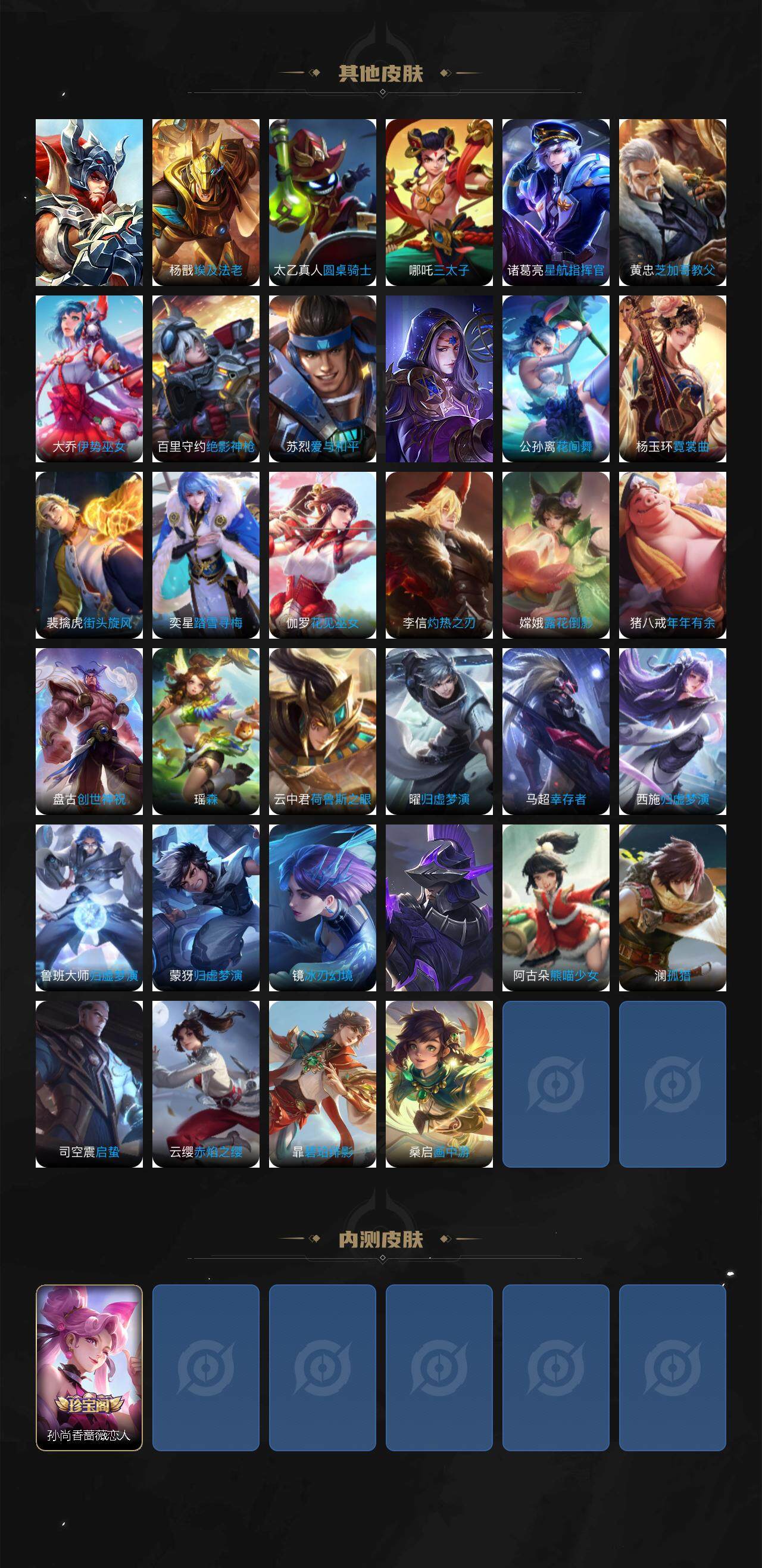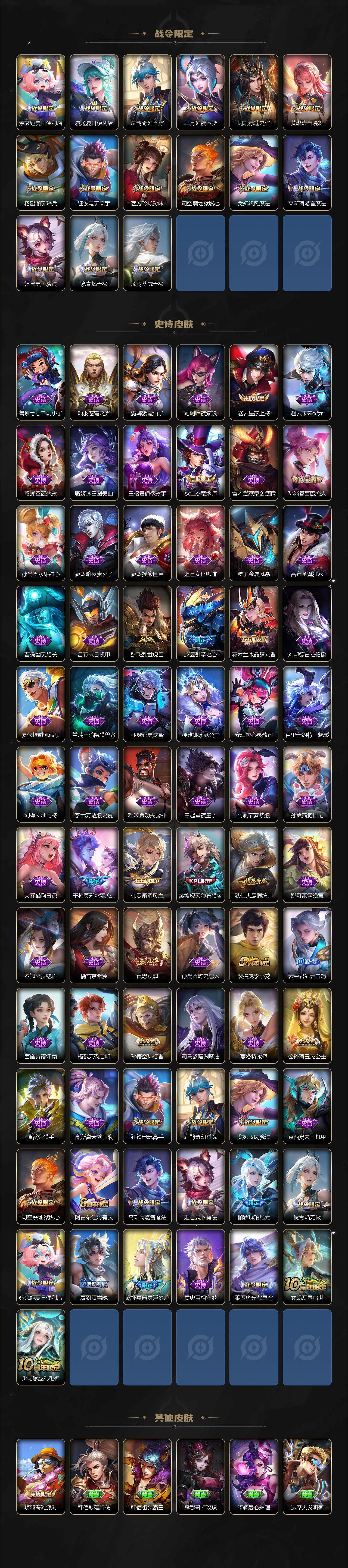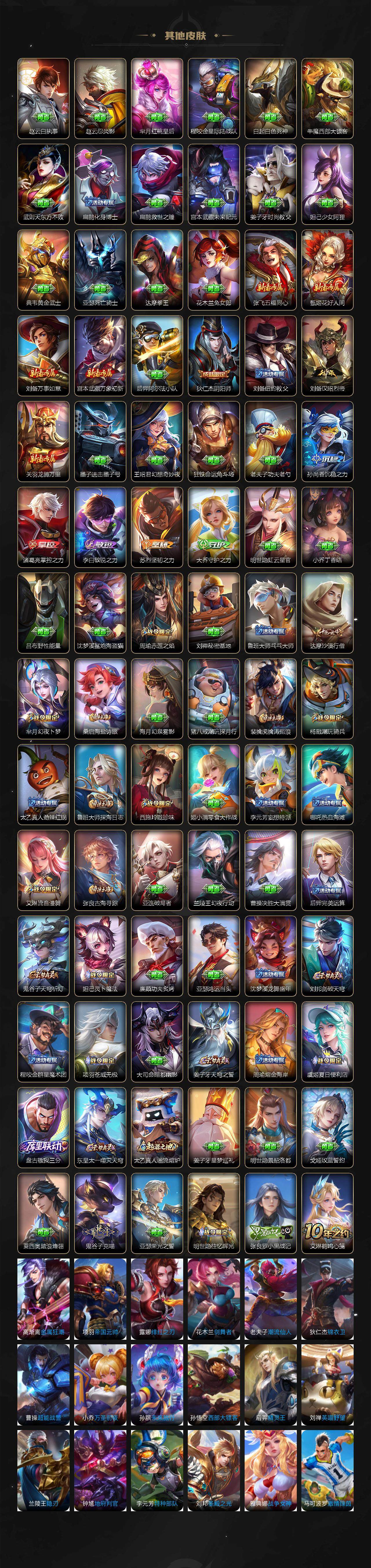 【限定皮肤】:蒙犽顽岩魄,蔡文姬夏日便利店,虞姬夏日便利店,姜子牙天穹之誓,狄仁杰阴阳师,赵云皇家上将,赵云引擎之心,孙尚香蔷薇恋人,鲁班七号寅虎瑞焰,扁鹊奇幻香踪,芈月幻夜卜梦,周瑜赤莲之焰,马可波罗妄想实况,狄仁杰魔术师,达摩沙漠行僧,项羽海滩派对,孙悟空孙行者,虞姬启明星使,杨戬潮玩骑兵,干将莫邪冰霜恋舞曲,黄忠烈魂,公孙离玉兔公主,裴擒虎天狼狩猎者,裴擒虎李小龙,裴擒虎擒涛扼浪,狂铁电玩高手,云中君纤云弄巧,西施玲珑珍味,鲁班大师探海日志,桑启海盐诗旅,戈娅驭风魔法,艾琳流音漫舞,司空震地狱燃心,阿古朵江河有灵,张良古海寻踪,高渐离燃音魔法,妲己灵卜魔法,鬼谷子天穹祈灯,李白碎月剑心,伽罗琥珀纪元,孙尚香乘龙问璇玑,沈梦溪龙舞盛年,刘邦剑破天穹,程咬金群星魔术团,镜青焰无极,项羽苍威无极,周瑜熔金海岸