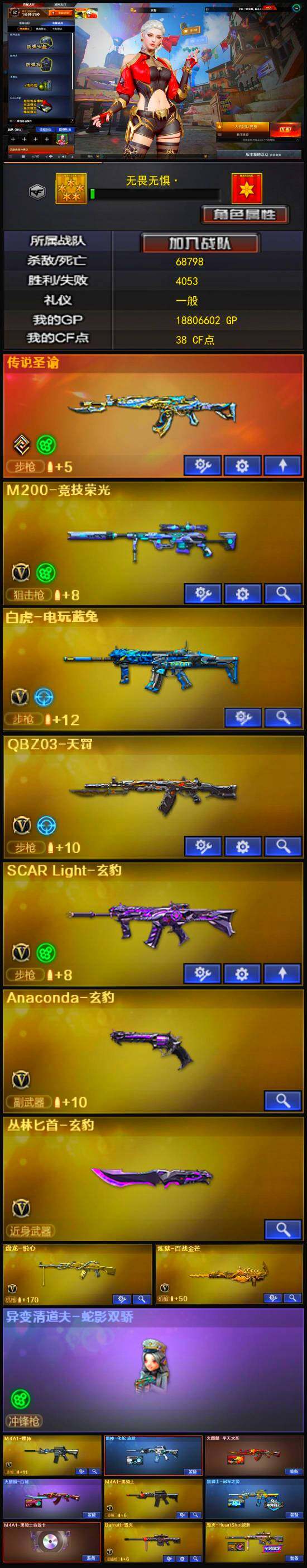 - [10090076]【商品标题】:四川一区-31V-1王者-2炫金 【热门武器】:QBZ03-金色蔷薇,M4A1-青龙,死亡之眼,白虎-电玩蓝兔,M4A1-黑骑士,沙鹰-修罗 【王者炫金武器】:炫金天龙,炫金千变 【音效卡】:屠龙-云海游龙音效卡,Barrett-毁灭音效卡,QBZ03-金色蔷薇音效卡 【稀有皮肤】:雷神-星空,火麒麟-平天大圣*2,火麒麟-百城,火麒麟-心动糖果,黑骑士-摸金校尉,毁灭-黑大圣皮肤,M200-庆典-CFS 2021 【角色】:零,魅影 【人偶武器】:天龙-曼陀罗,AWM-灵狐-15周年嘉年华,COP-旗袍,迷你超能女侍 【暴走生化】:死亡之眼,超级对讲机 【英雄级武器】:QBZ03-金色蔷薇,M4A1-青龙,白虎-电玩蓝兔,无影-神兵利器,M4A1-雷神,M4A1-黑龙,M4A1-黑骑士,AK47-无影,AK47-火麒麟*2,AWM-天龙,Barrett-毁灭,M4A1-猎神,黑骑士-海王,AK-47-猩红传说,AK47-B-常胜将军,沙鹰-天神*2,沙鹰-修罗,麒麟刺*2,擎天,龙啸,屠龙 【特殊枪械】:0白虎,1黑骑士,0烈龙,0盘龙,0炼狱,0蝴蝶斯泰尔