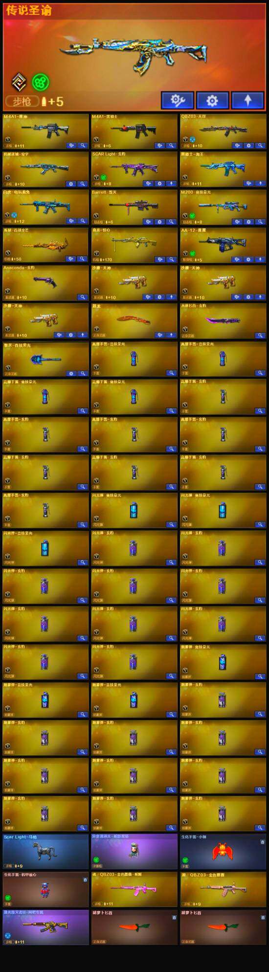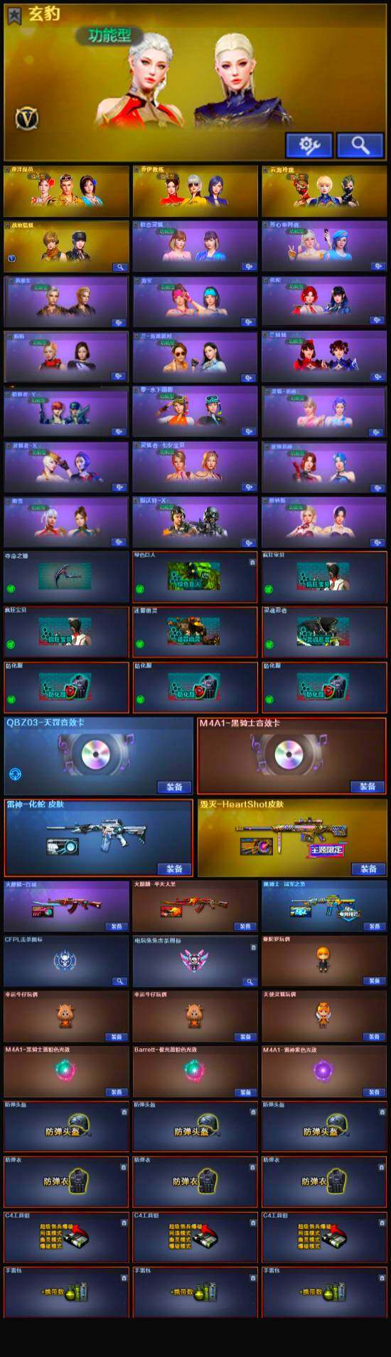 【英雄级武器】:M4A1-雷神,M4A1-黑骑士,QBZ03-天罚,SCAR Light-玄豹,黑骑士-海王,白虎-电玩蓝兔,Barrett-毁灭,M200-竞技荣光,炼狱-百战金芒,盘龙-悦心-觉醒版,AA-12-雷霆,沙鹰-天神*3,屠龙,擎天-竞技荣光,麒麟刺-百战金芒,丛林匕首-玄豹,高爆手雷-竞技荣光*4,高爆手雷-玄豹*8,闪光弹-竞技荣光*3,闪光弹-玄豹*10,烟雾弹-竞技荣光*3,烟雾弹-玄豹*10,M4A1-赤狱骑士,AWM-昌龙,Barrett-碧霄极光