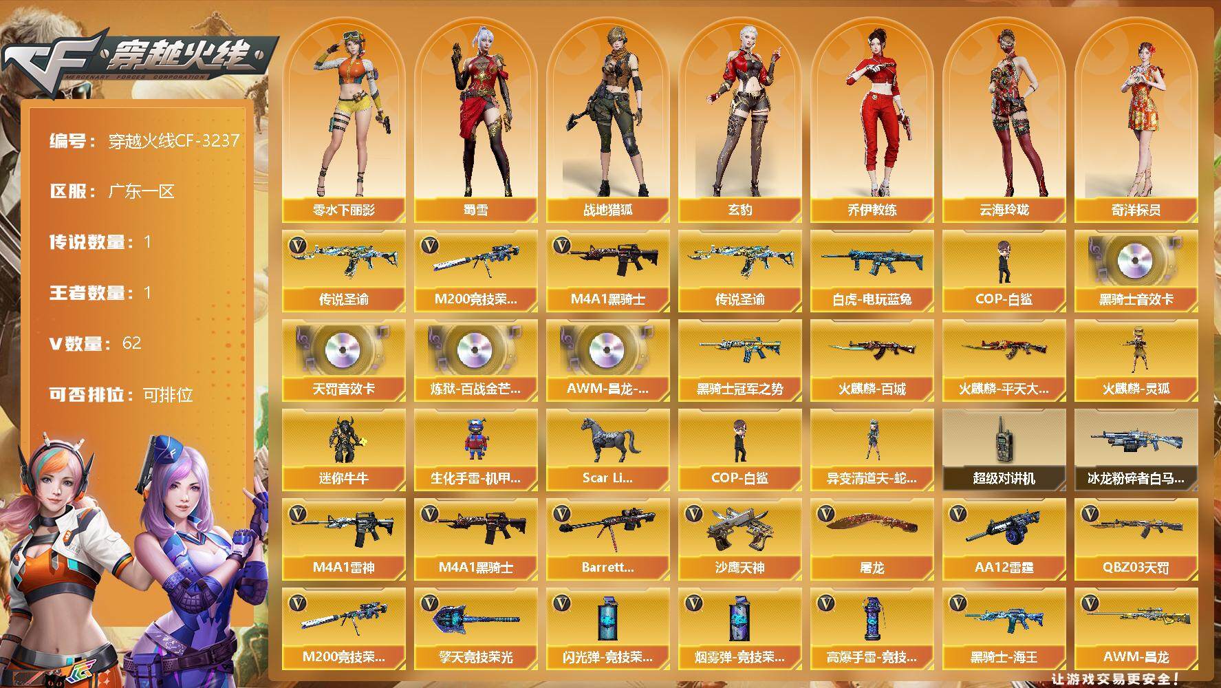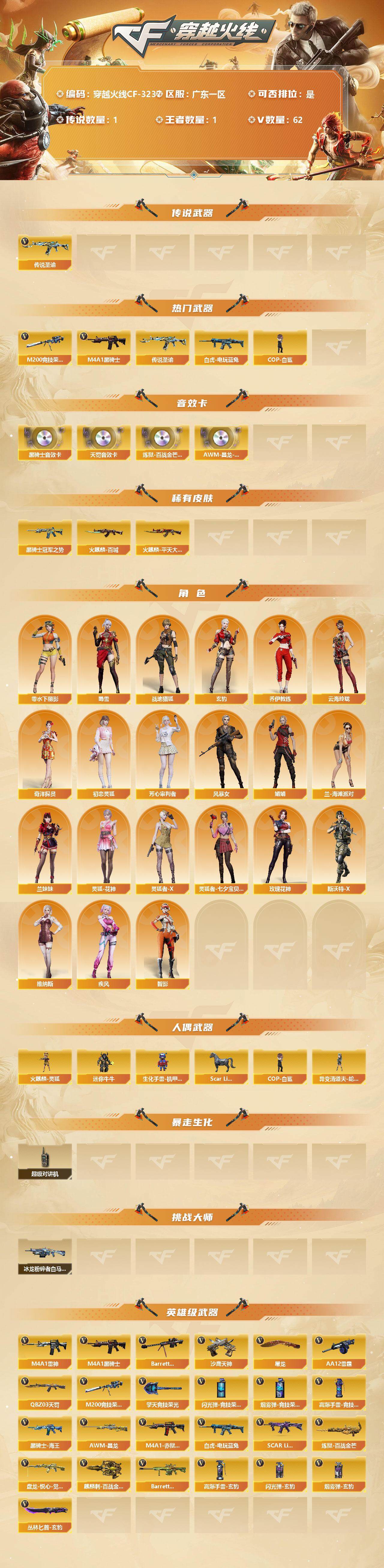 [13370205]广东一区-62V-1王者-0炫金 【传说武器】:传说圣谕 【热门武器】:传说圣谕,M200-竞技荣光,白虎-电玩蓝兔,M4A1-黑骑士,COP-白鲨 【音效卡】:M4A1-黑骑士音效卡,QBZ03-天罚音效卡,炼狱-百战金芒-庆典舞曲音效卡,AWM-昌龙-怀旧音效卡 【皮肤】:雷神-化蛇 皮肤,M4A1-再燃火线,火麒麟-雷神,火麒麟-平天大圣,火麒麟-百城,黑骑士-冠军之势,黑武士-典韦皮肤,轻型军用手斧-再燃火线 【角色】:玄豹,战地猎狐,奇洋探员,乔伊教练,云海玲珑,初恋灵狐,芳心审判者,风暴女,疾风,娟娟,兰-海滩派对,兰妹妹,零-水下丽影,灵狐-花神,灵狐者-X,灵狐者-七夕宝贝,玫瑰花神,斯沃特-X,蜀雪,维纳斯,智影 【人偶武器】:COP-白鲨,火麒麟-灵狐,异变清道夫-蛇影双骄,Scar Light-马枪,迷你牛牛,生化手雷-机甲核心 【暴走生化】:超级对讲机 【挑战大师】:冰龙粉碎者-白马银枪 【英雄级武器】:M4A1-雷神,M4A1-黑骑士,QBZ03-天罚,SCAR Light-玄豹,黑骑士-海王,白虎-电玩蓝兔,Barrett-毁灭,M200-竞技荣光,炼狱-百战金芒,盘龙-悦心-觉醒版,AA-12-雷霆,沙鹰-天神*3,屠龙,擎天-竞技荣光,麒麟刺-百战金芒,丛林匕首-玄豹,高爆手雷-竞技荣光*4,高爆手雷-玄豹*8,闪光弹-竞技荣光*3,闪光弹-玄豹*10,烟雾弹-竞技荣光*3,烟雾弹-玄豹*10,M4A1-赤狱骑士,AWM-昌龙,Barrett-碧霄极光 【道具】:云山科技背包,亚洲杯纪念炫彩背包,炫彩背包-诺拉,百战金芒炫彩背包,背包-洛丽塔,黑桃战神背包,女皇终结者-魔龙之吻,救世主-黑桃战神,黄金生化钩,绿色巨人,灵魂忍者,迷雾幽灵,夺命之镰,防化服*3,流光-再燃火线,枪王排位29赛季金色流光,语音特效-盛典烟火,萌萌小葵表情,C4-红龙,C4-再燃火线,防弹头盔*3,防弹衣*3,C4工具钳*3,手雷包*3 【特殊枪械】:1黑骑士
