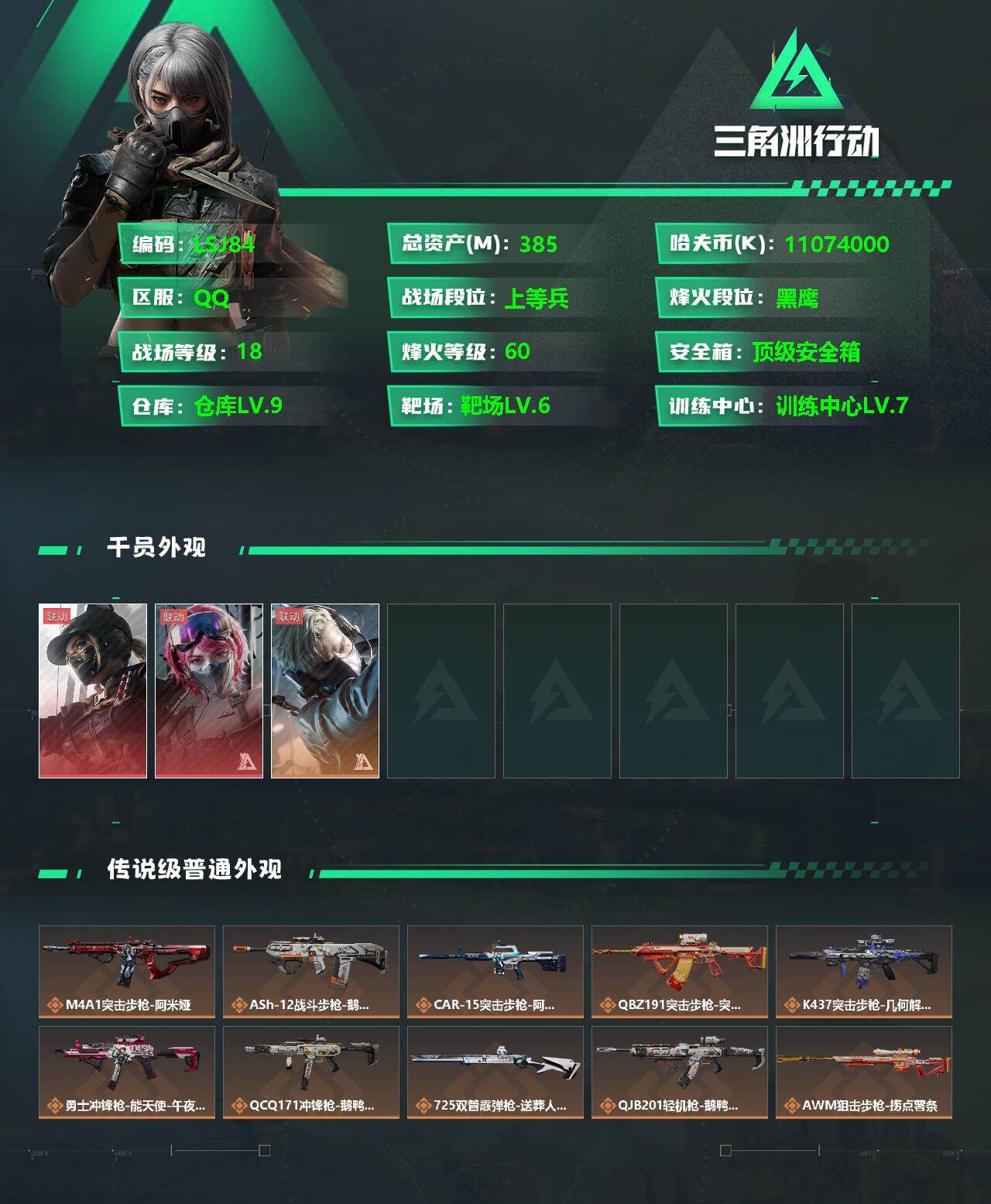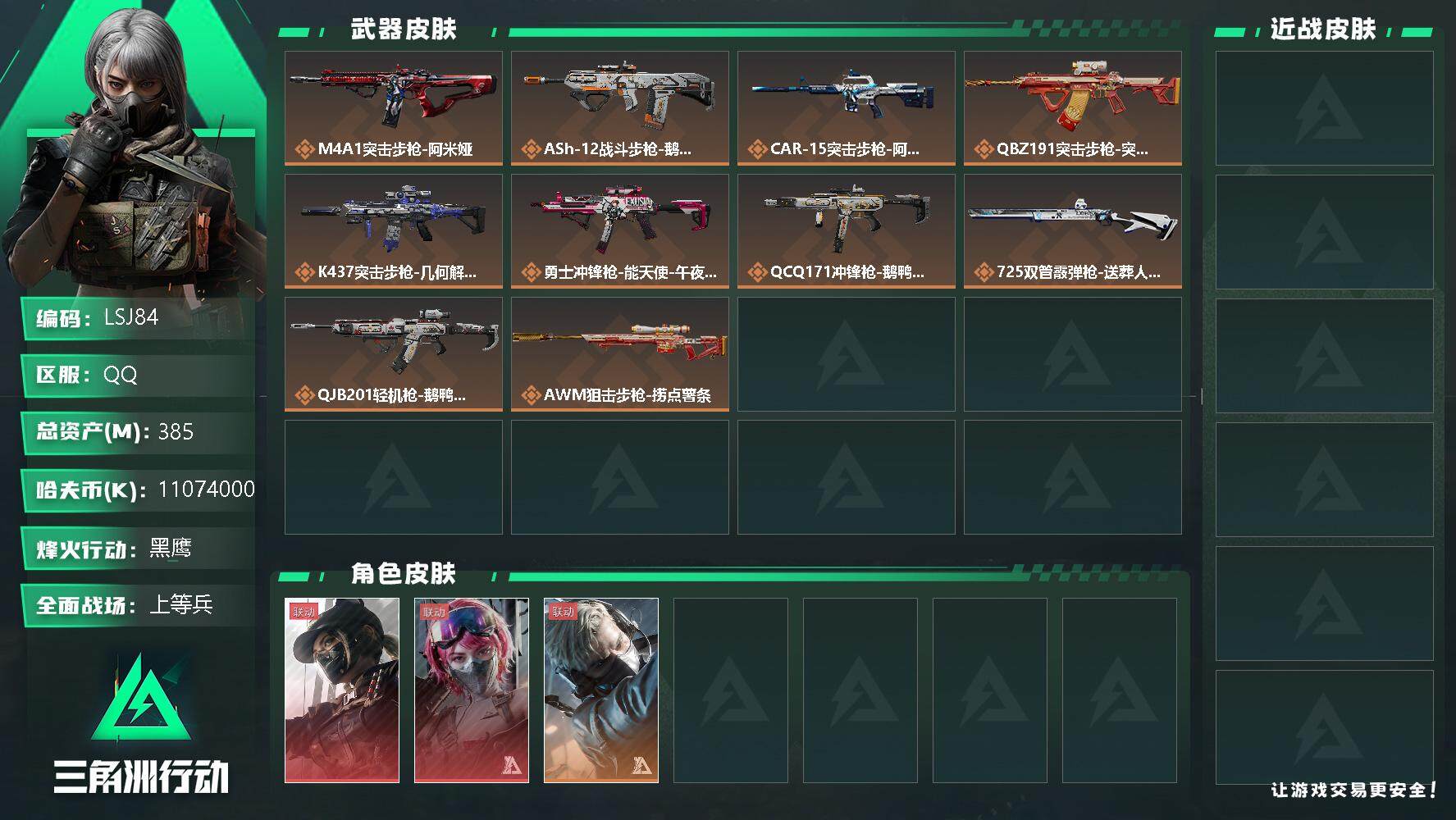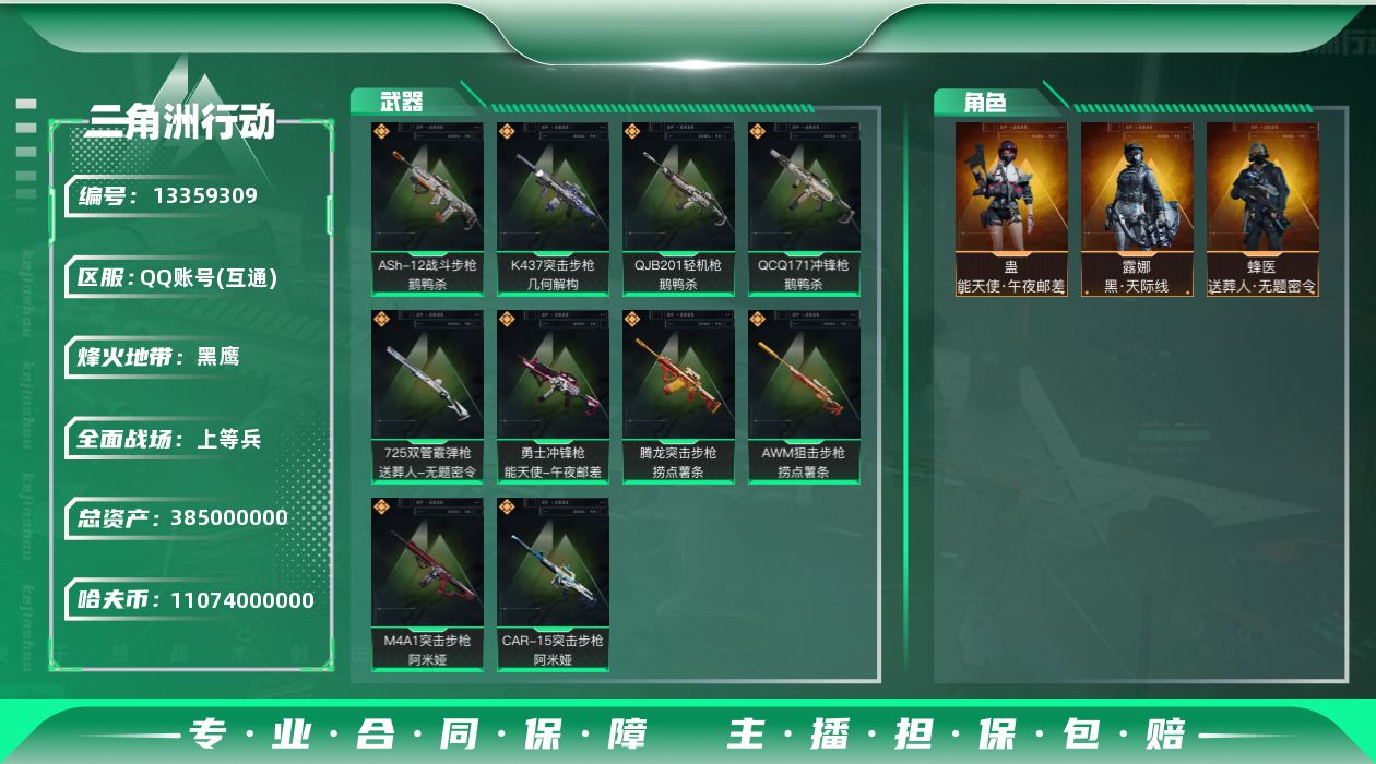 [13359309]【店主推荐捡漏号!可直接换绑】总资产385m 流动资产322m 哈夫币11074000 【干员外观】:露娜-黑·天际线,蛊-能天使午夜邮差,蜂医-送葬人·无题密令 【热门藏品】:非洲之心 【传说级普通外观】:腾龙突击步枪-捞点薯条,ASh-12战斗步枪-鹅鸭杀,AWM狙击步枪-捞点薯条,CAR-15突击步枪-阿米娅,M4A1突击步枪-阿米娅,K437突击步枪-几何解构,勇士冲锋枪-能天使-午夜邮差,QJB201轻机枪-鹅鸭杀,QCQ171冲锋枪-鹅鸭杀,725双管霰弹枪-送葬人-无题密令