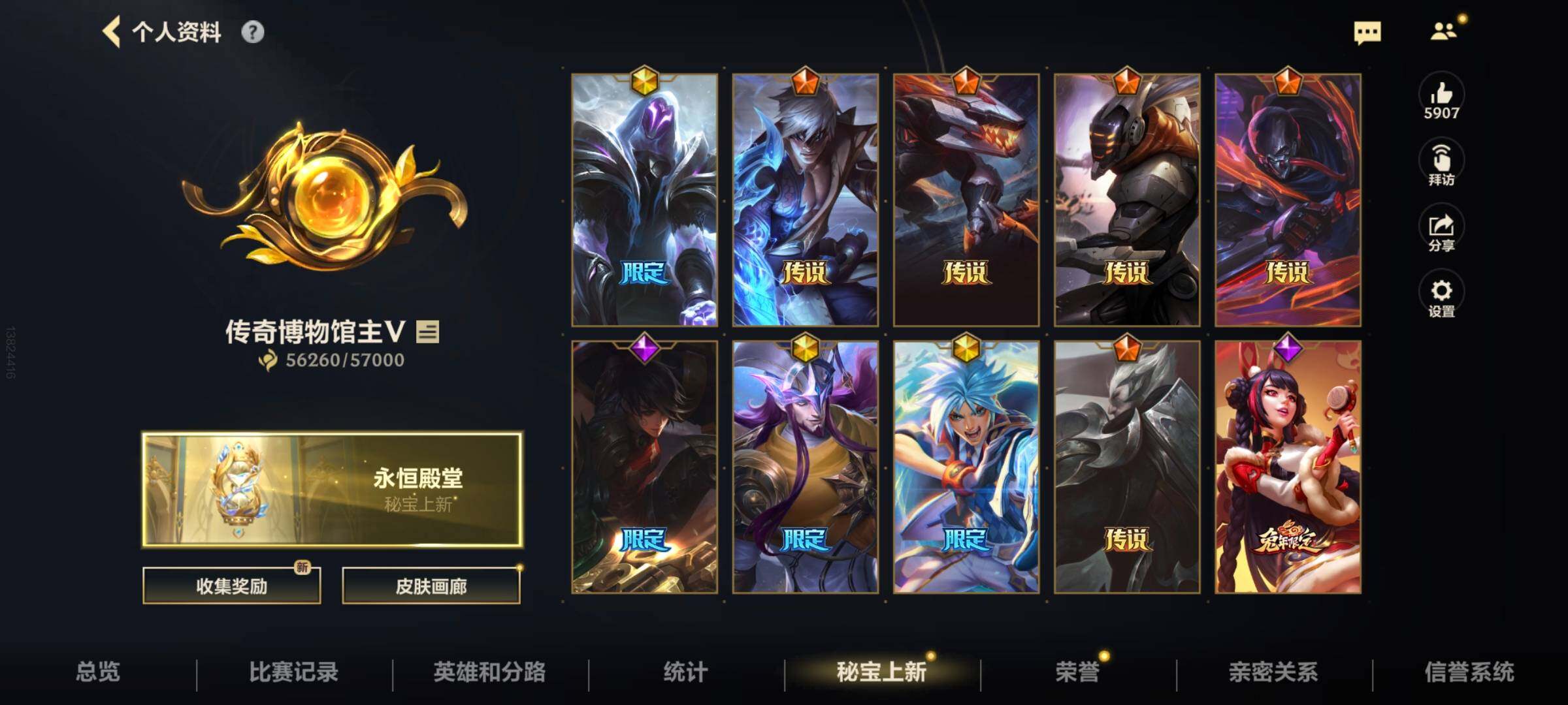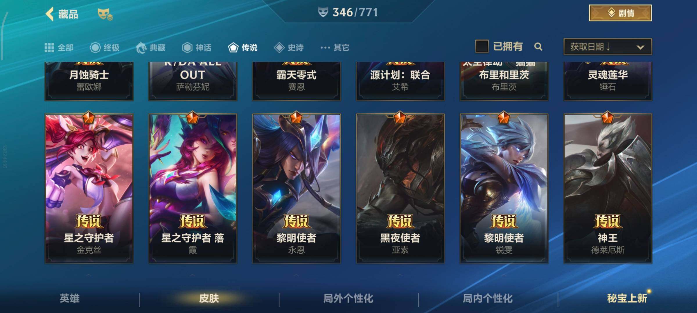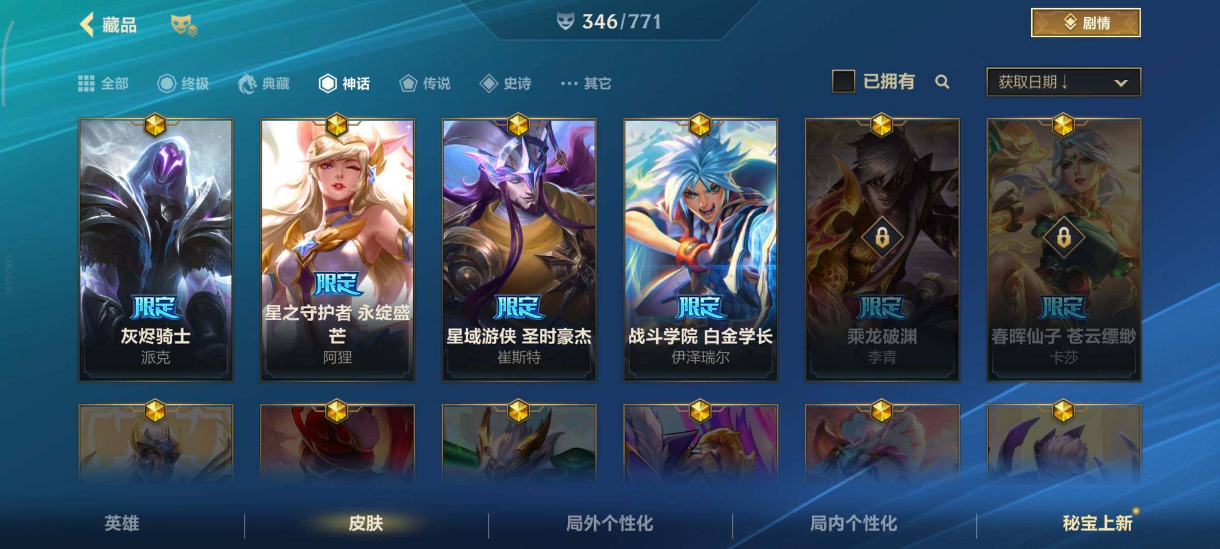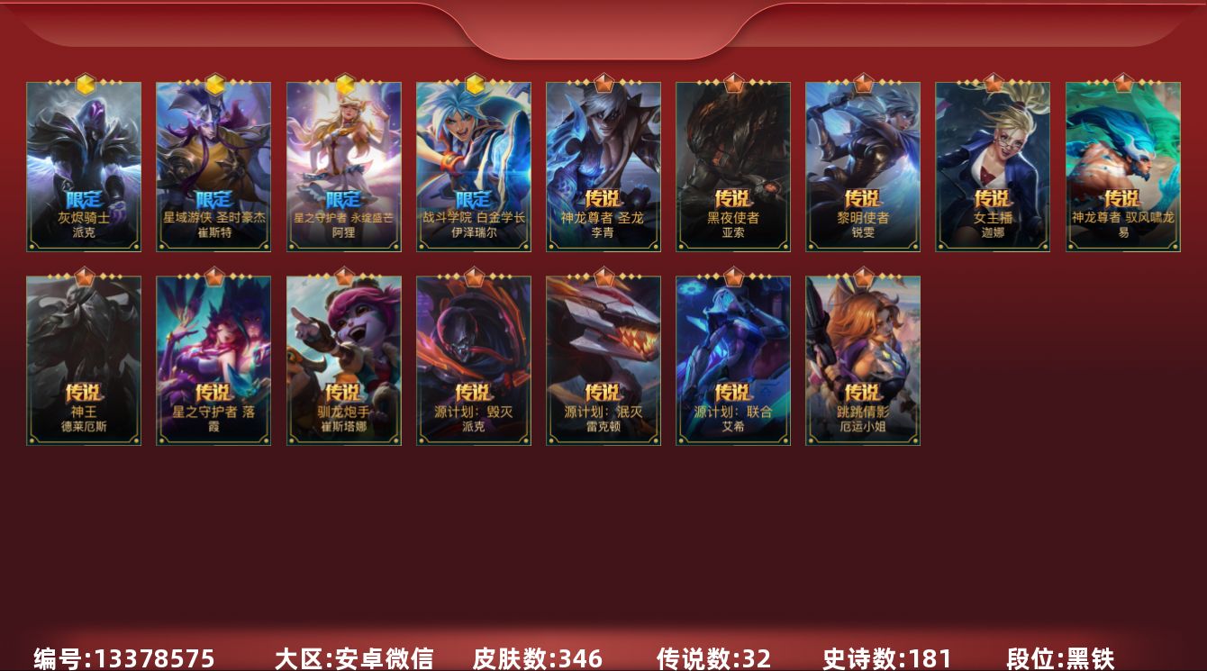 [13378575]有二次!5.6w收藏!346皮肤4神话32传说181史诗!灰烬骑士派克-星守阿狸-星域游侠卡牌-学院白金-张辽吕布-满源计划